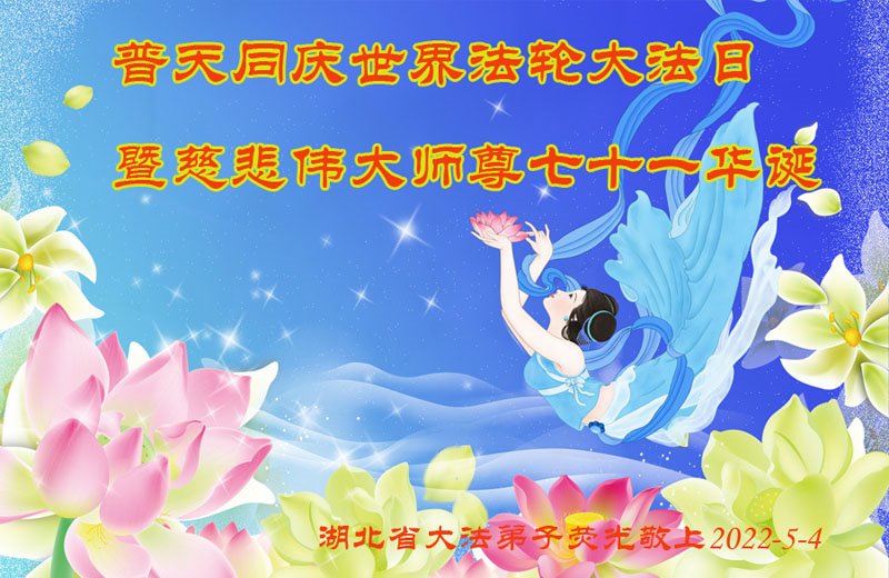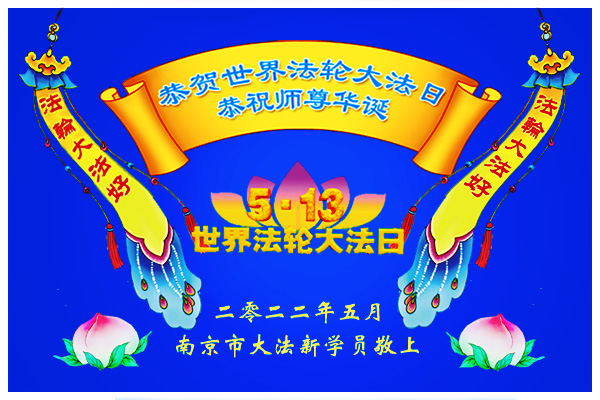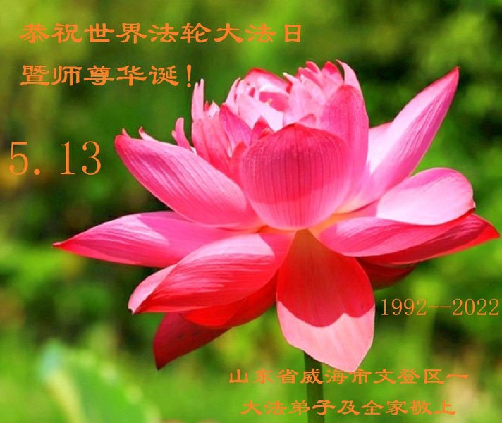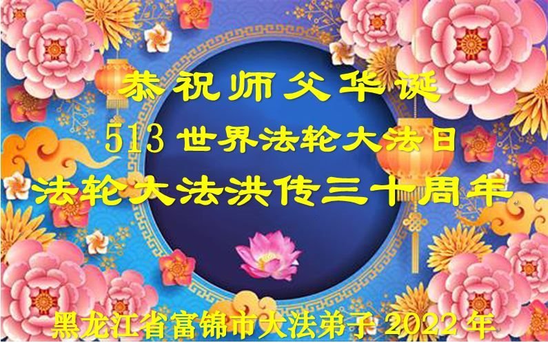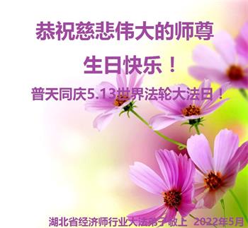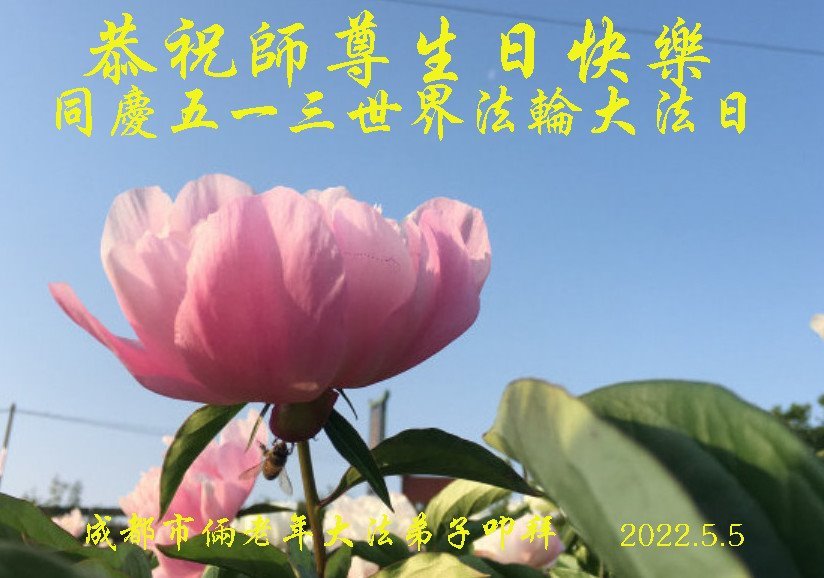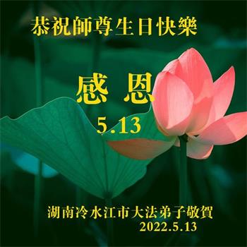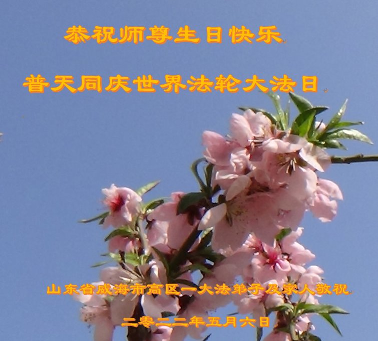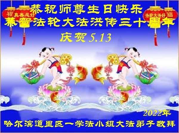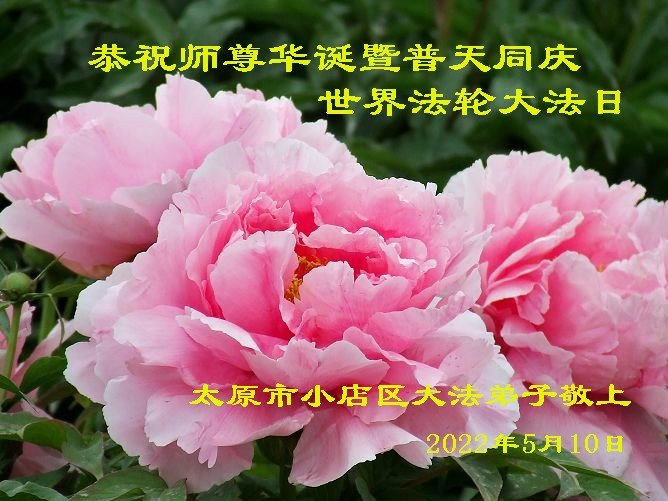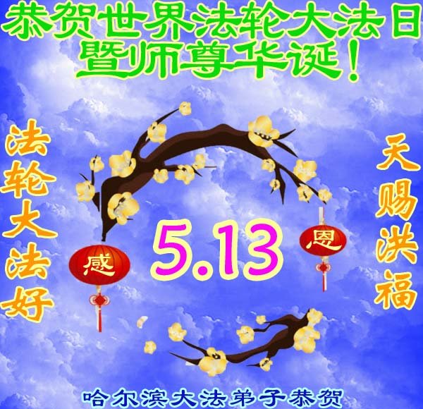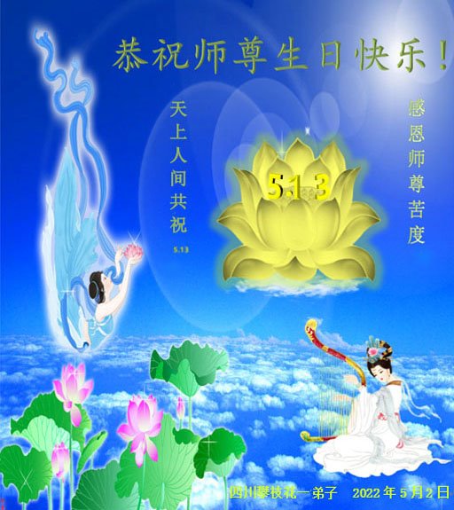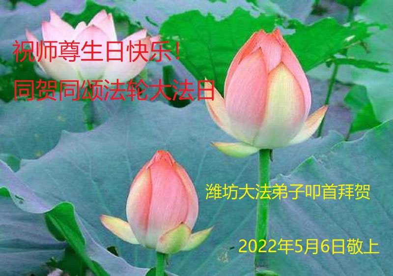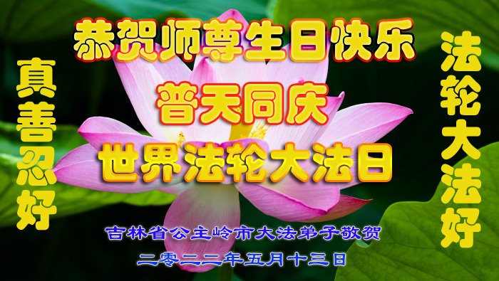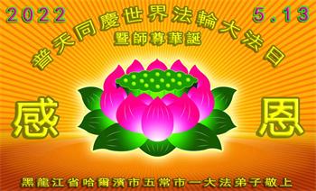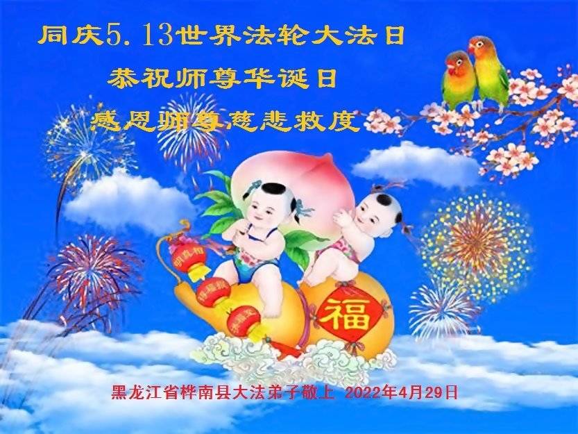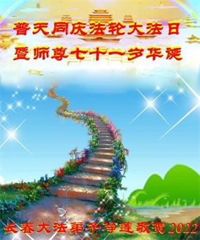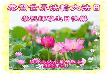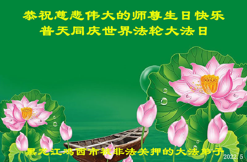 二零二二年五月十三日世界法轮大法日即将到来,我们有缘走上了修炼大法的路,师尊给每个大法弟子净化身体,教诲我们用真善忍标准要求自己。我们感恩师尊!弟子多学法,做事多为别人着想,遇事向内找。做好三件事,多救度有缘的众生。精進、再精進,完成史前大愿。