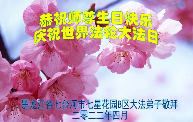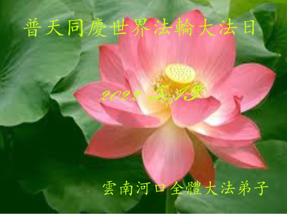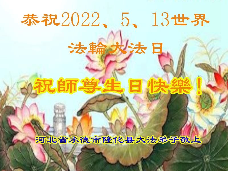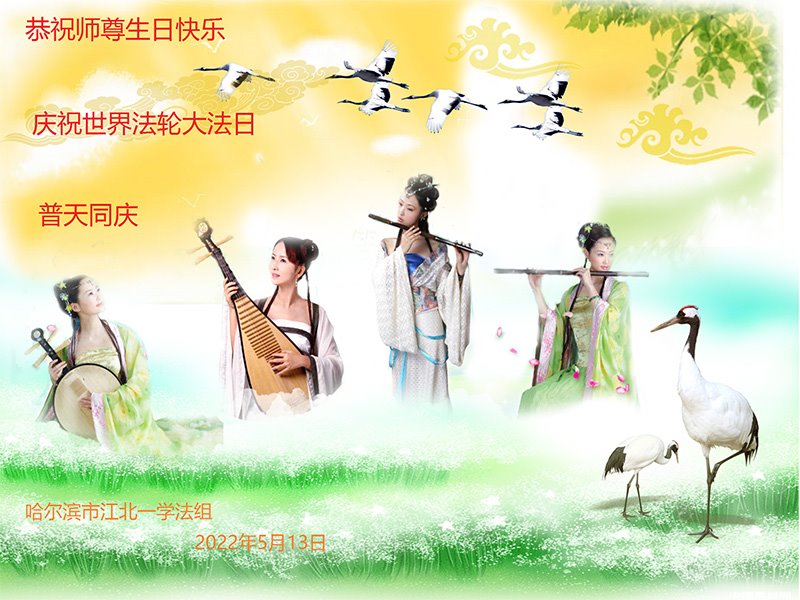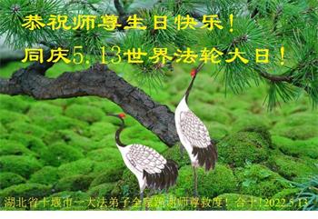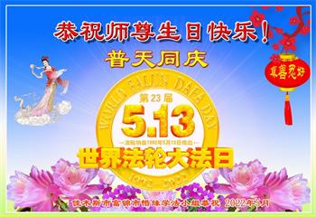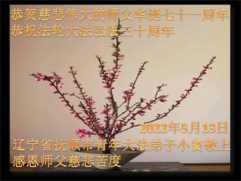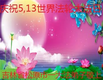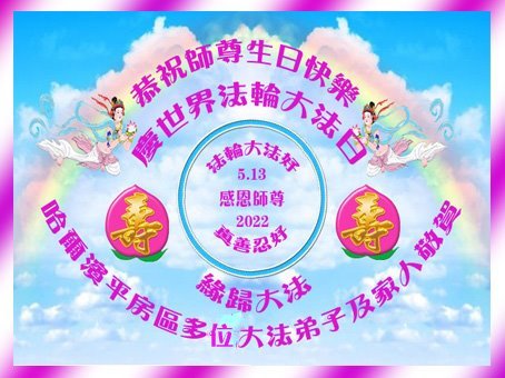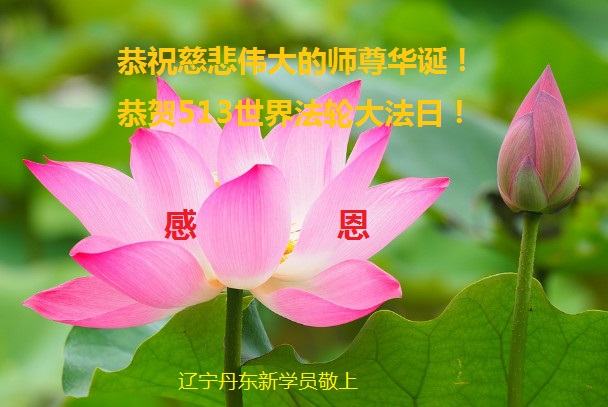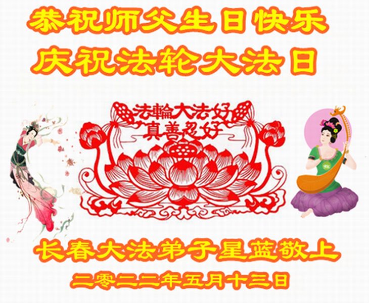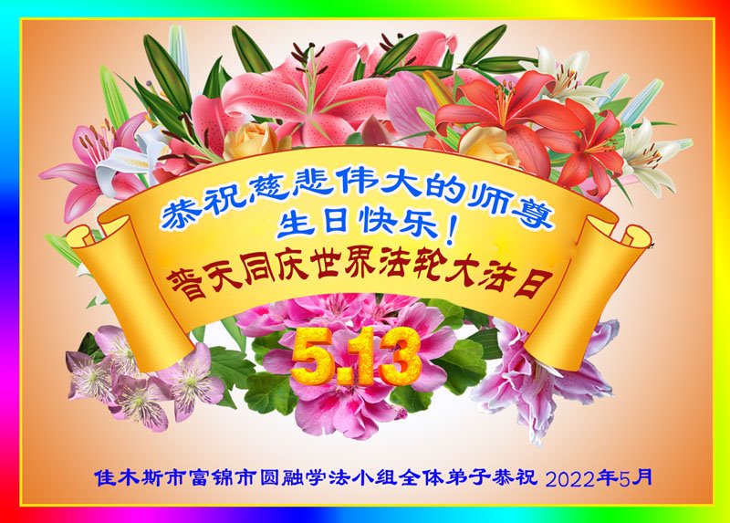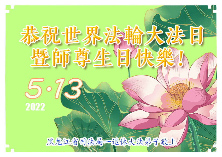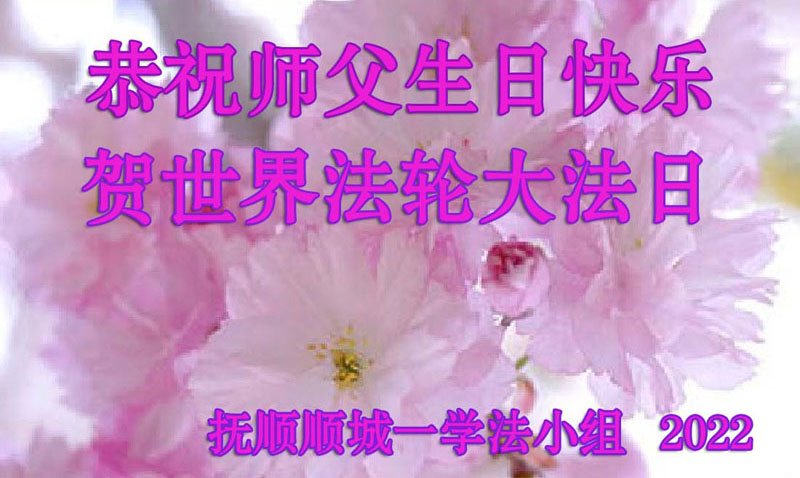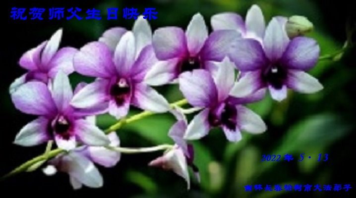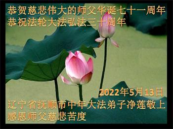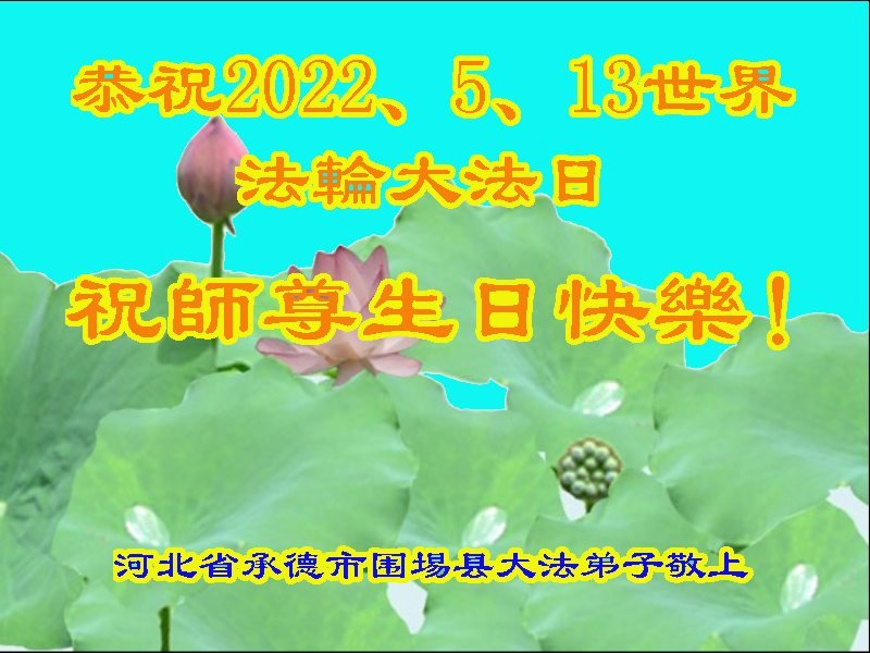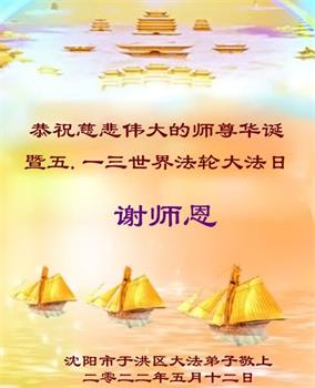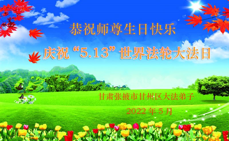 二零二二年五月十三日世界法轮大法日即将到来,我们有缘走上了修炼大法的路,师尊给每个大法弟子净化身体,教诲我们用真善忍标准要求自己。我们感恩师尊!弟子多学法,做事多为别人着想,遇事向内找。做好三件事,多救度有缘的众生。精進、再精進,完成史前大愿。