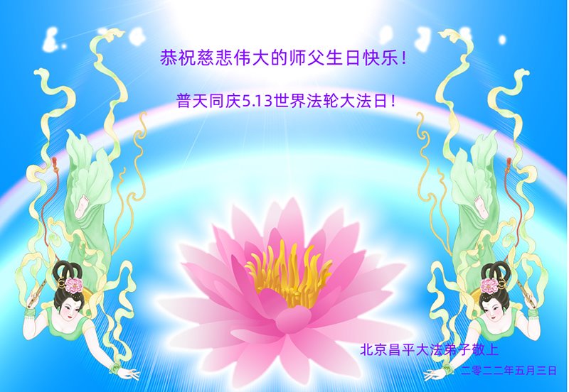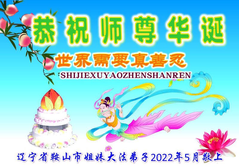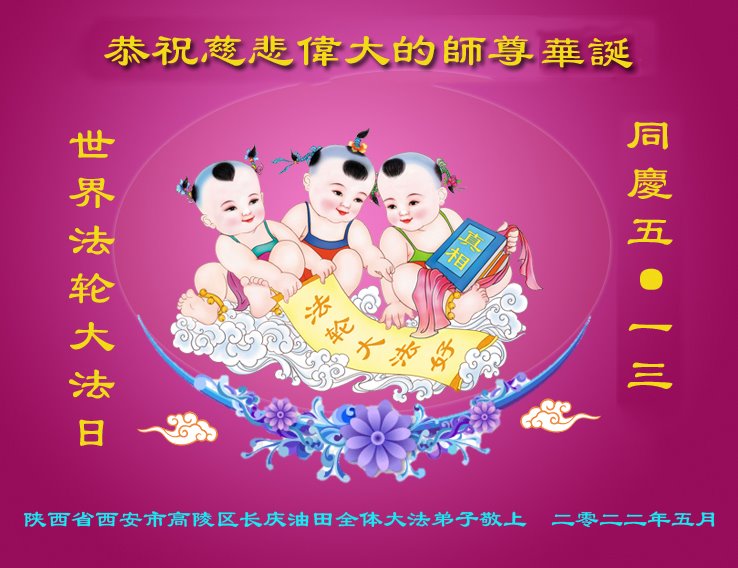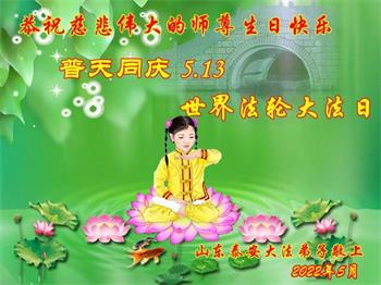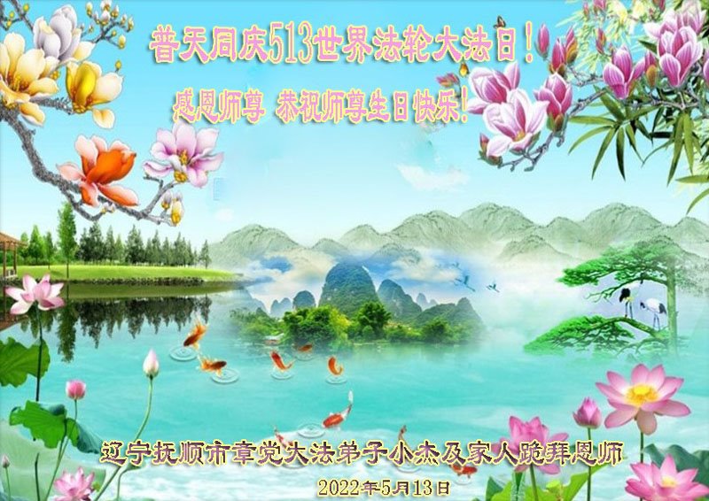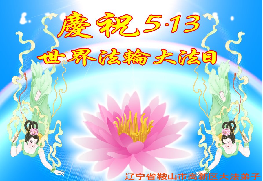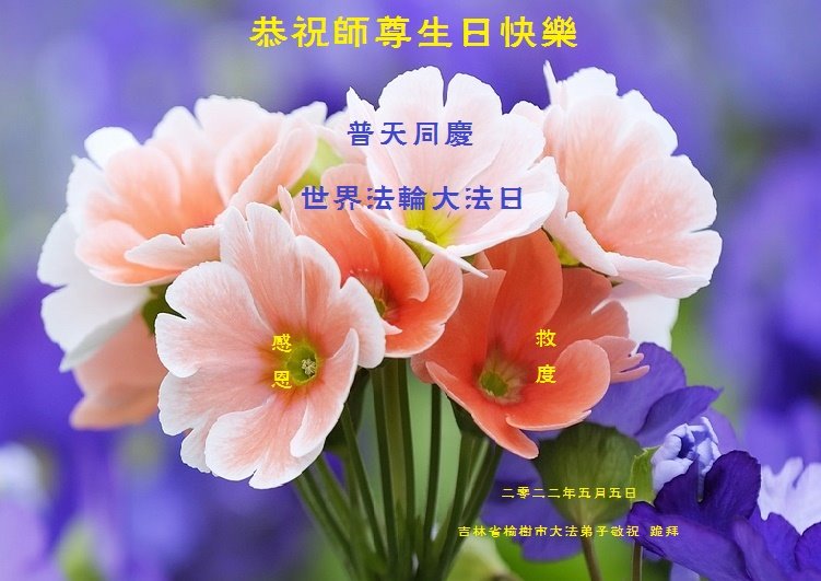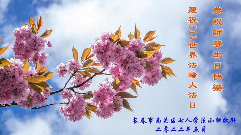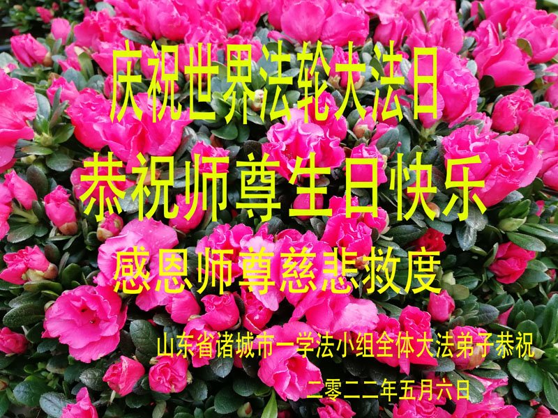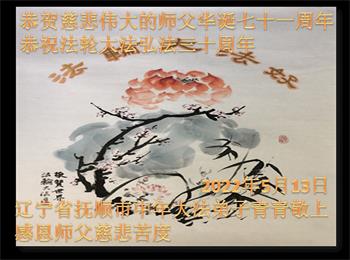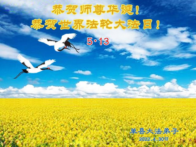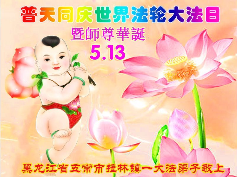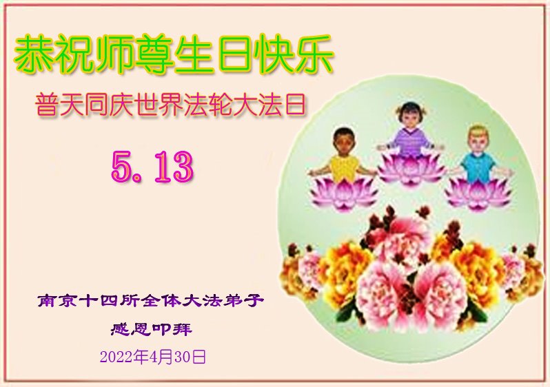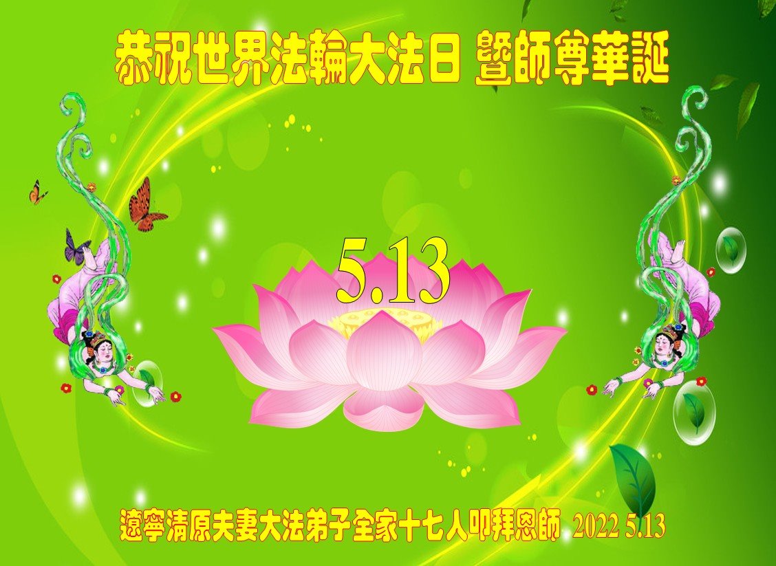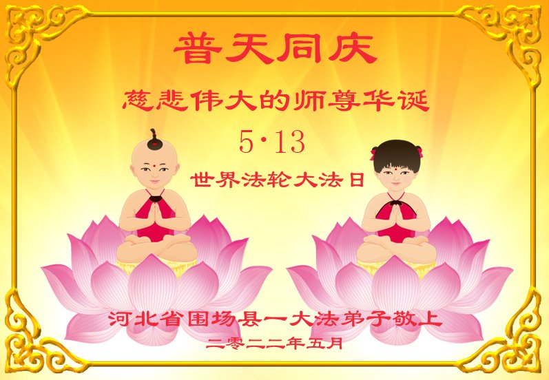 二零二二年五月十三日世界法轮大法日即将到来,我们有缘走上了修炼大法的路,师尊给每个大法弟子净化身体,教诲我们用真善忍标准要求自己。我们感恩师尊!弟子多学法,做事多为别人着想,遇事向内找。做好三件事,多救度有缘的众生。精進、再精進,完成史前大愿。