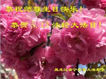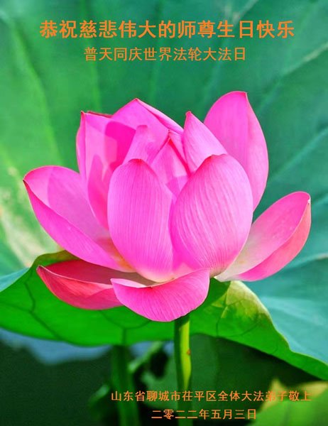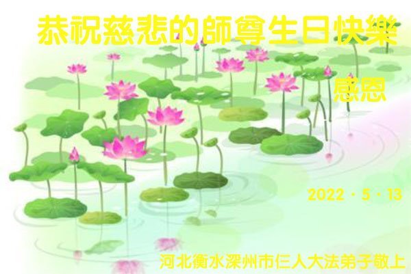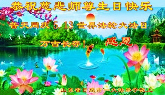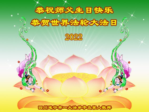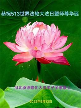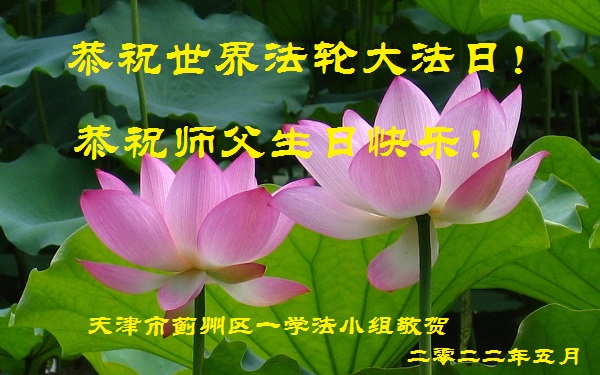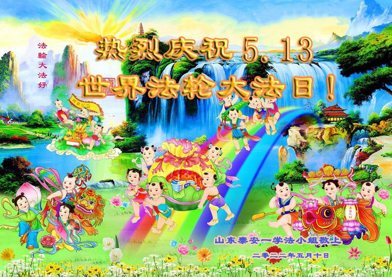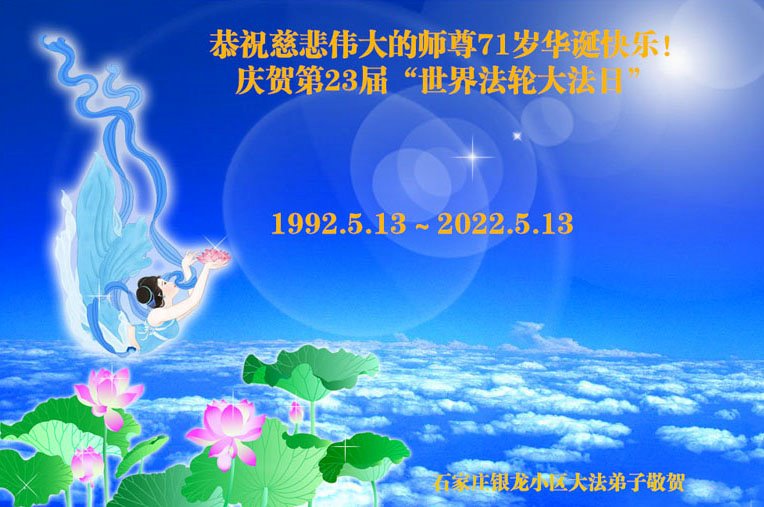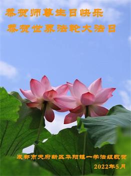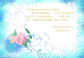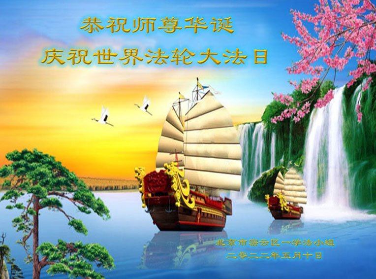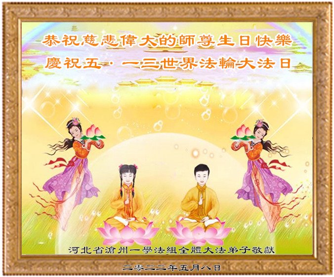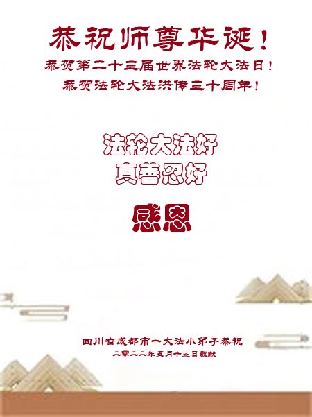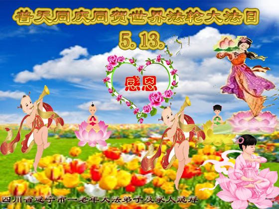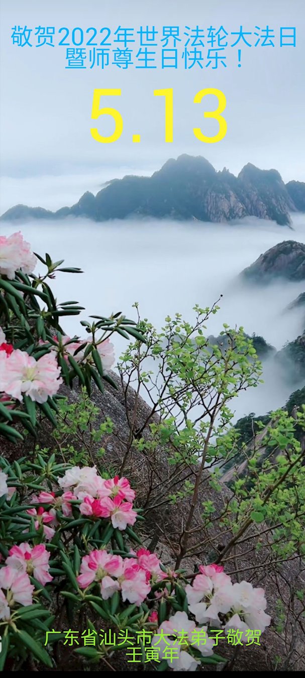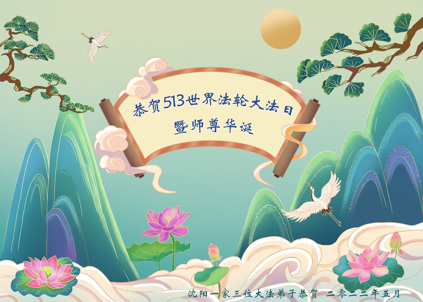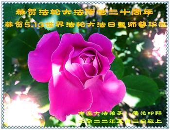 二零二二年五月十三日世界法轮大法日即将到来,我们有缘走上了修炼大法的路,师尊给每个大法弟子净化身体,教诲我们用真善忍标准要求自己。我们感恩师尊!弟子多学法,做事多为别人着想,遇事向内找。做好三件事,多救度有缘的众生。精進、再精進,完成史前大愿。
