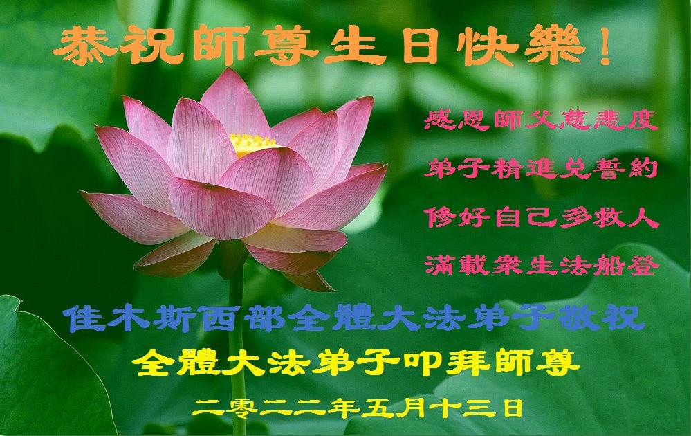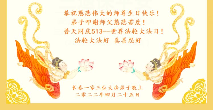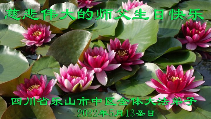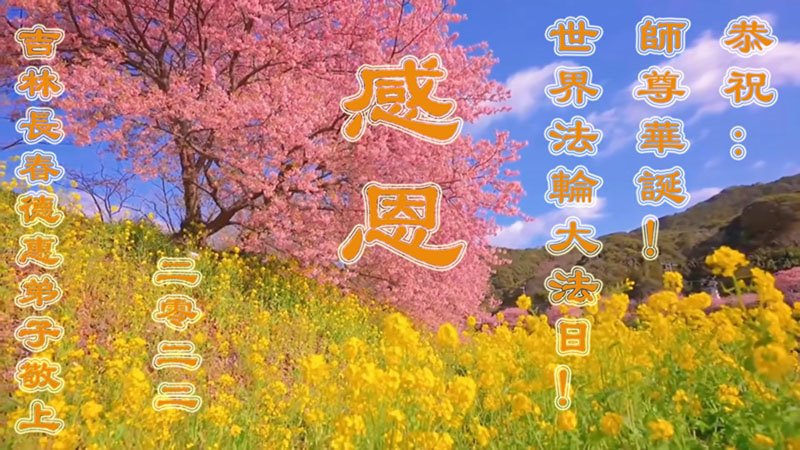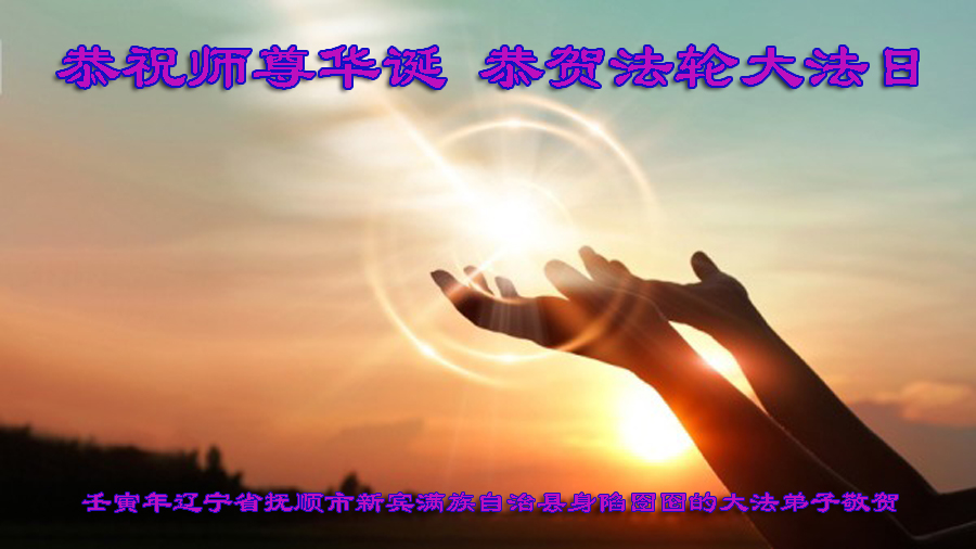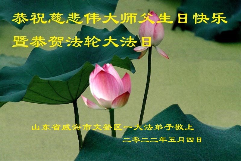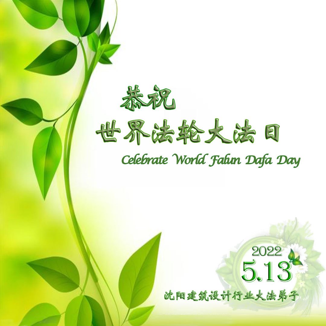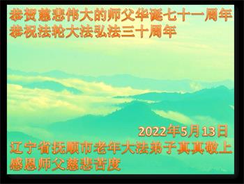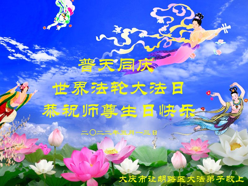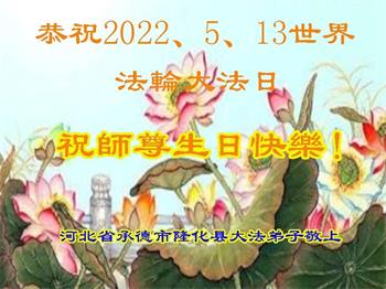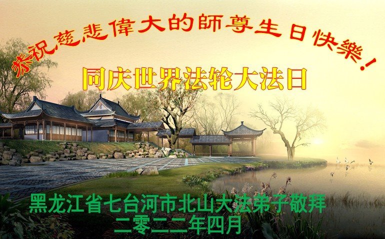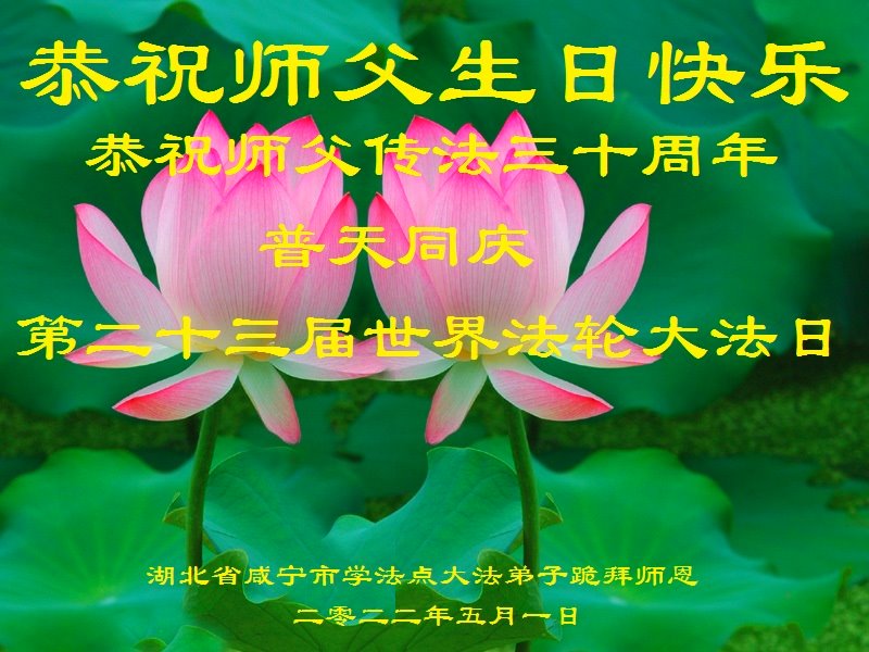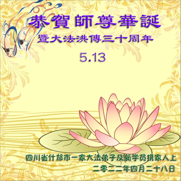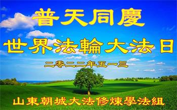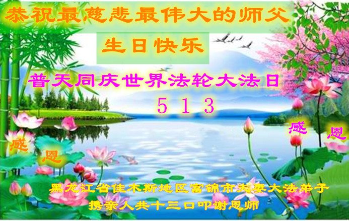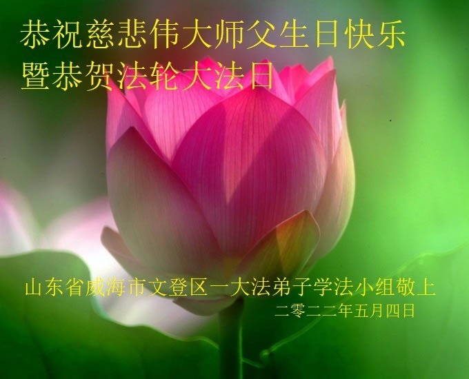 二零二二年五月十三日世界法轮大法日即将到来,我们有缘走上了修炼大法的路,师尊给每个大法弟子净化身体,教诲我们用真善忍标准要求自己。我们感恩师尊!弟子多学法,做事多为别人着想,遇事向内找。做好三件事,多救度有缘的众生。精進、再精進,完成史前大愿。