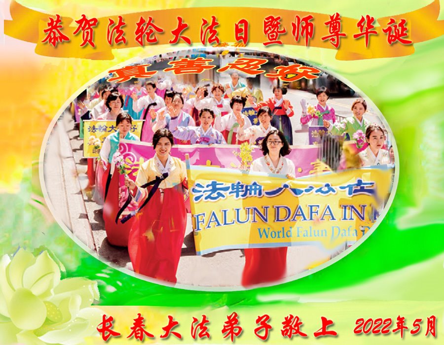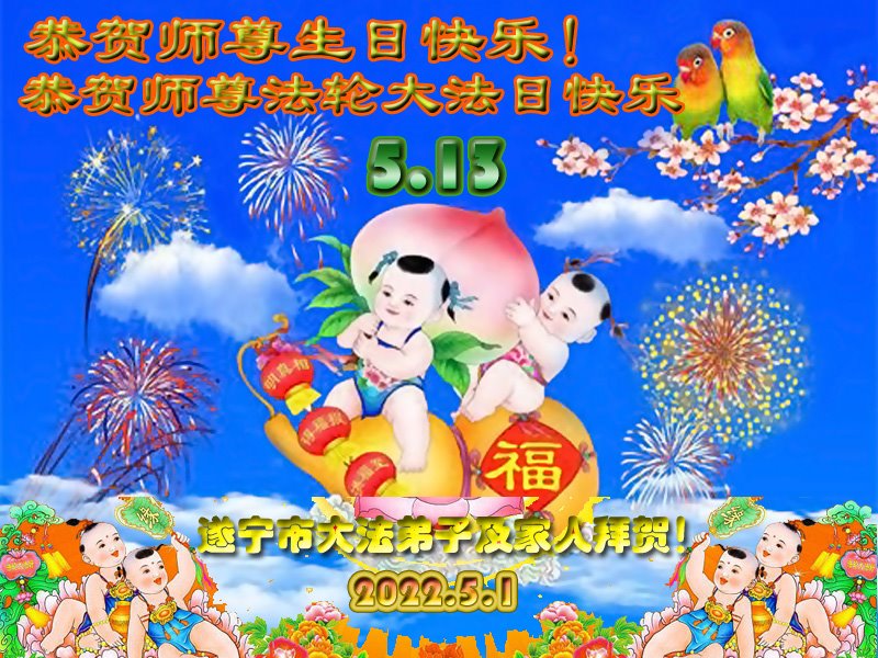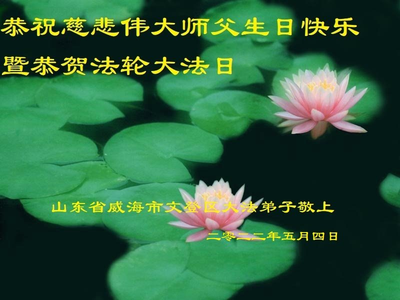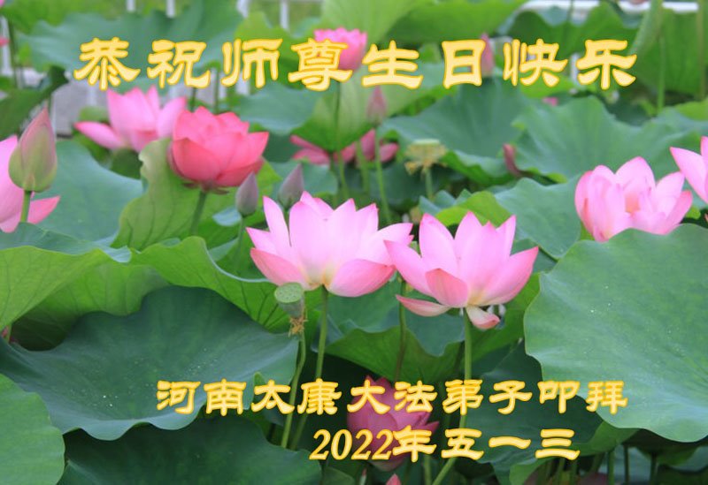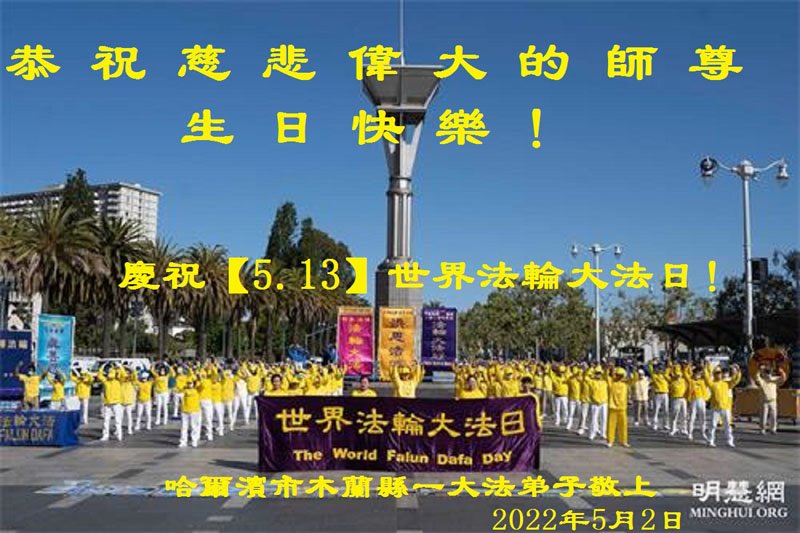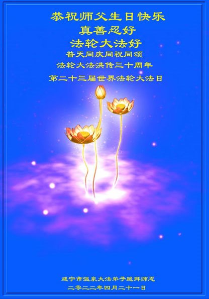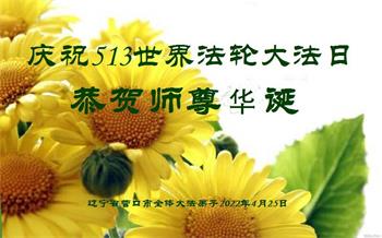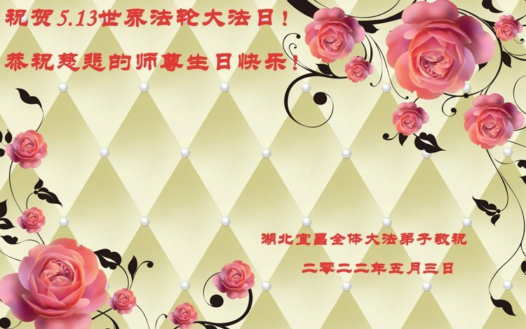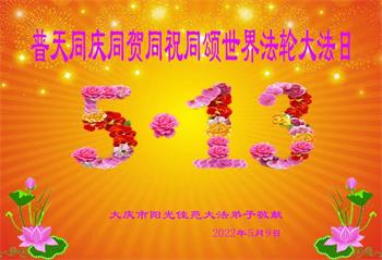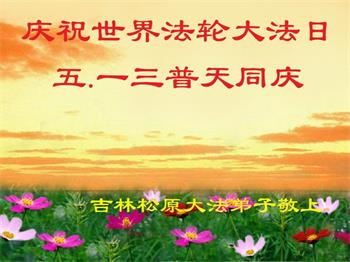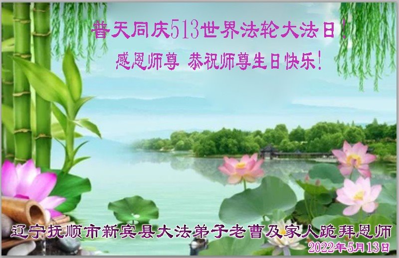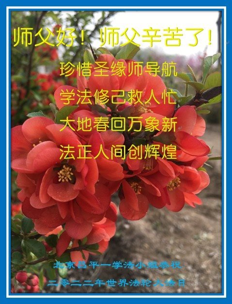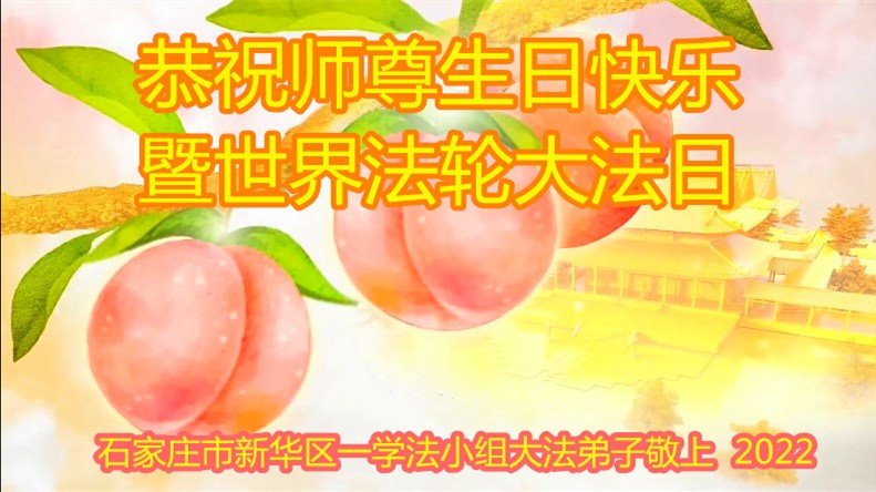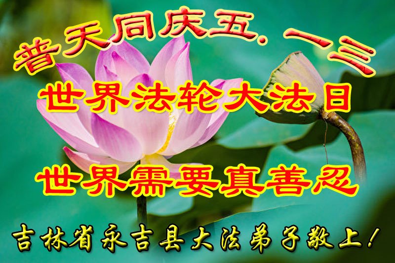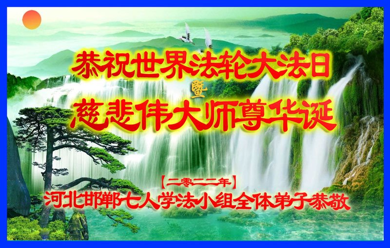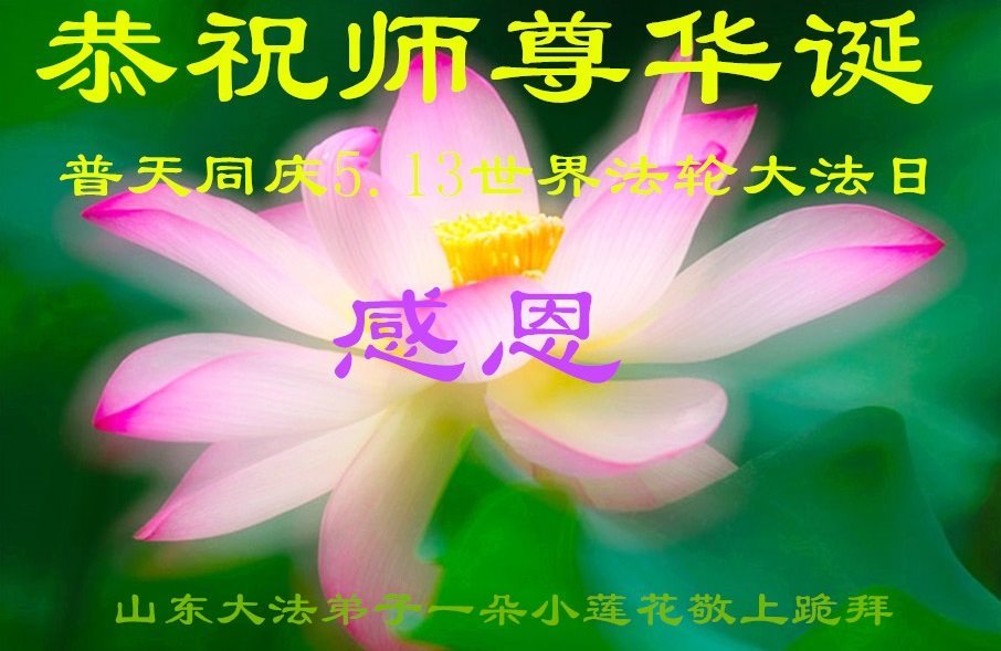 二零二二年五月十三日世界法轮大法日即将到来,我们有缘走上了修炼大法的路,师尊给每个大法弟子净化身体,教诲我们用真善忍标准要求自己。我们感恩师尊!弟子多学法,做事多为别人着想,遇事向内找。做好三件事,多救度有缘的众生。精進、再精進,完成史前大愿。