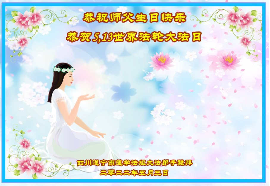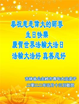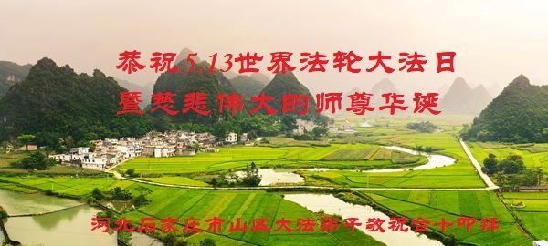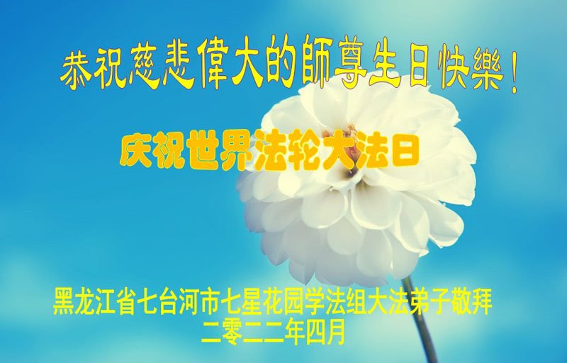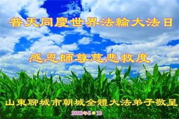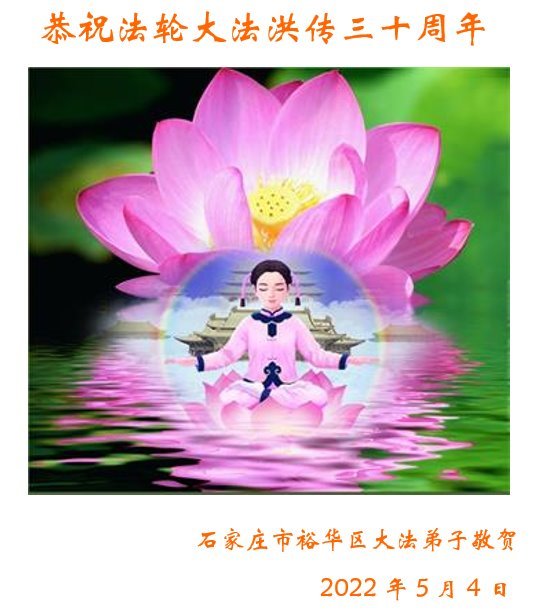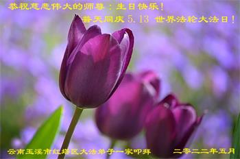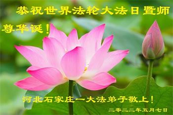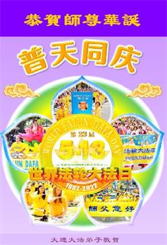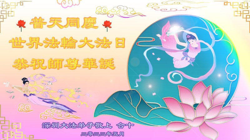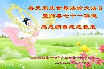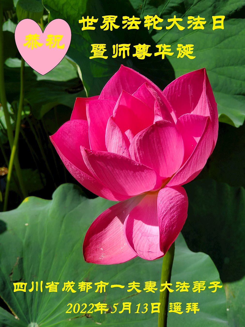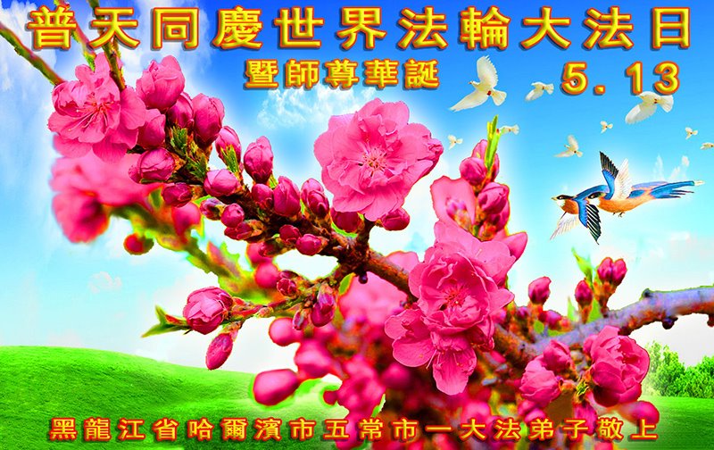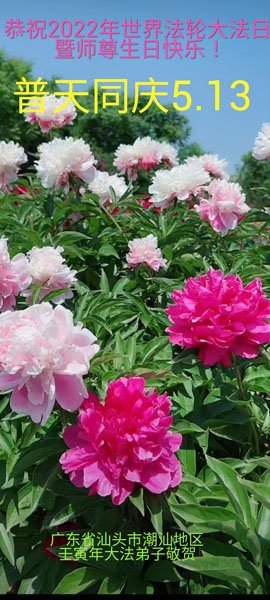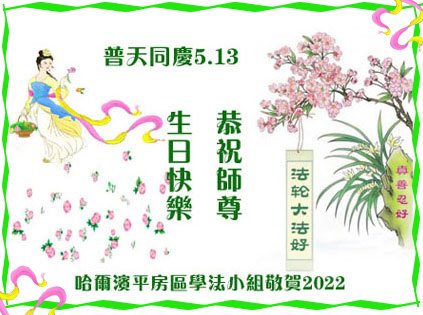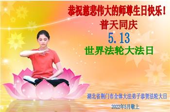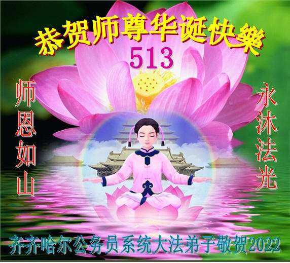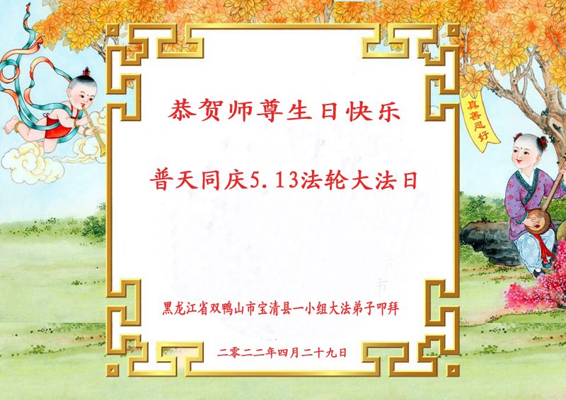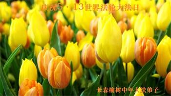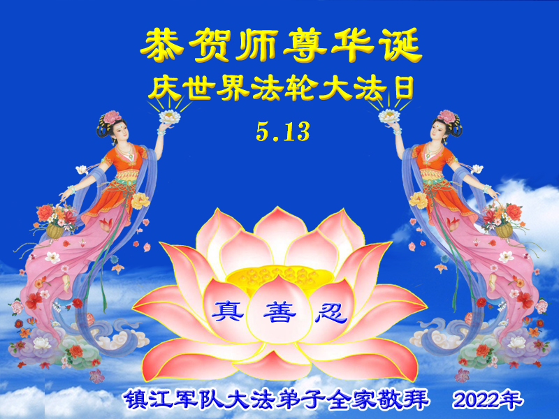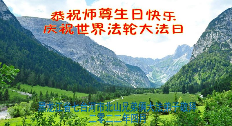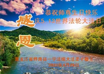 二零二二年五月十三日世界法轮大法日即将到来,我们有缘走上了修炼大法的路,师尊给每个大法弟子净化身体,教诲我们用真善忍标准要求自己。我们感恩师尊!弟子多学法,做事多为别人着想,遇事向内找。做好三件事,多救度有缘的众生。精進、再精進,完成史前大愿。