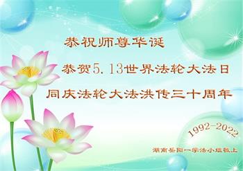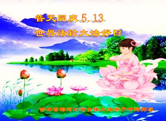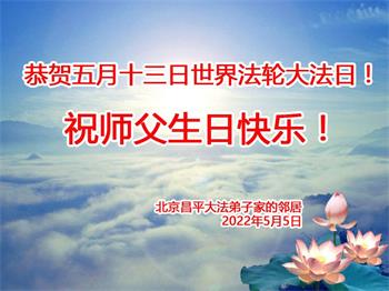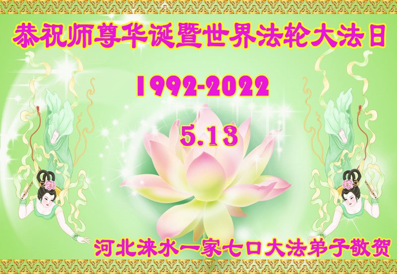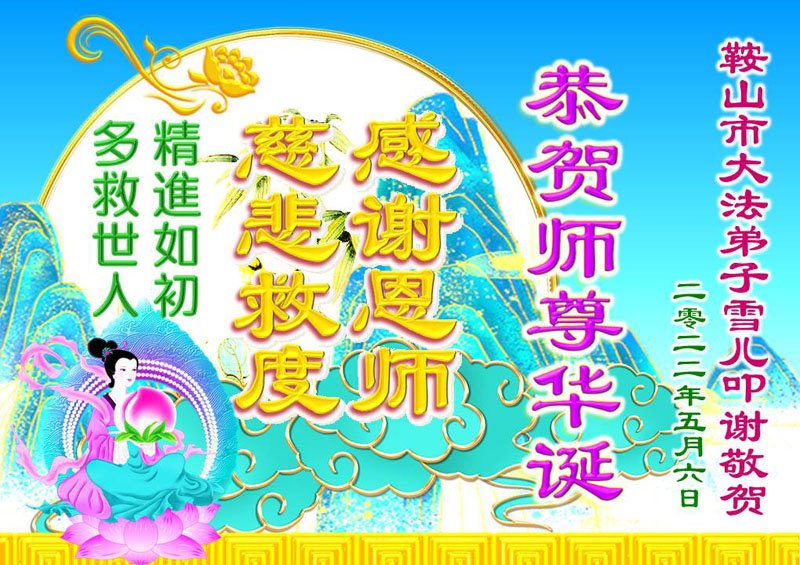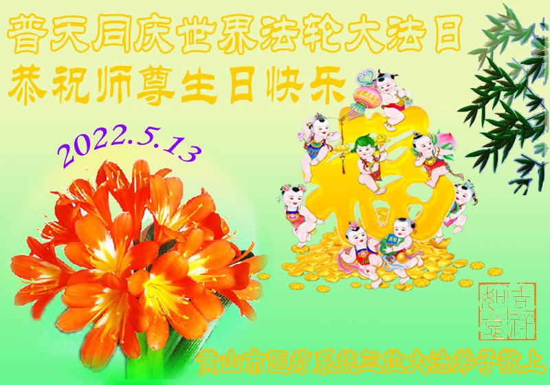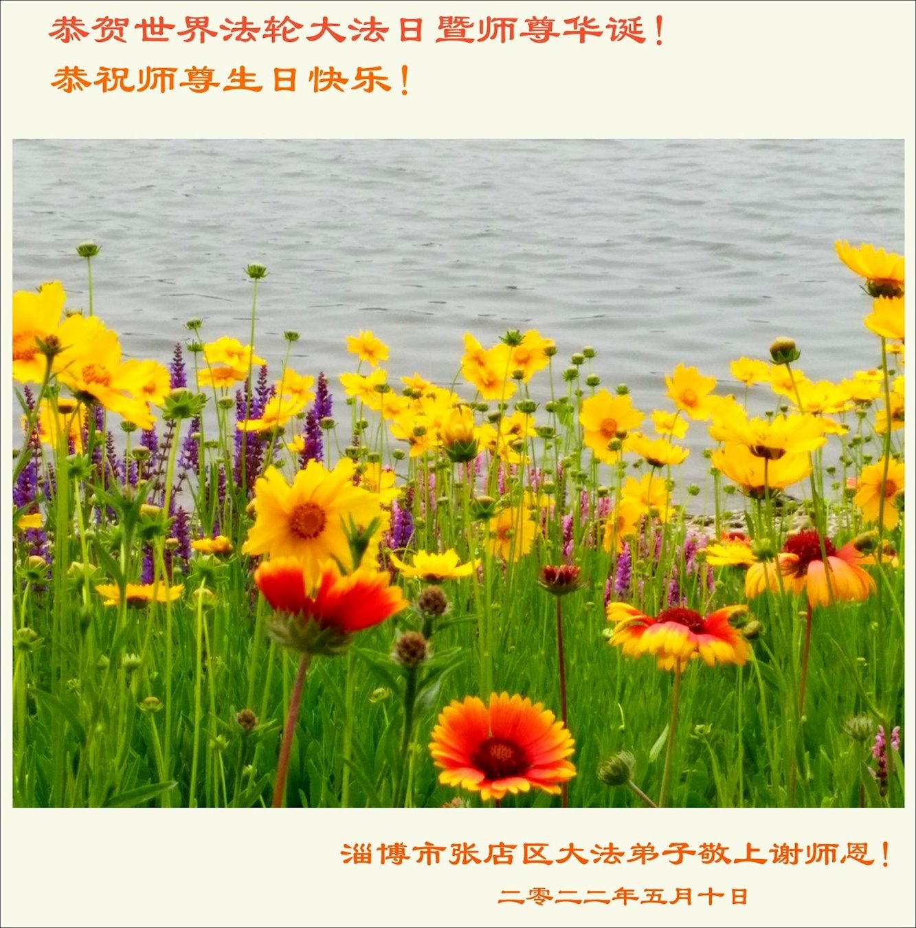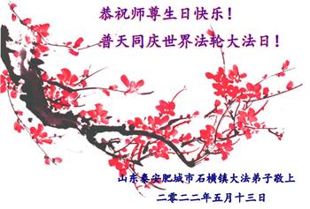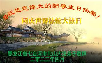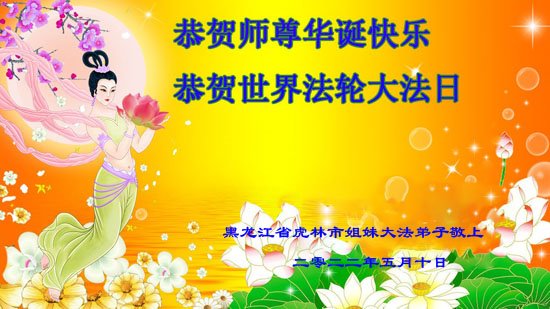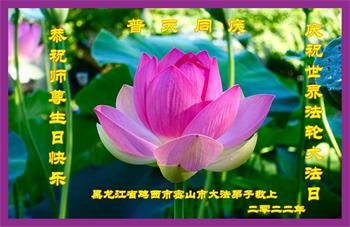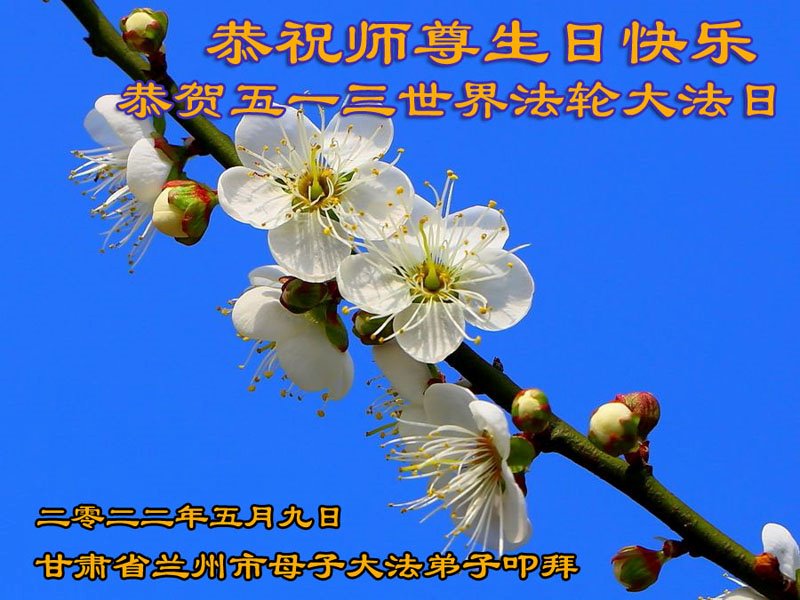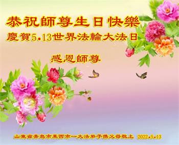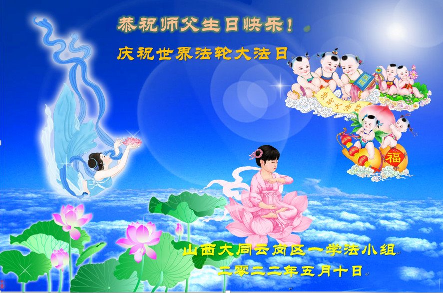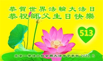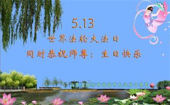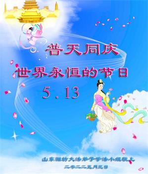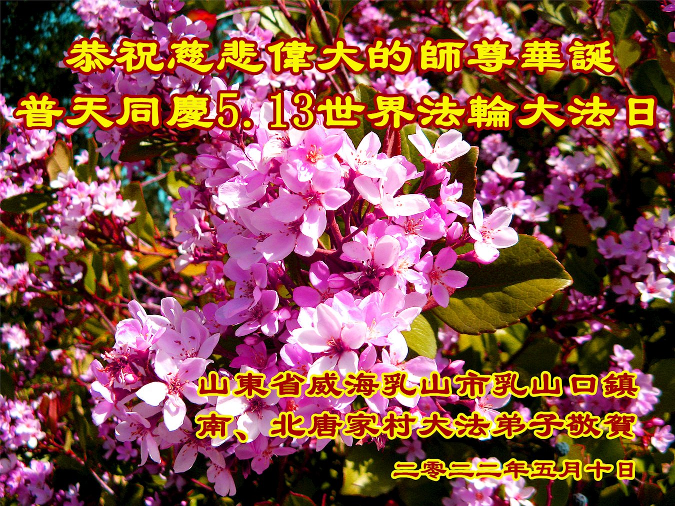 二零二二年五月十三日世界法轮大法日即将到来,我们有缘走上了修炼大法的路,师尊给每个大法弟子净化身体,教诲我们用真善忍标准要求自己。我们感恩师尊!弟子多学法,做事多为别人着想,遇事向内找。做好三件事,多救度有缘的众生。精進、再精進,完成史前大愿。