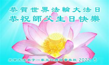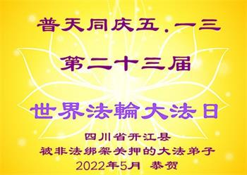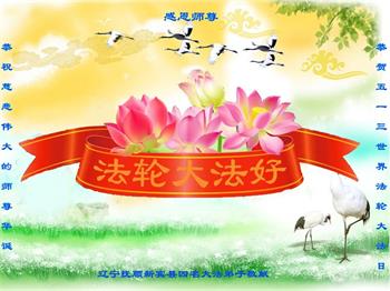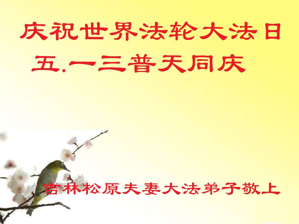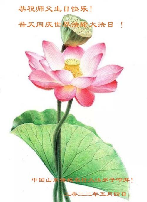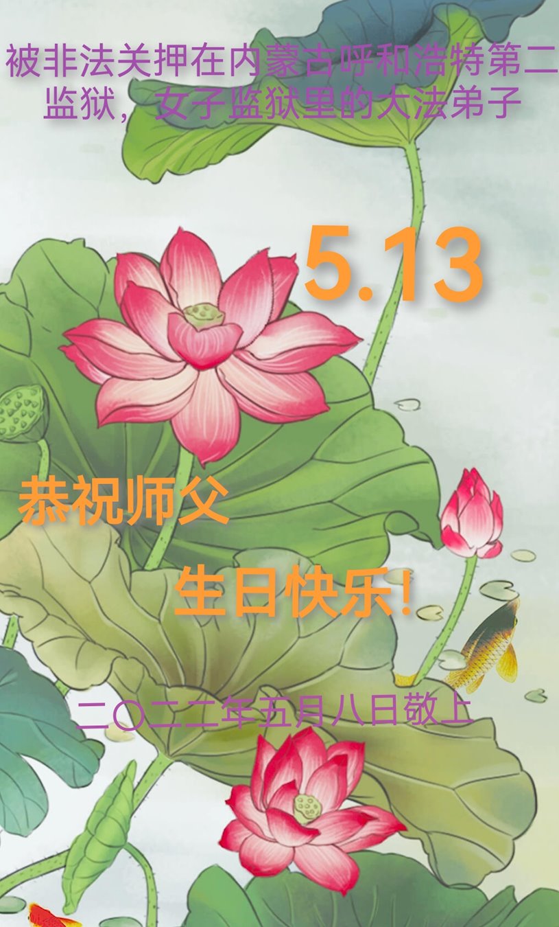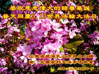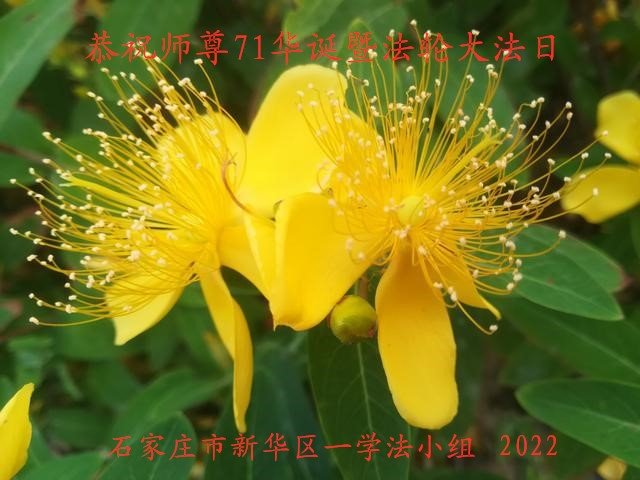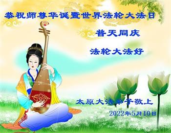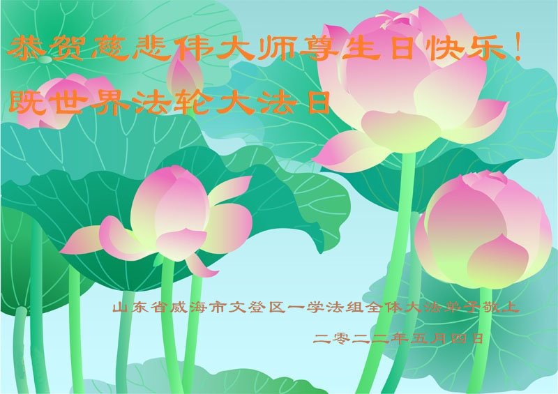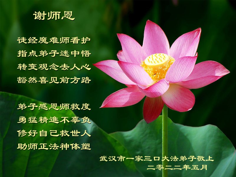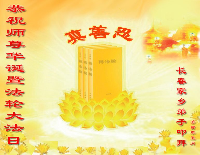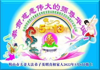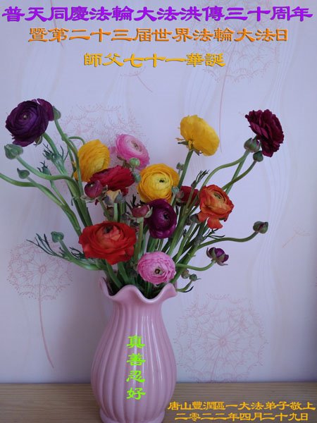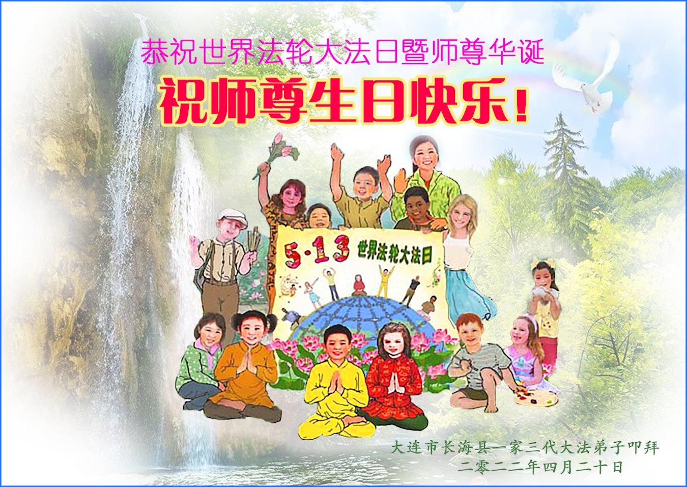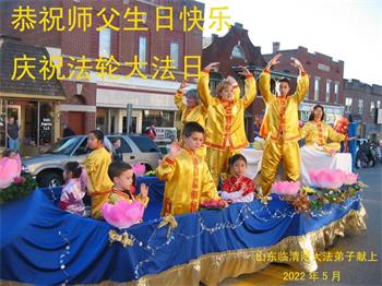 二零二二年五月十三日世界法轮大法日即将到来,我们有缘走上了修炼大法的路,师尊给每个大法弟子净化身体,教诲我们用真善忍标准要求自己。我们感恩师尊!弟子多学法,做事多为别人着想,遇事向内找。做好三件事,多救度有缘的众生。精進、再精進,完成史前大愿。