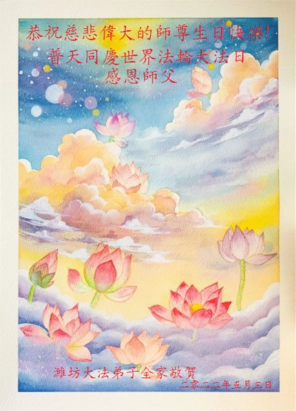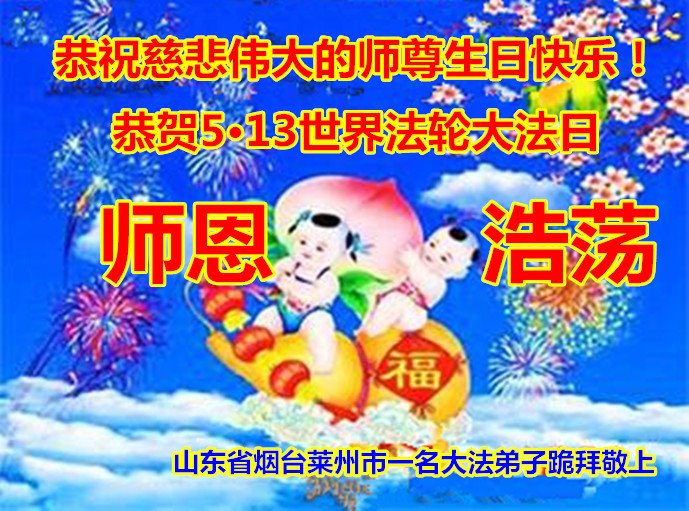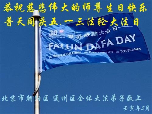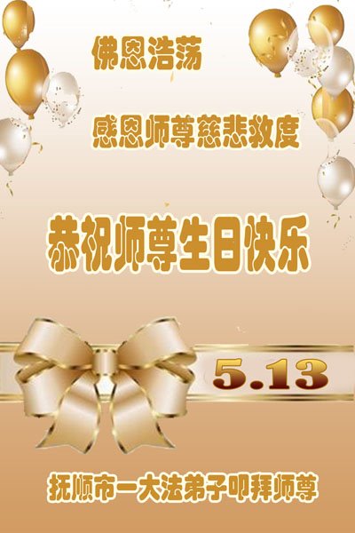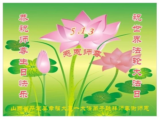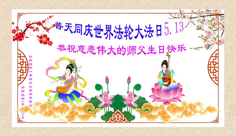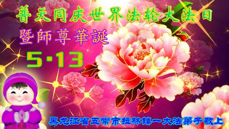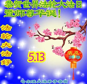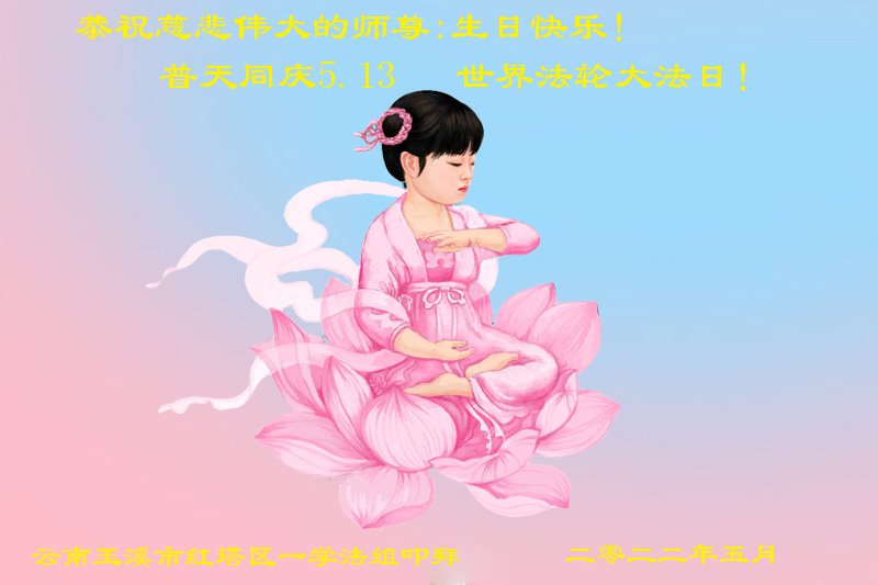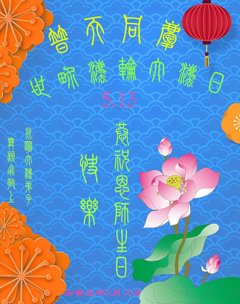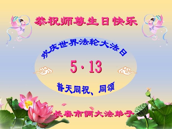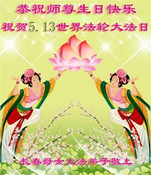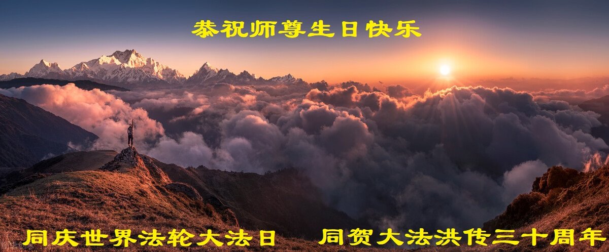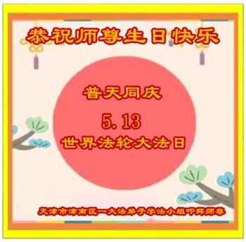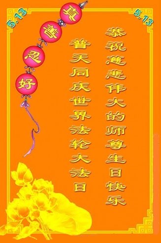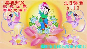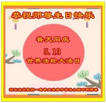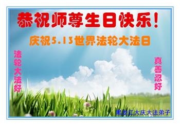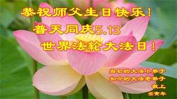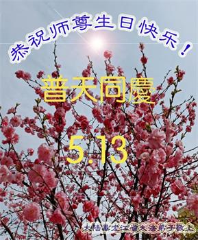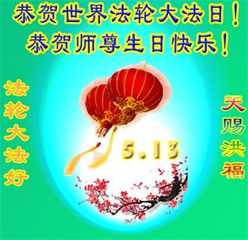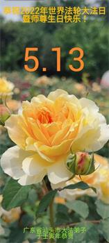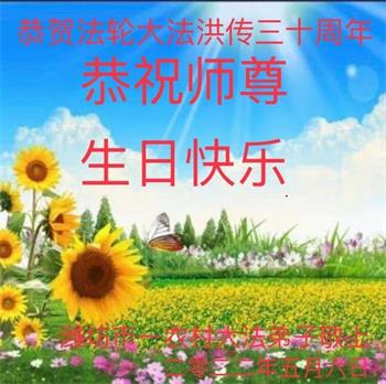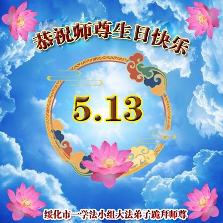 又到了一年一度的世界法轮大法日暨师尊华诞,今年的五月十三日是第二十三届世界法轮大法日,也是法轮大法洪传三十周年纪念日。在这特别的日子里,弟子恭祝师尊生日快乐!弟子一定修好自己,多学法,多救人,跟师父回家。
