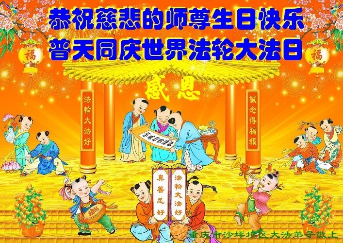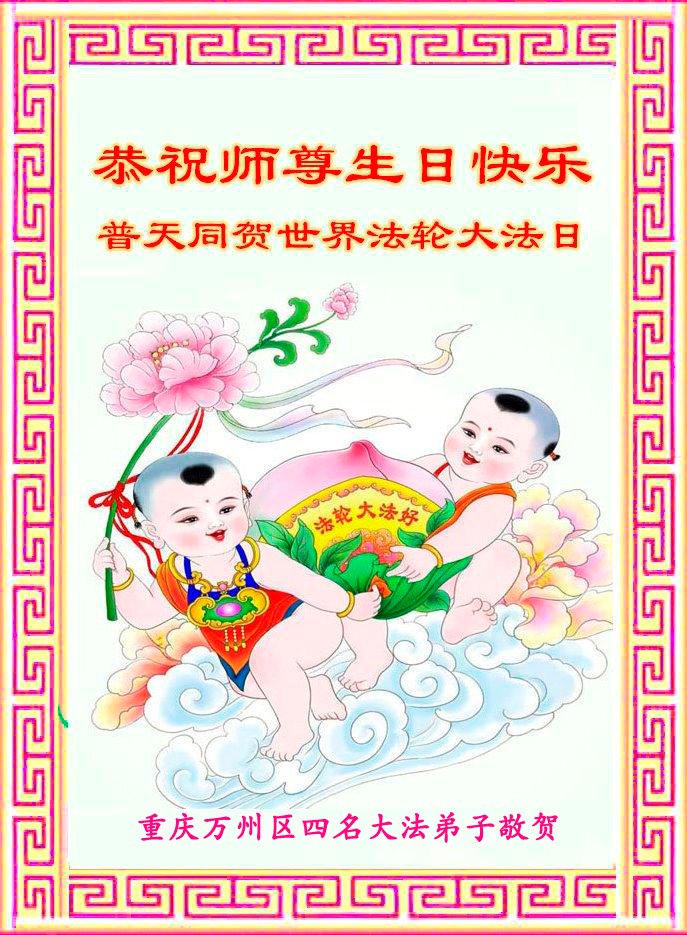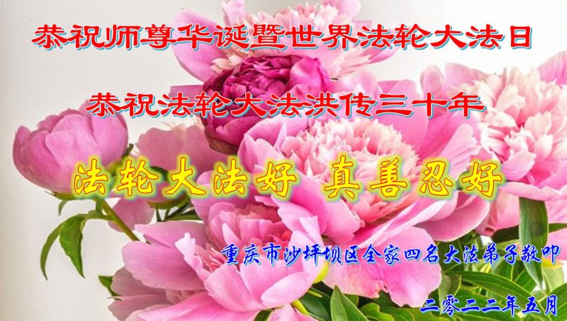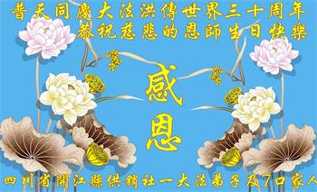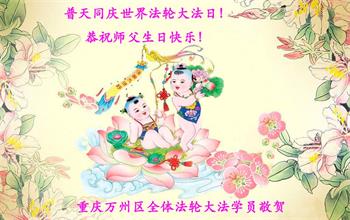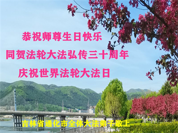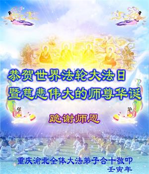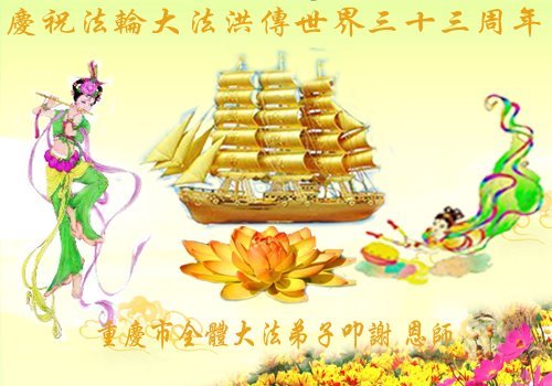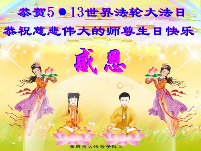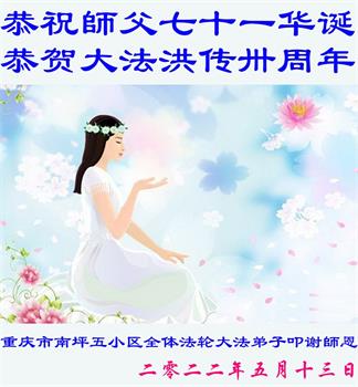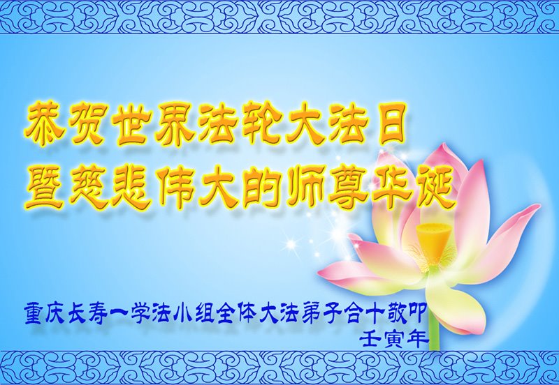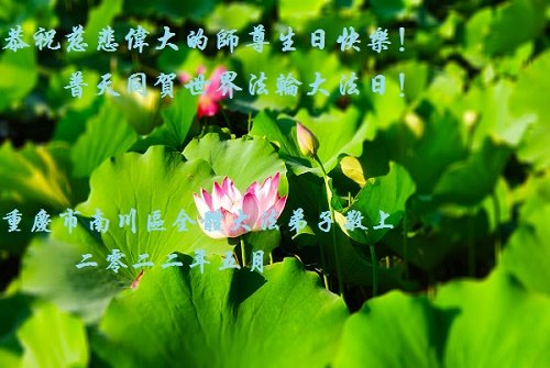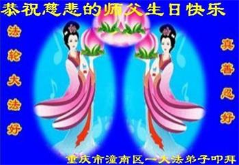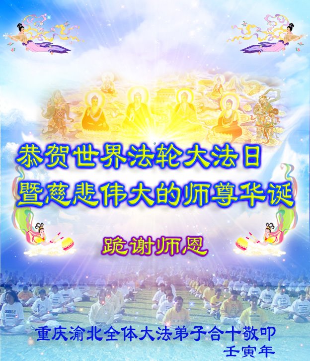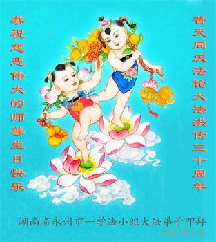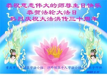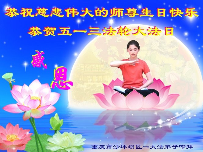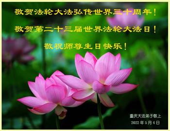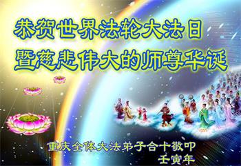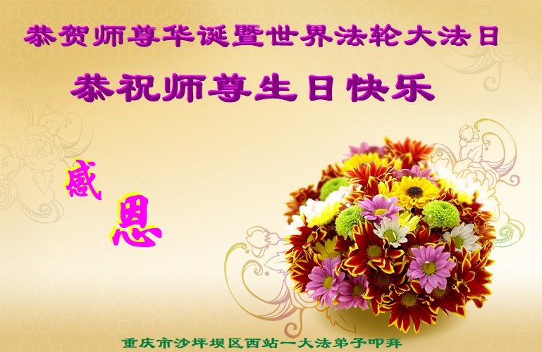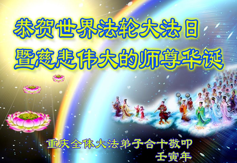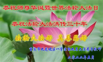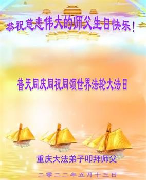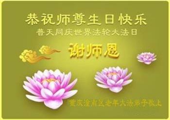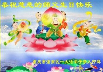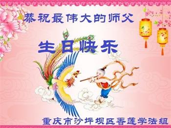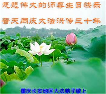 在大法洪传三十周年之际,重庆永川大法弟子恭祝师尊生日快乐!我们在随师父正法的风风雨雨中,一路走来,千言万语道不尽师父的无量慈悲,道不尽师父救度的无数艰辛,道不尽师父给我们最好的一切……请师父放心,无论形势如何变化,我们都会坚修大法心不动,学好法,修好自己,同心协力配合好多救人,兑现来世时用生命签下的誓约,圆满随师还。