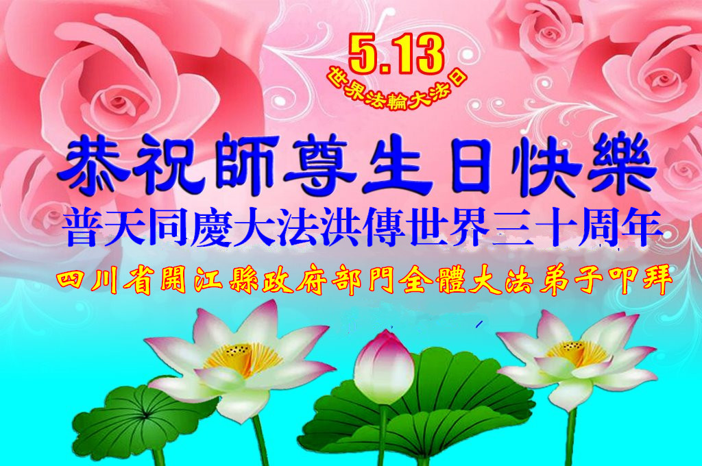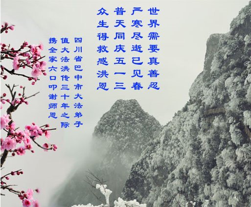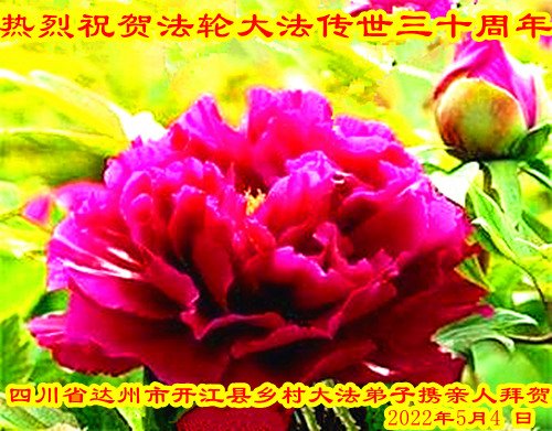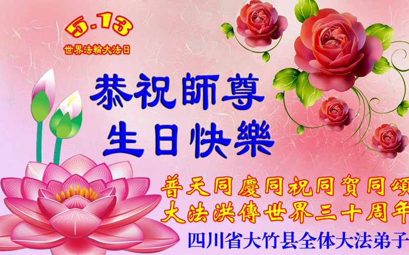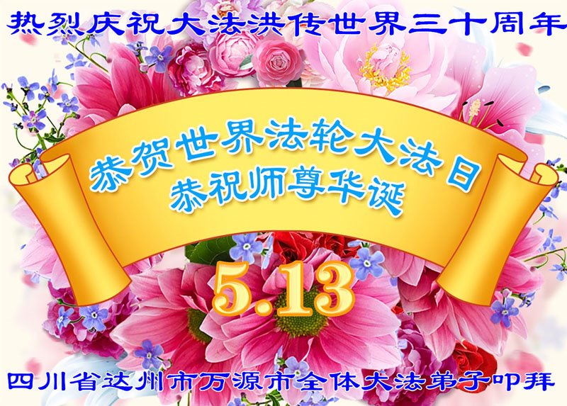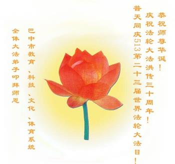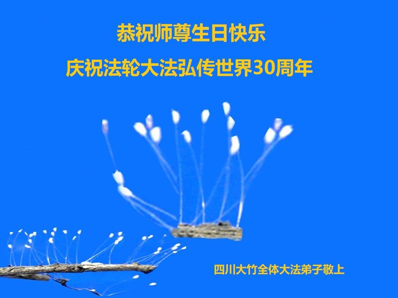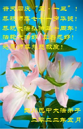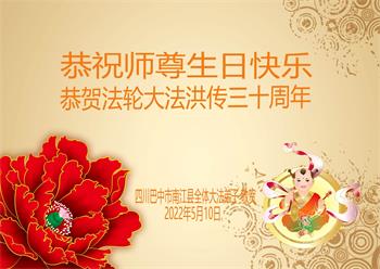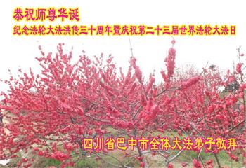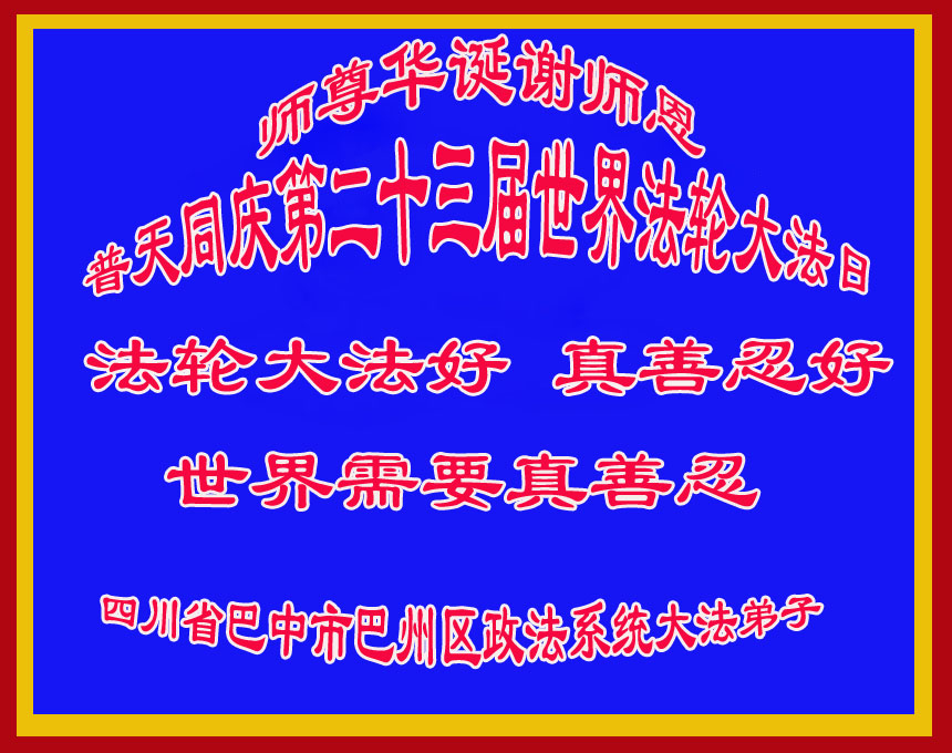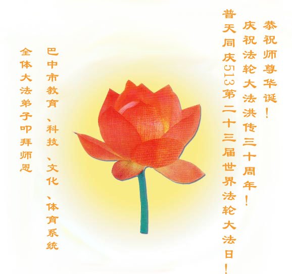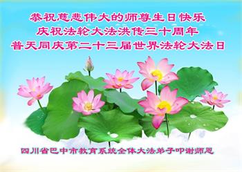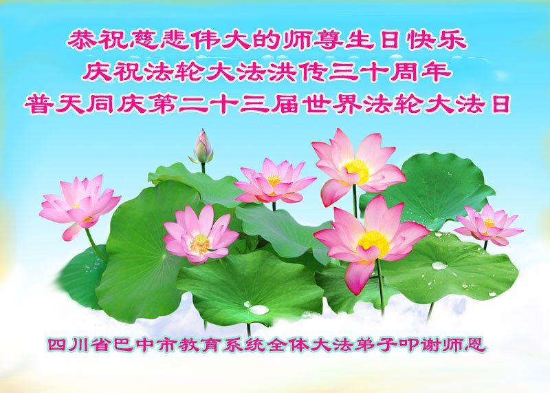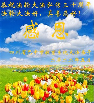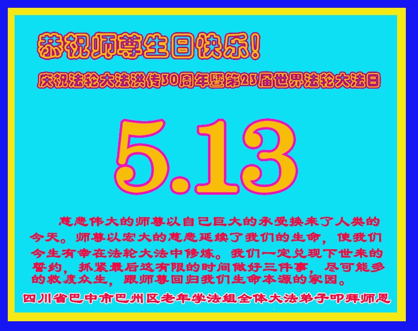 在慈悲伟大的师尊华诞来临之际,在法轮大法洪传三十周年之际,在普天同庆第二十三届世界法轮大法日到来之际,我们四川省巴中市巴州区全体大法弟子万分想念您,我们向慈悲伟大的师尊致以最崇高的敬意!弟子们一定不辜负您的殷切期盼,做好我们应该做好的三件事,抓紧时间快救人多救人,走好走稳大法弟子助师正法最后这段路程。