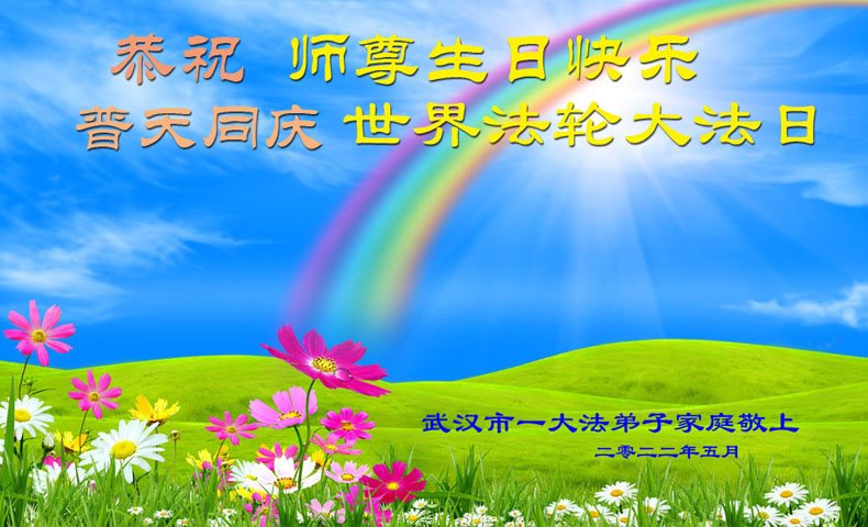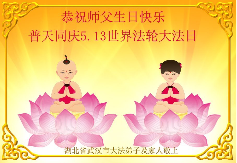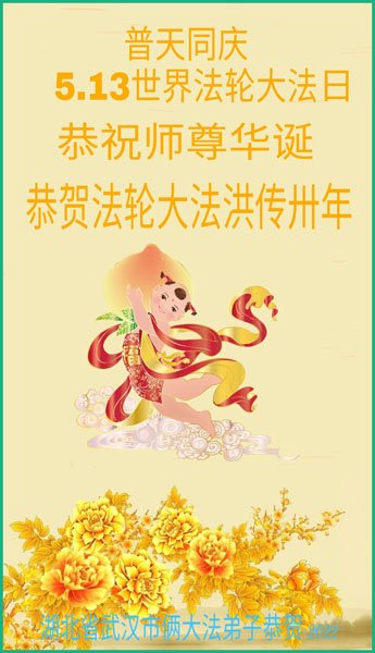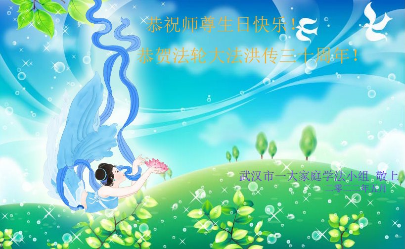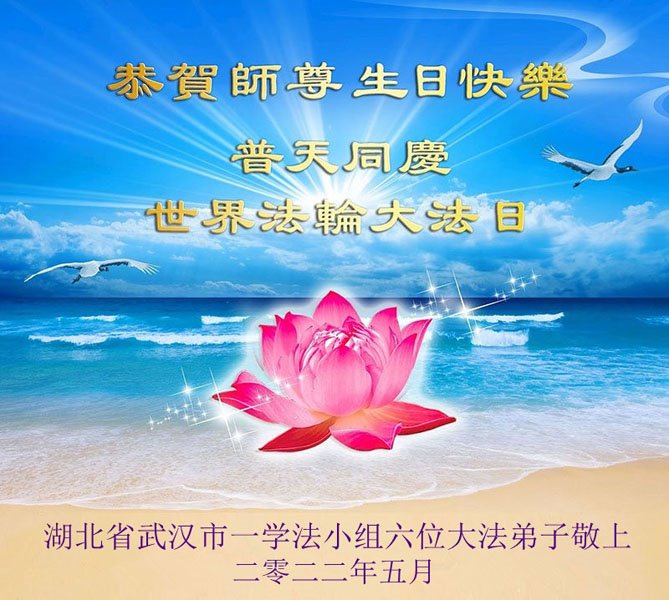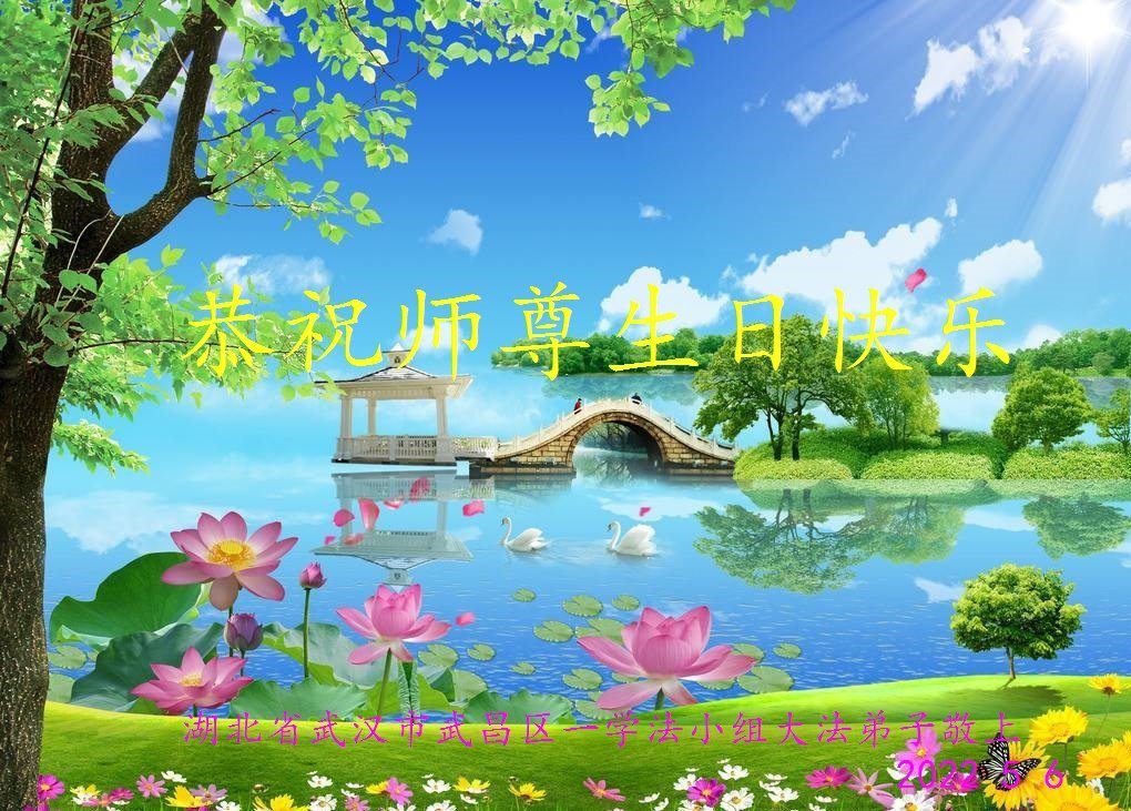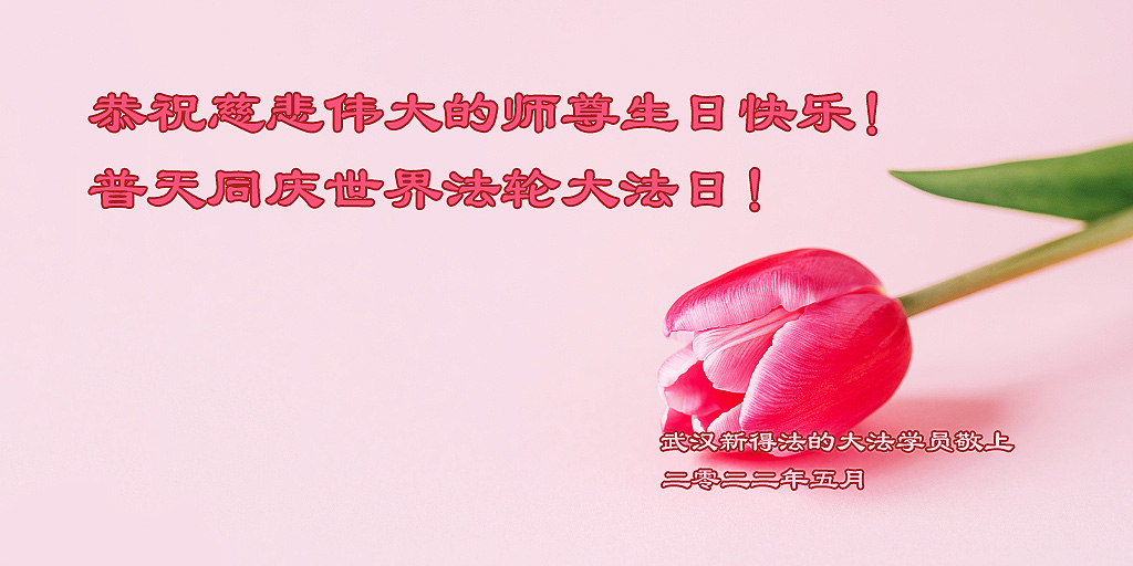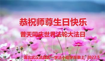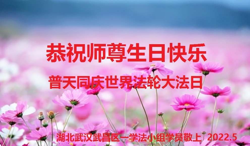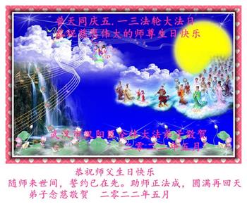 在这个充满温暖和阳光的五月,在这个代表着感恩、喜庆、希望的五月,在这个普天同庆、人天欢乐的五月。武汉南湖花园一学法小组大法学员和一北京大法学员,怀着无比崇敬和感恩的心情恭贺慈悲伟大的师尊生日快乐!此时此刻,我们更加思念师尊,感恩师尊传出高德大法救度无量众生,借此佳节我们也祝愿师尊早日返回神州东土!