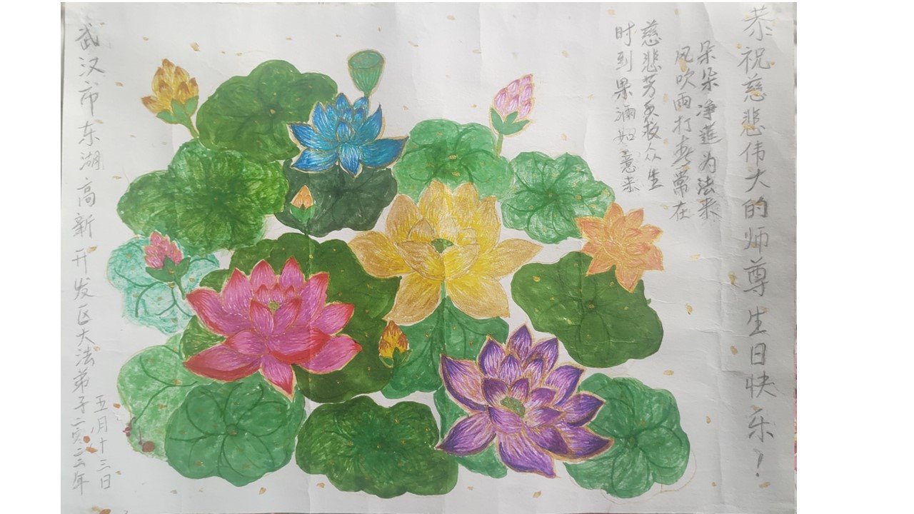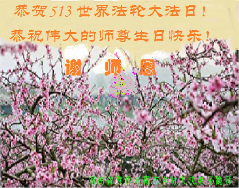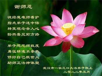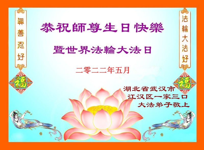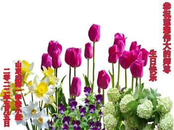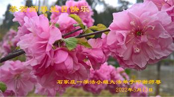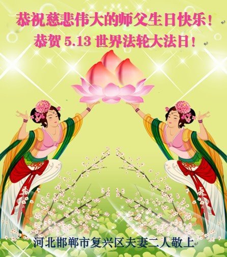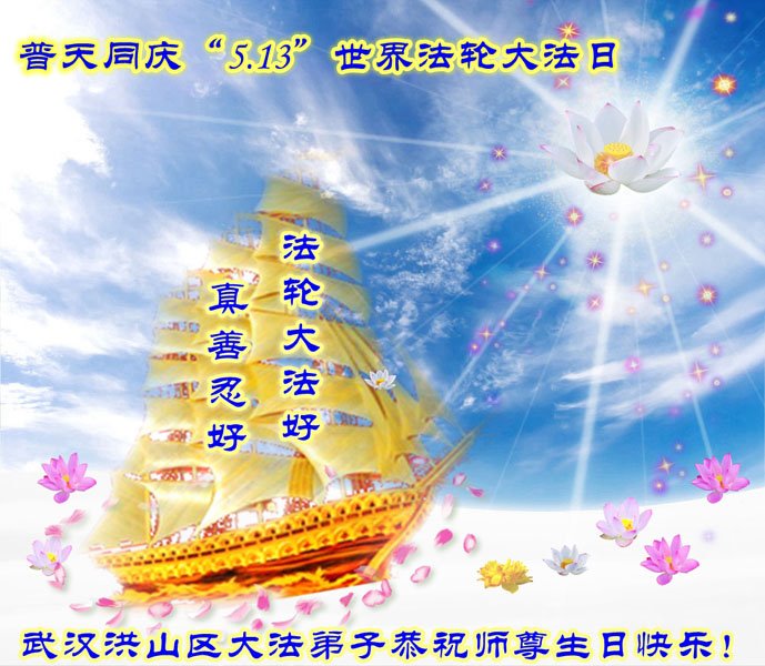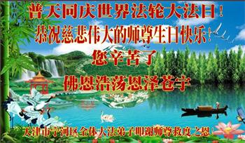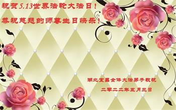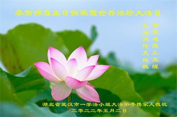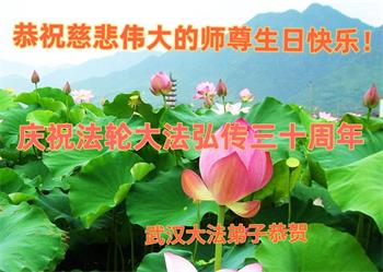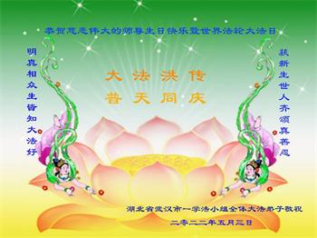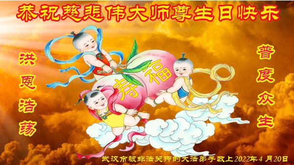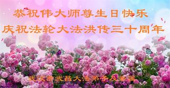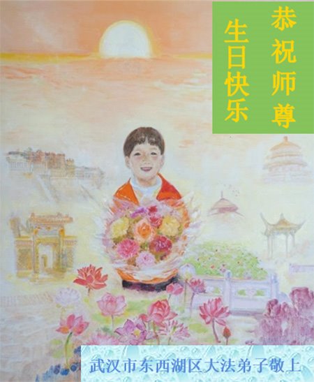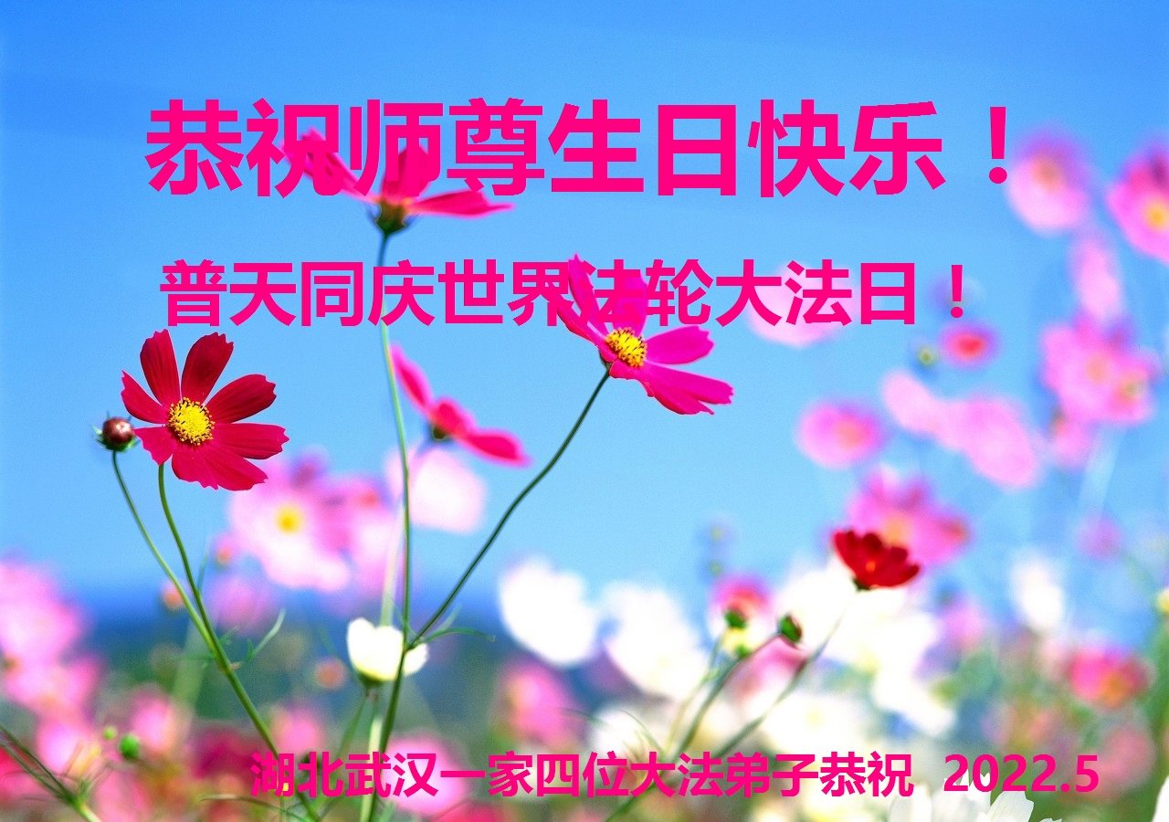 在这个充满温暖和阳光的五月,在这个代表着感恩、喜庆、希望的五月,在这个普天同庆、人天欢乐的五月。武汉南湖花园一学法小组大法学员和一北京大法学员,怀着无比崇敬和感恩的心情恭贺慈悲伟大的师尊生日快乐!此时此刻,我们更加思念师尊,感恩师尊传出高德大法救度无量众生,借此佳节我们也祝愿师尊早日返回神州东土!