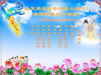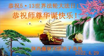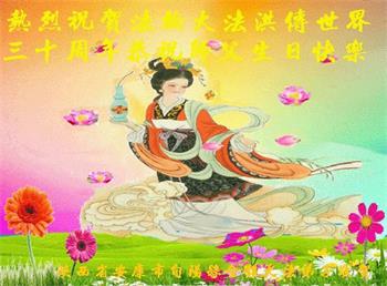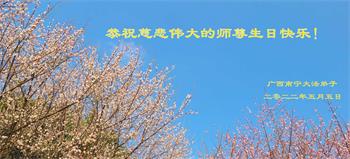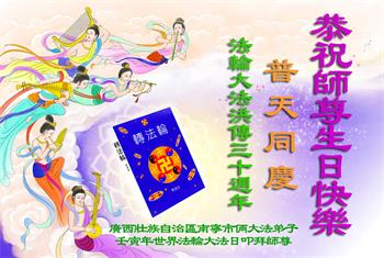 在法轮大法洪传三十周年的伟大时刻,在世界法轮大法日来临之时,在这普天同庆之际,广西南宁大法弟子恭祝师尊生日快乐!
