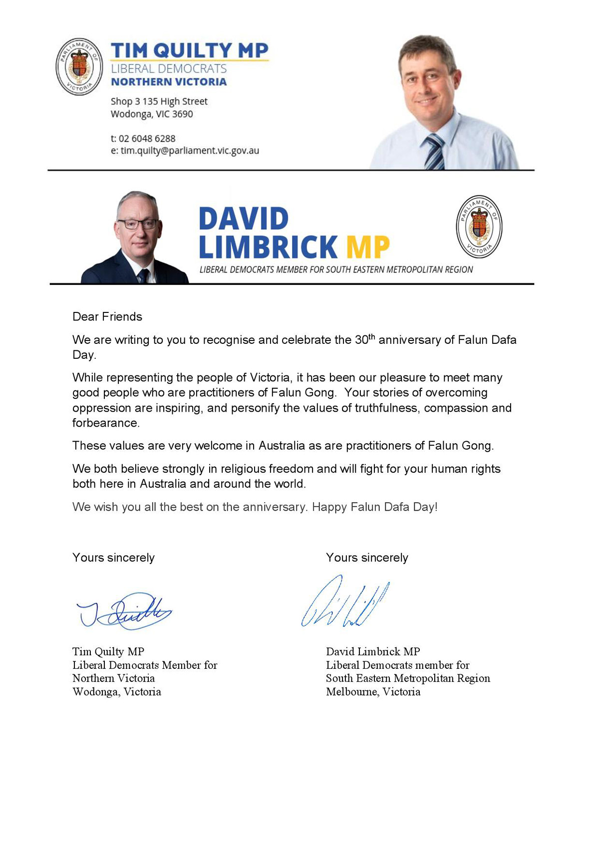 维州北部地区代表自由民主党的立法会议员奎尔迪(Tim Quilty)先生及联邦参议员候选人、前维州立法会议员林布里克(David Limbrick)先生共同发来贺信。