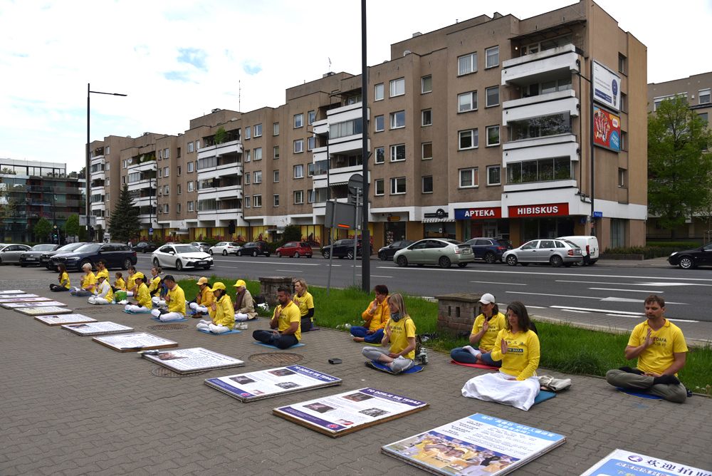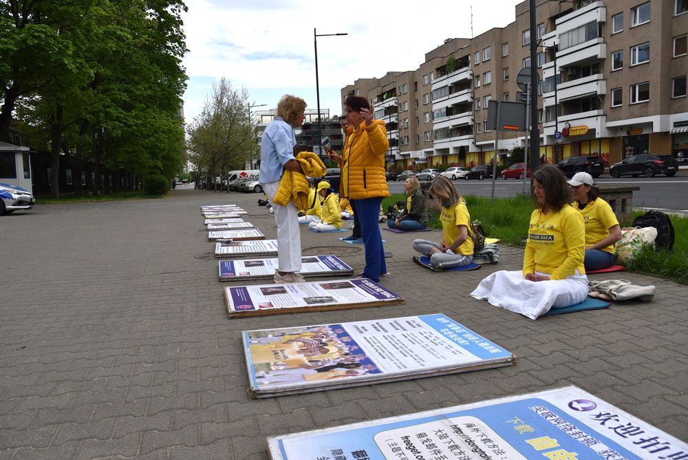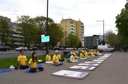 上午八点半开始学员集体学法炼功并在中午十二点来到华沙中使馆门前静坐,中英波三种文字真相展板一路排在使馆门前,引起不少过往行人关注和询问。