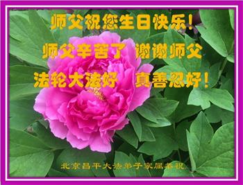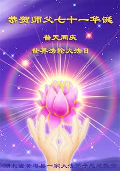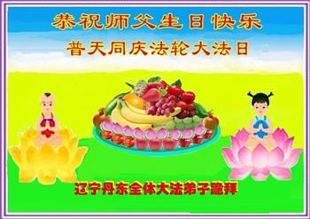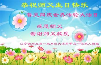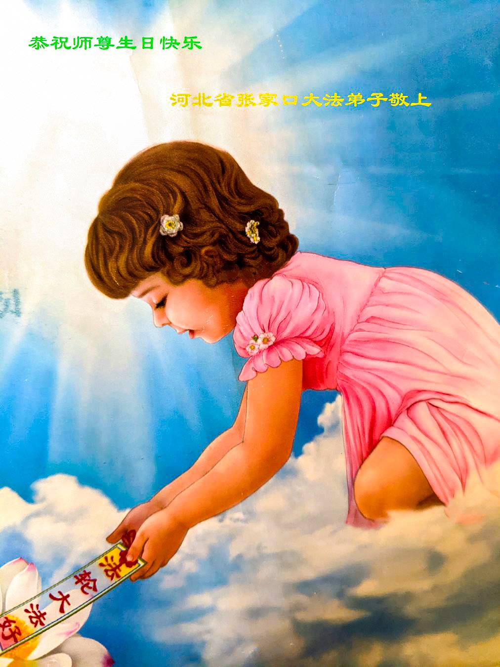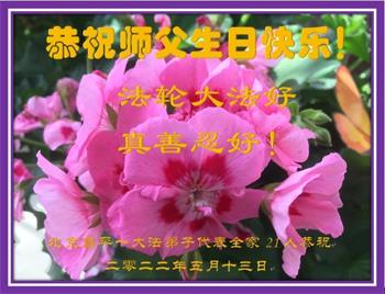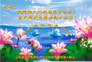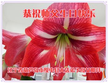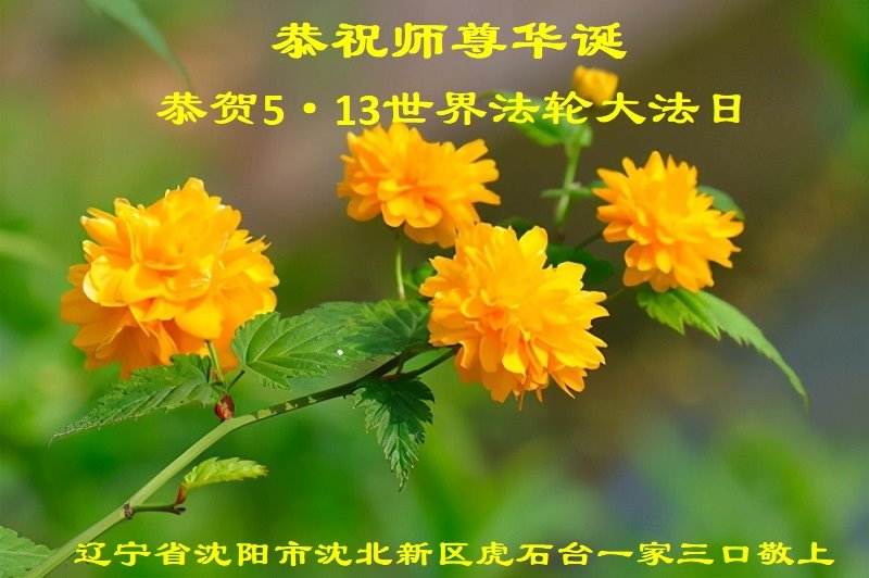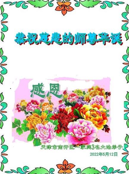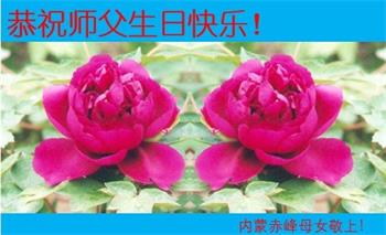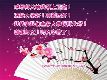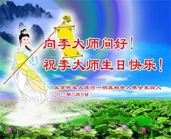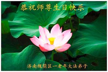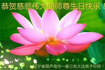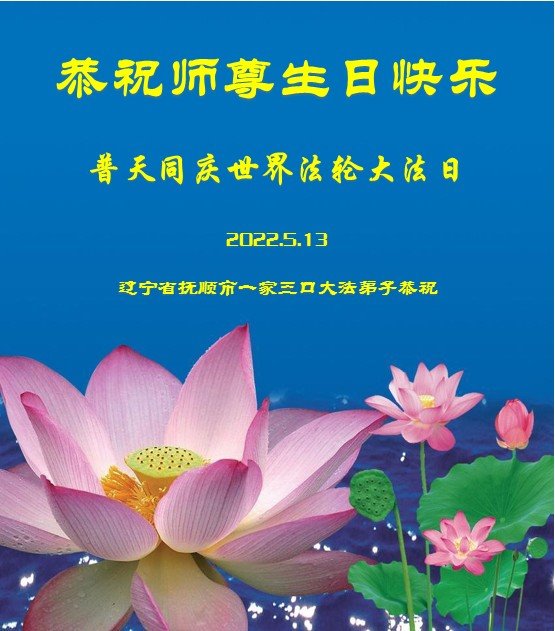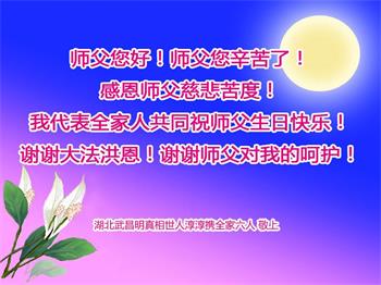 我天天供奉李大师,诚心念“法轮大法好”、“真善忍好”九字真言。每天端起饭碗来,我就会说:请李大师先吃!大法师父太慈悲了,我也不修炼,只爱看大法弟子发的真相资料,也只不过为蒙冤的法轮大法说句公道话,大师就把我和老伴的病治好了,是花多少钱都买不来的。李大师您辛苦了!我们全家人感谢李大师的救命之恩!恭祝李大师生日快乐!