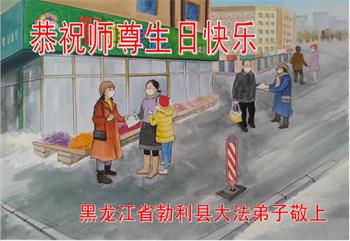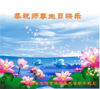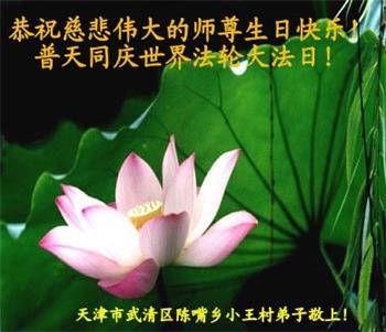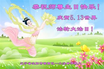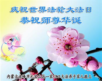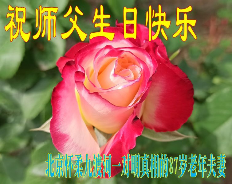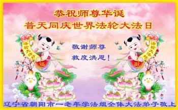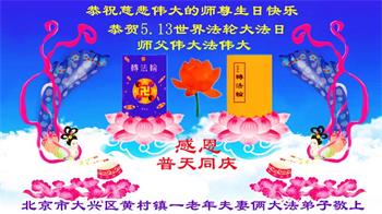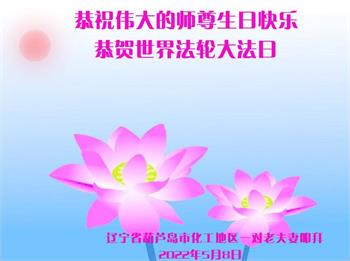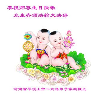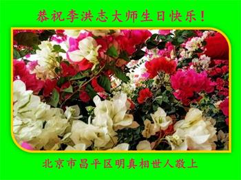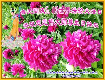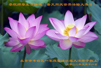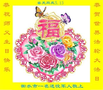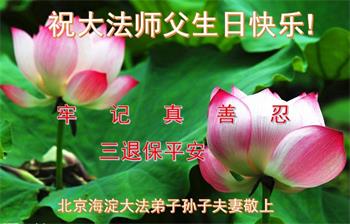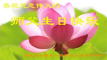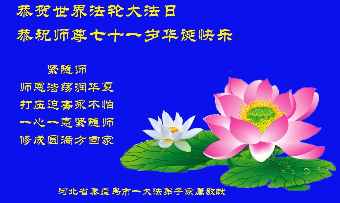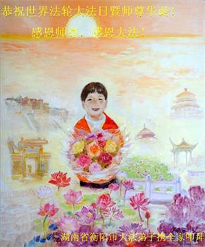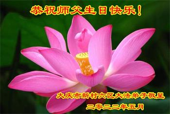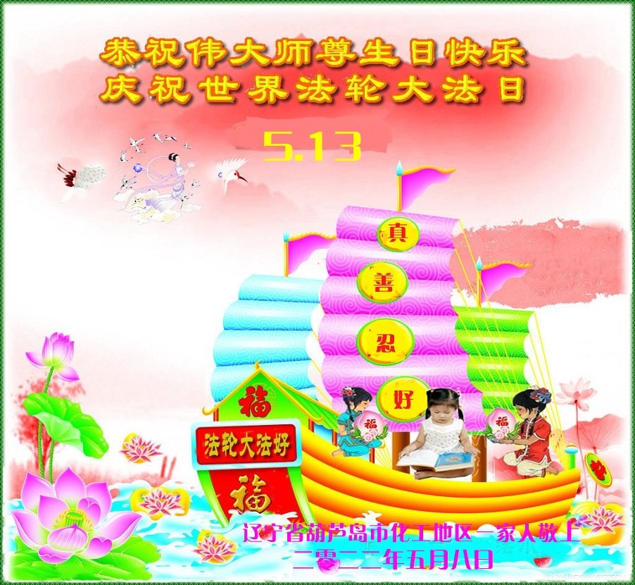 我天天供奉李大师,诚心念“法轮大法好”、“真善忍好”九字真言。每天端起饭碗来,我就会说:请李大师先吃!大法师父太慈悲了,我也不修炼,只爱看大法弟子发的真相资料,也只不过为蒙冤的法轮大法说句公道话,大师就把我和老伴的病治好了,是花多少钱都买不来的。李大师您辛苦了!我们全家人感谢李大师的救命之恩!恭祝李大师生日快乐!