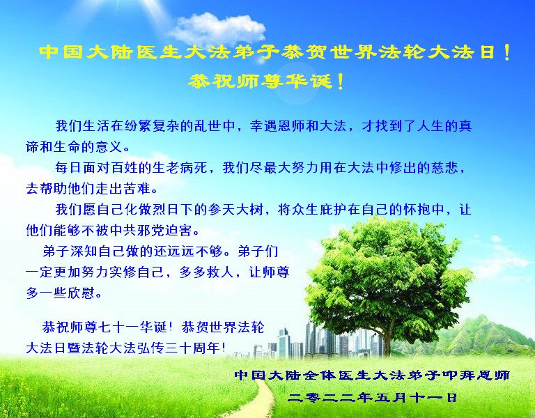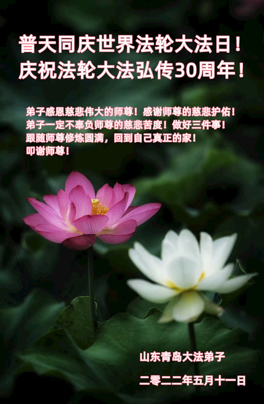 伟大的正法走到今天,迎来了大法洪传三十周年。佛恩浩荡,乾坤再造,穹宇感念!在这伟大的历程中,师尊救度并造就了我们,也救度了无量穹体、无尽众生于坏灭,赐予了我们与众生未来的一切。弟子们与众生对师父、对大法无比感恩之心难以言表。值此二零二二年世界法轮大法圣日来临之际,法国大法弟子向慈悲伟大的师尊表达问候与感恩!恭贺大法洪传三十周年!恭祝师父生日快乐!