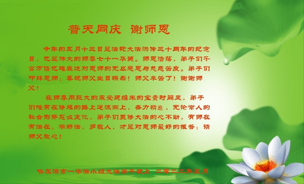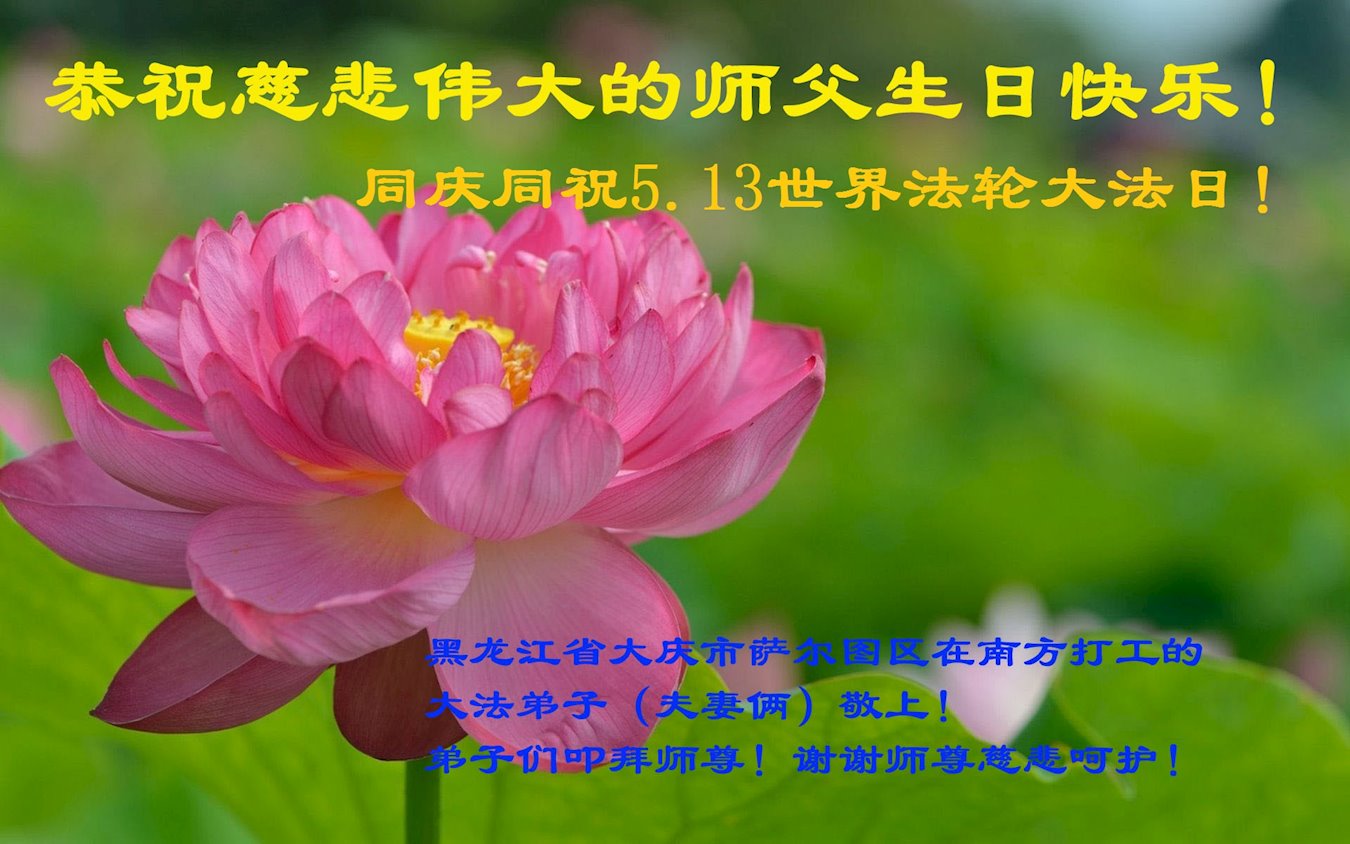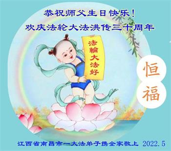 我是一个大法弟子的家人,妻子修大法,我也是个受益人,多次得到大法师父的救度,恭祝大法洪传三十周年!恭祝师父生日快乐!谢谢师父!谢谢大法!
