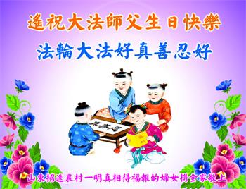 河北省平山县百姓在寄给大法师父的贺信中写道:我们见证了您的弟子们让家人和亲人们之间关系溶洽、和谐,关键就在于他们所信奉的“真善忍”有着巨大的善化人心的作用。“真善忍”不仅改变了他们,让我们身边的人看到了大法的美好,同时也改变了我们。