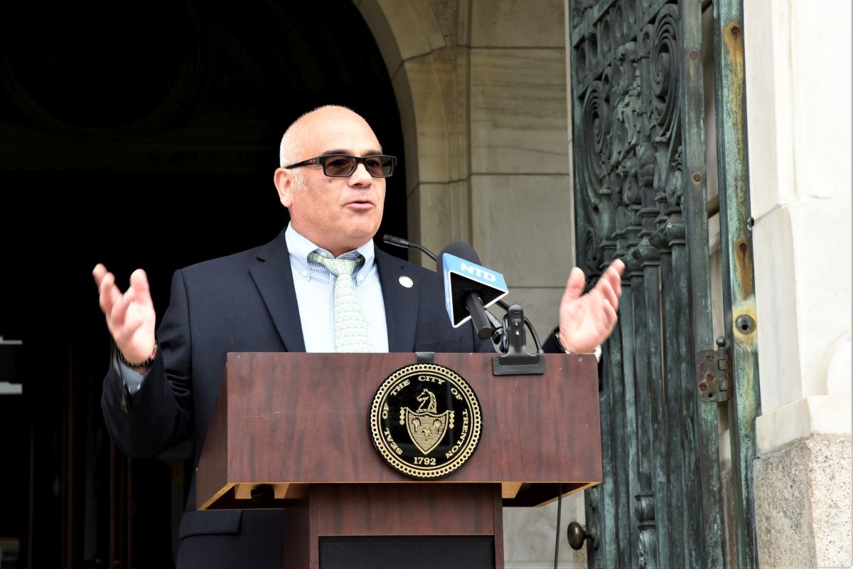 ![]() 照2:新泽西州首府春顿市长古斯乔拉在升旗仪式上致辞,宣读褒奖。 |