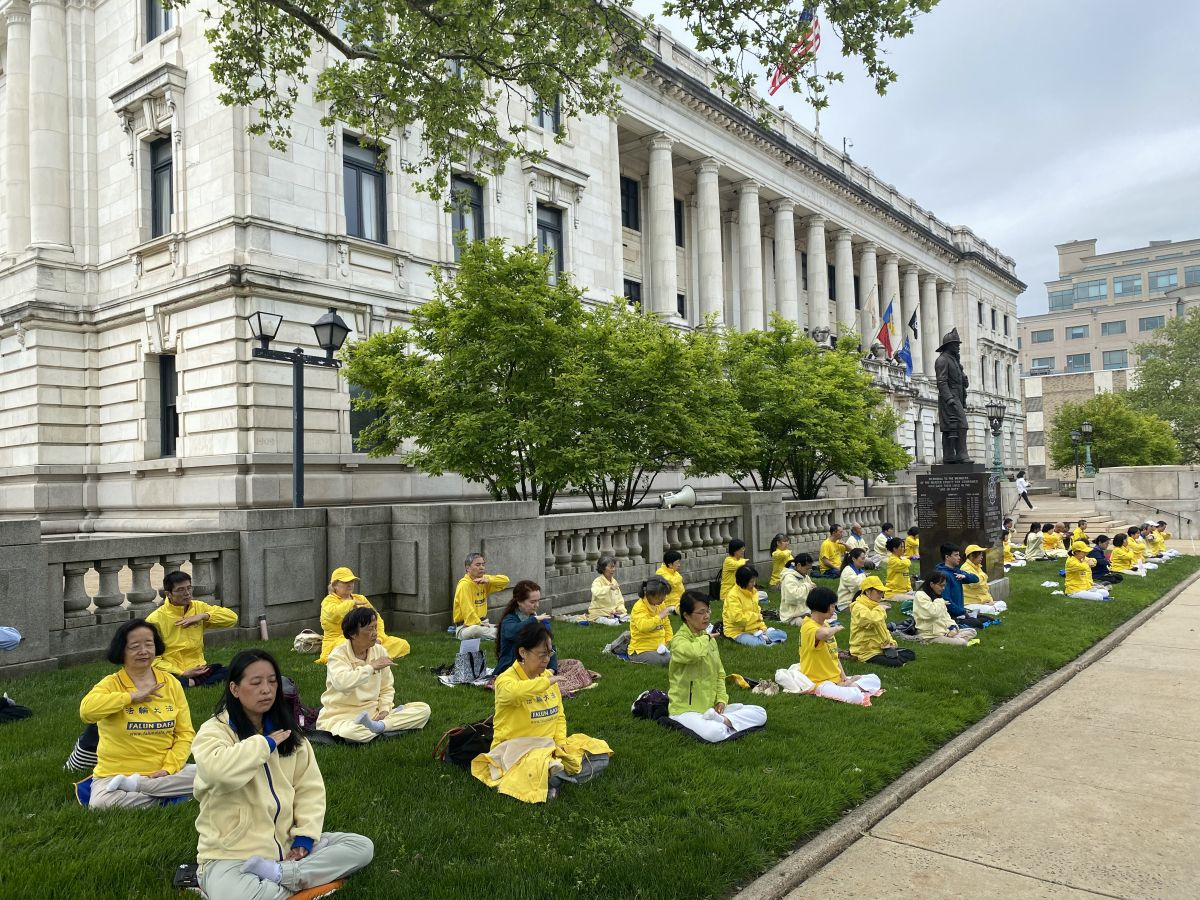 ![]() 照9:新泽西州法轮功学员在首府春顿市市政大楼前集体炼功 |