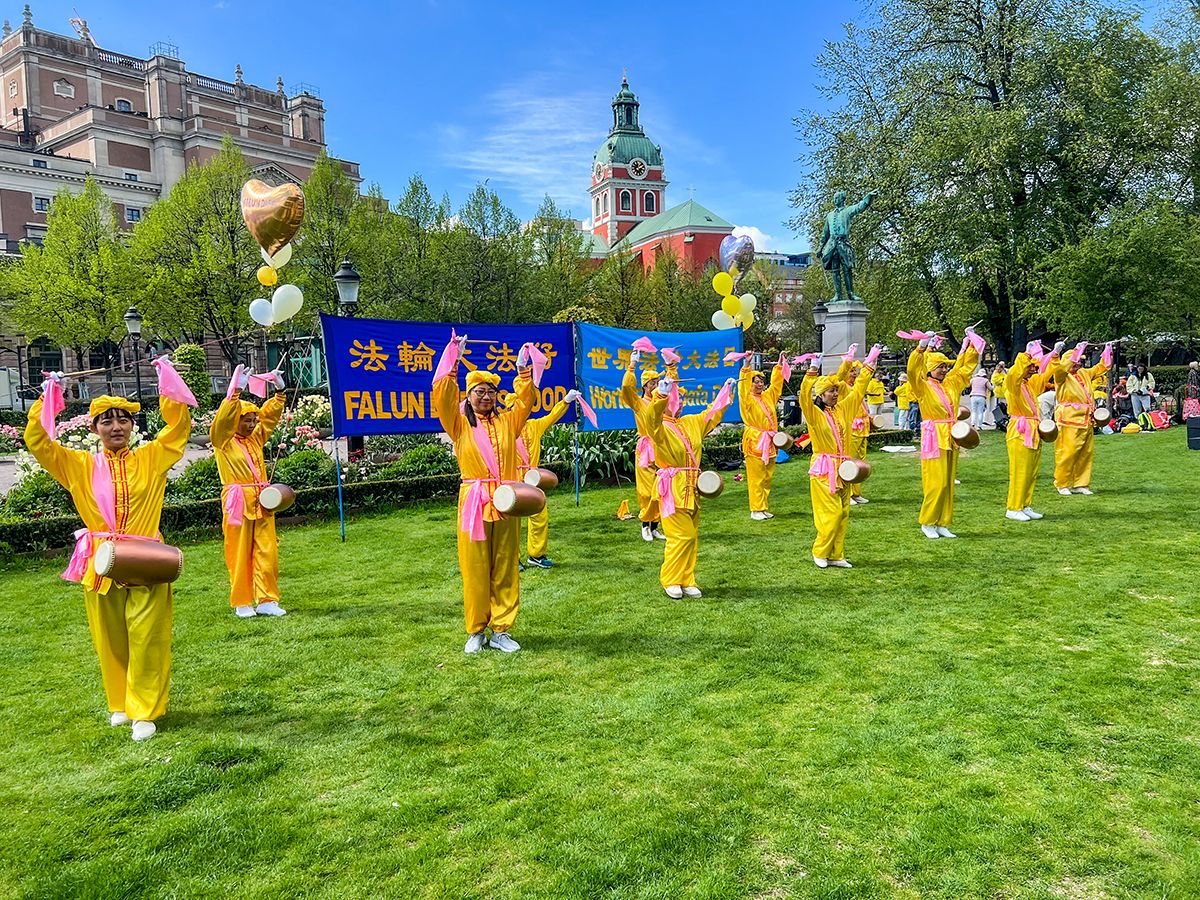 活动现场中西方学员通过扬声器向过往民众介绍法轮功(又称法轮大法)是以宇宙特性真善忍为原则,源于中国古老传统的修炼功法,洪传于世三十年,使亿万人道德回升,身心受益。同时还与民众分享了大法洪传瑞典二十七周年的感恩与喜悦。