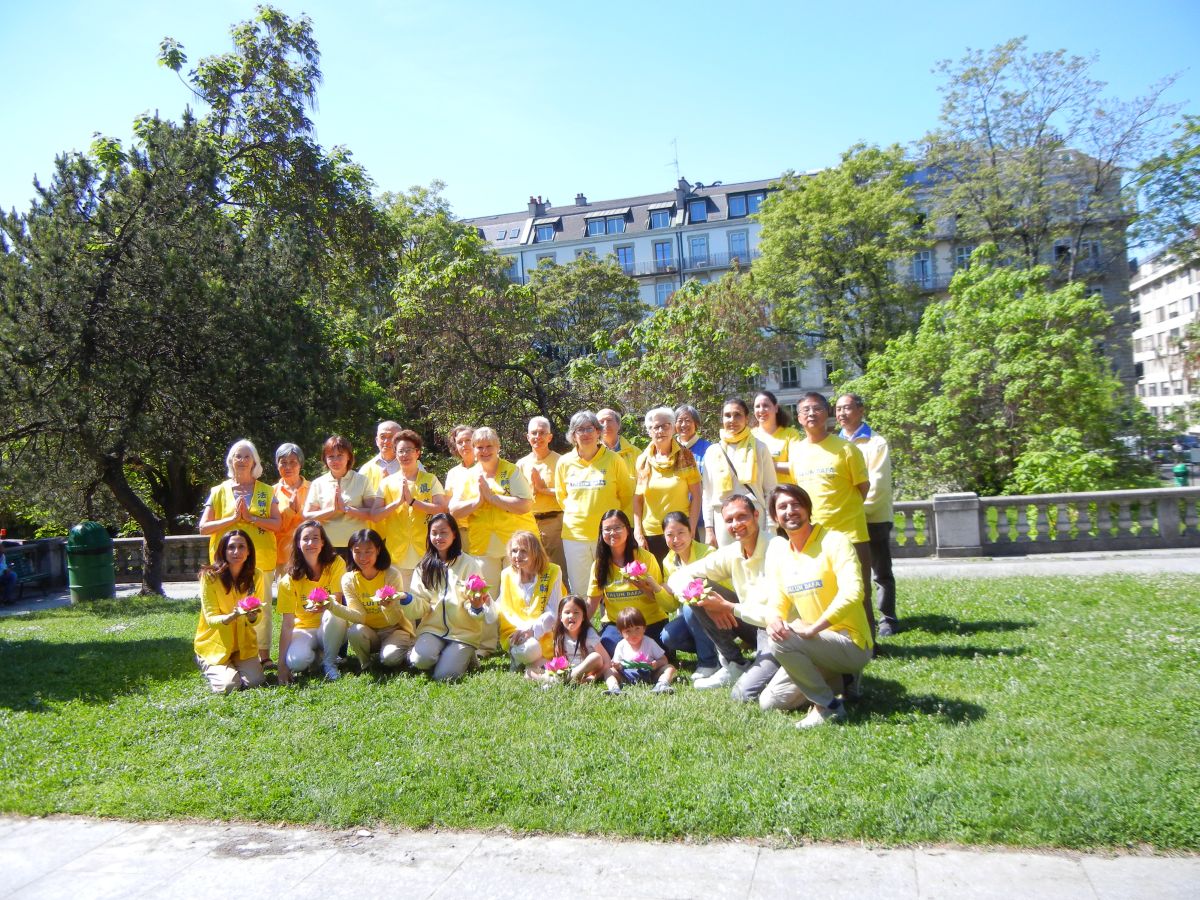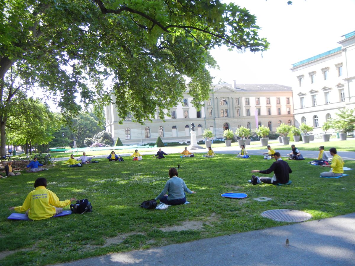 ![]() 图1:二零二二年五月十四日,瑞士法语区的部分法轮功学员在日内瓦的公园展示法轮功功法。 |