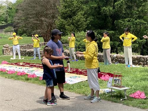活动中有不少民众驻足了解法轮大法,并很感兴趣地也想学炼法轮功。