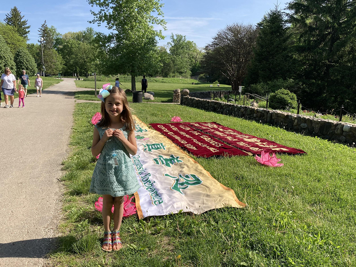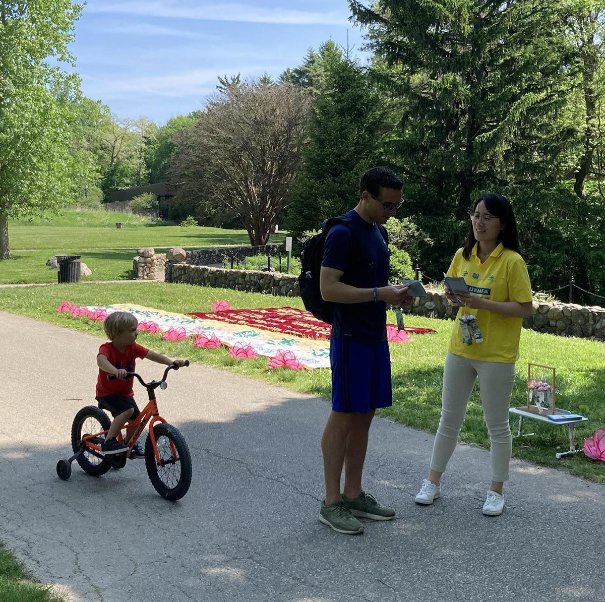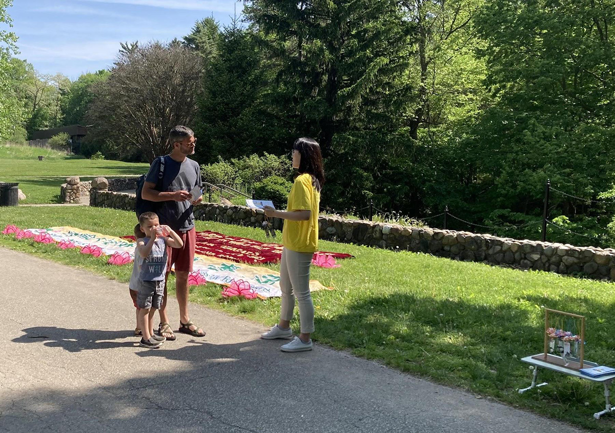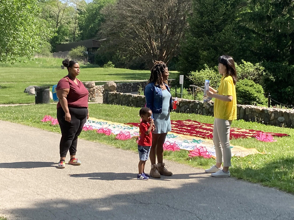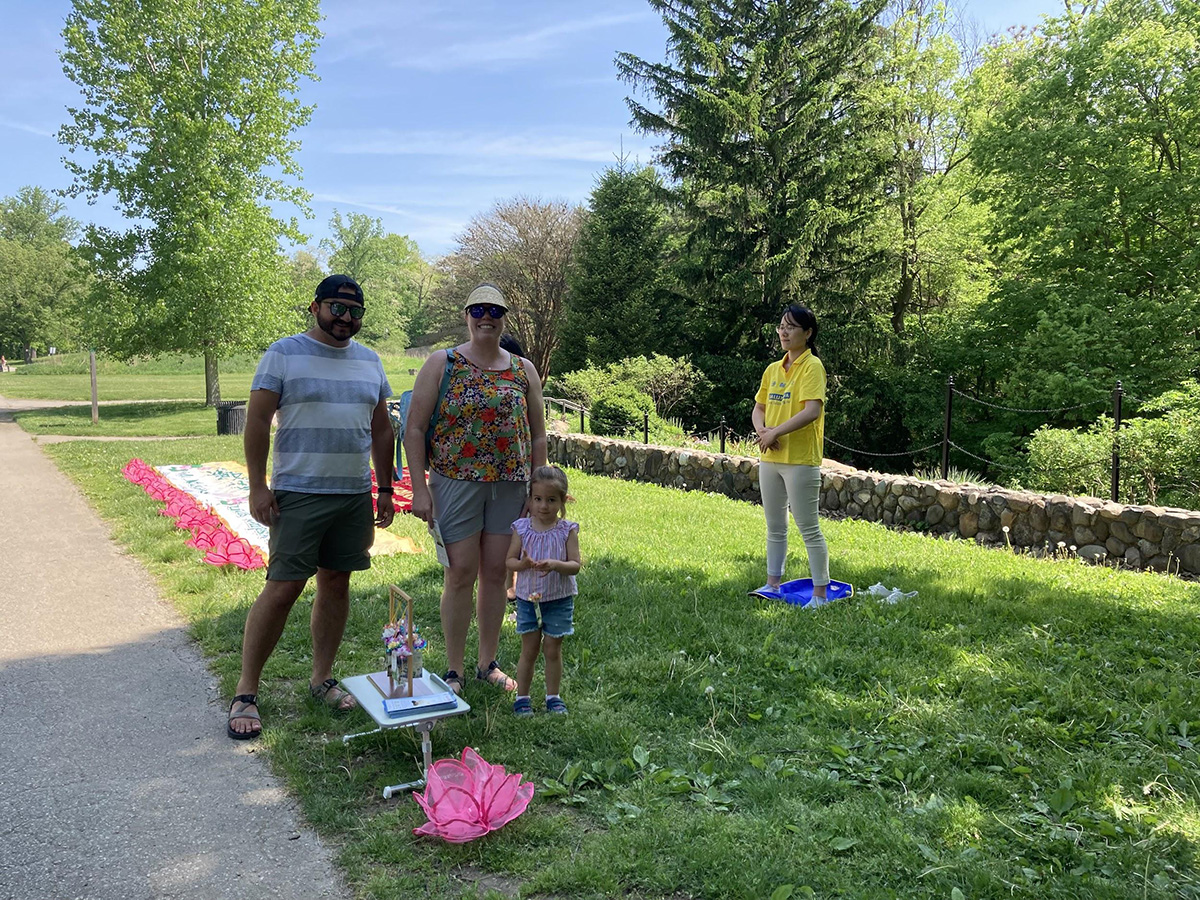 小女孩艾米丽(Emily)和父母行经学员的活动点,学员向她父母介绍法轮大法真相。临走的时候,艾米丽很开心地得到了一朵小莲花。