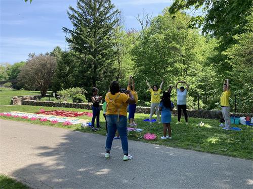 庆祝活动始于集体炼功,优美的炼功音乐和舒缓的功法吸引在公园散步的行人驻足欣赏。还有感兴趣的行人当下就想学习炼功动作,并询问平时是否有固定的炼功时间和地点可以来参加。