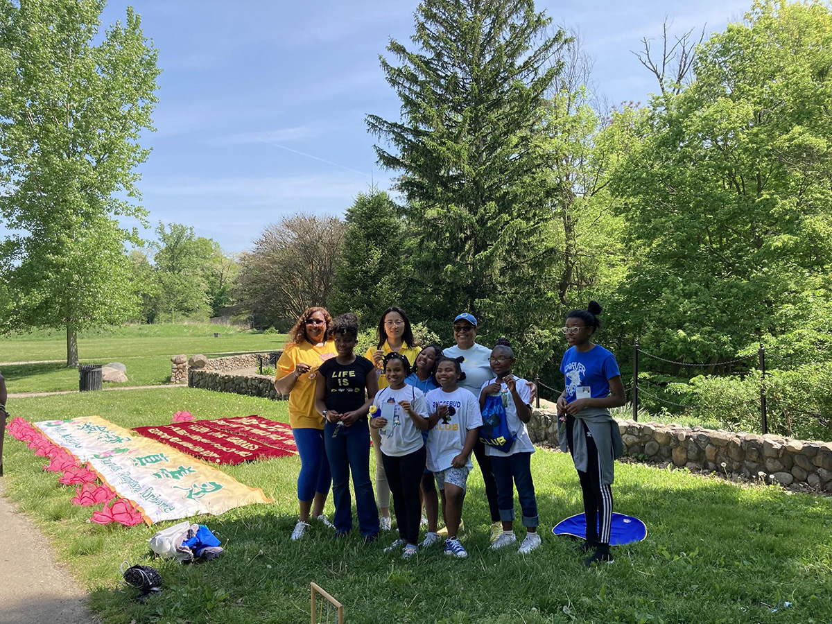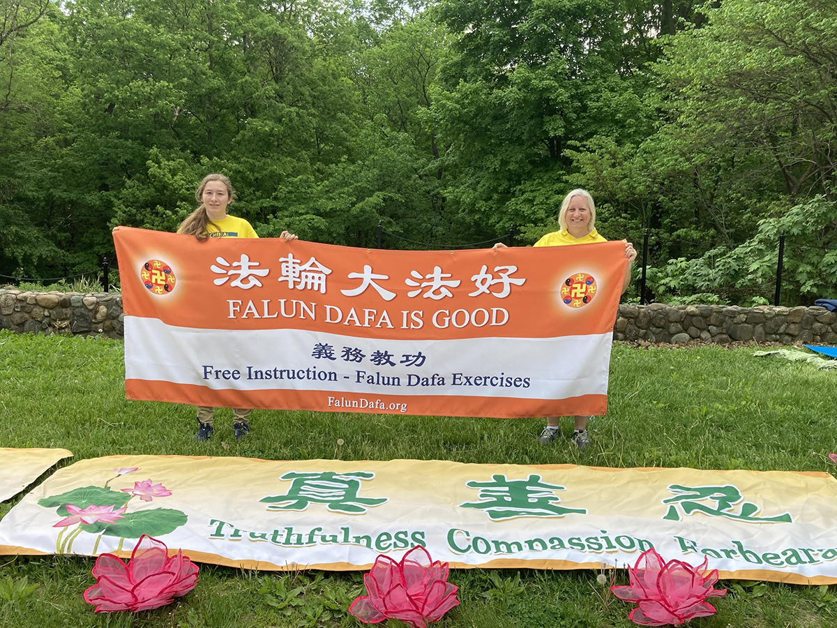 来自印州南部埃文斯维尔市的法轮功学员劳拉(Laura)带着她的女儿萨拉(Sarah),驱车三小时赶来庆祝法轮大法日;她表示要把“法轮大法好”的横幅带回埃文斯维尔,让那里更多人了解法轮大法。