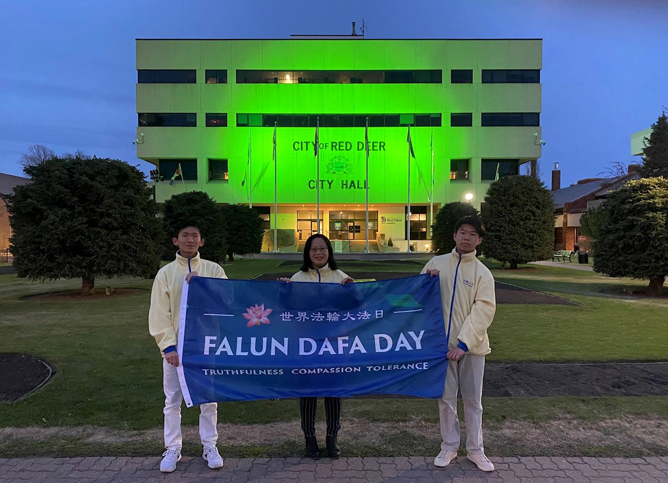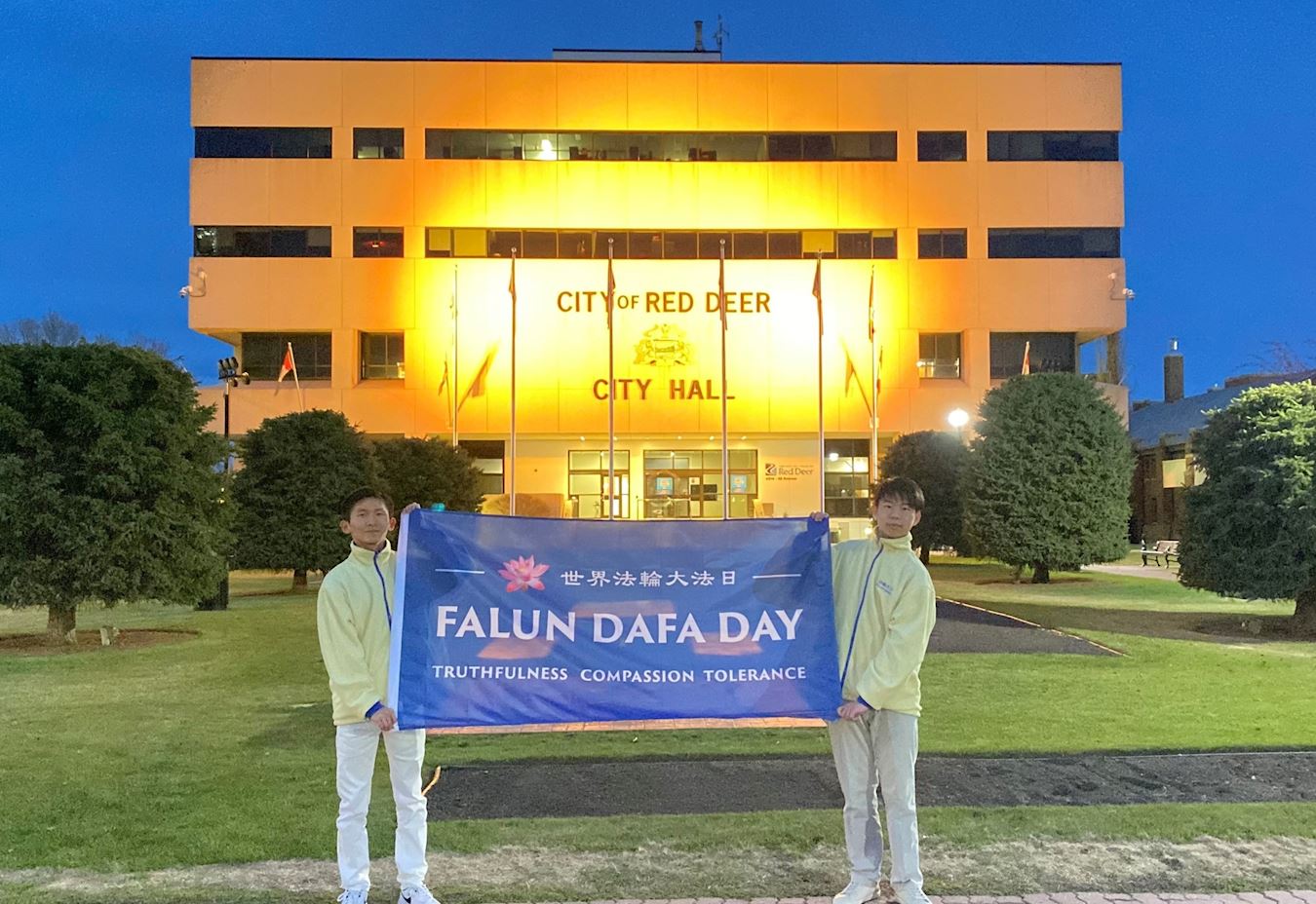 五月十三日晚,卡尔加里和红鹿市部份法轮功学员在红鹿市政厅外展开“世界法轮大法日”和“法轮大法好”横幅。横幅与市政厅的七彩灯光相互映衬,锦绣壮丽。