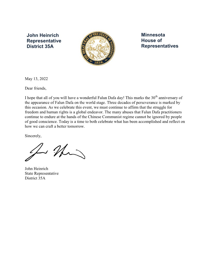 ![]() 图2:美国明尼苏达州第35A区州众议员约翰·海因里希的贺信 |