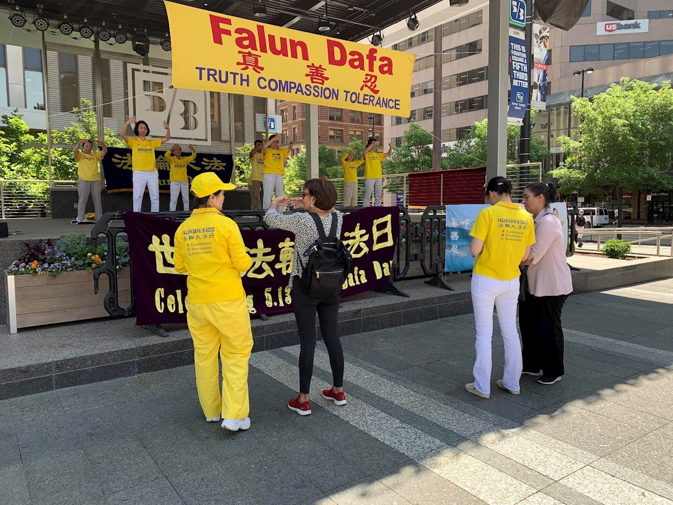 在场的人们都感到祥和的气氛。一位由四位亲友陪同庆祝生日的女士说,非常高兴能在此时来到喷泉广场得知法轮功,还表示要进一步了解法轮大法。