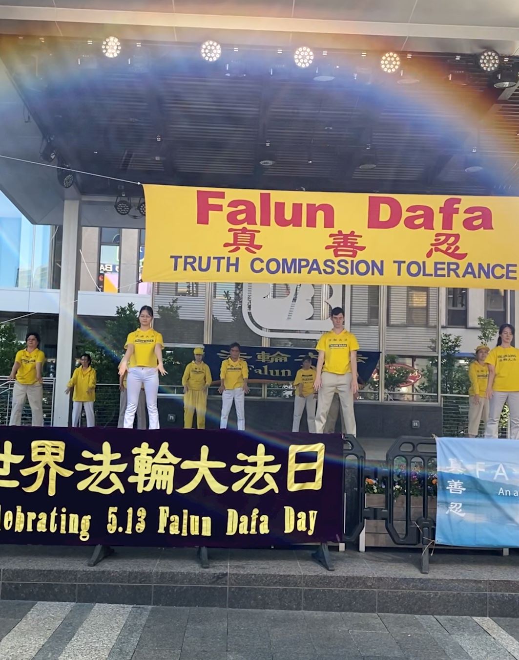 当庆祝活动结束时,一位在广场穿制服的巡逻的保安人员,找到学员说我一直在观察你们所做的一切,非常认同你们展现的祥和的气氛及法轮功的理念。他表示,你们也许没有察觉你们在无言中正在改变周围环境,影响周围的人们。他感受到法轮功展现的是古老的智慧,西方的文明相比之下还是一个年轻的文化。最后他说他会和太太一起参加我们每周在公园的炼功。