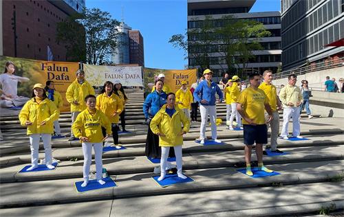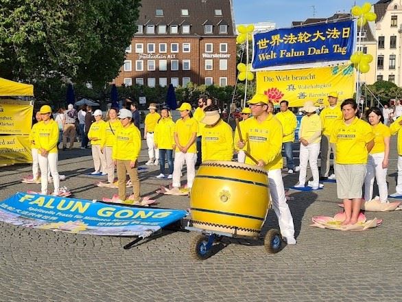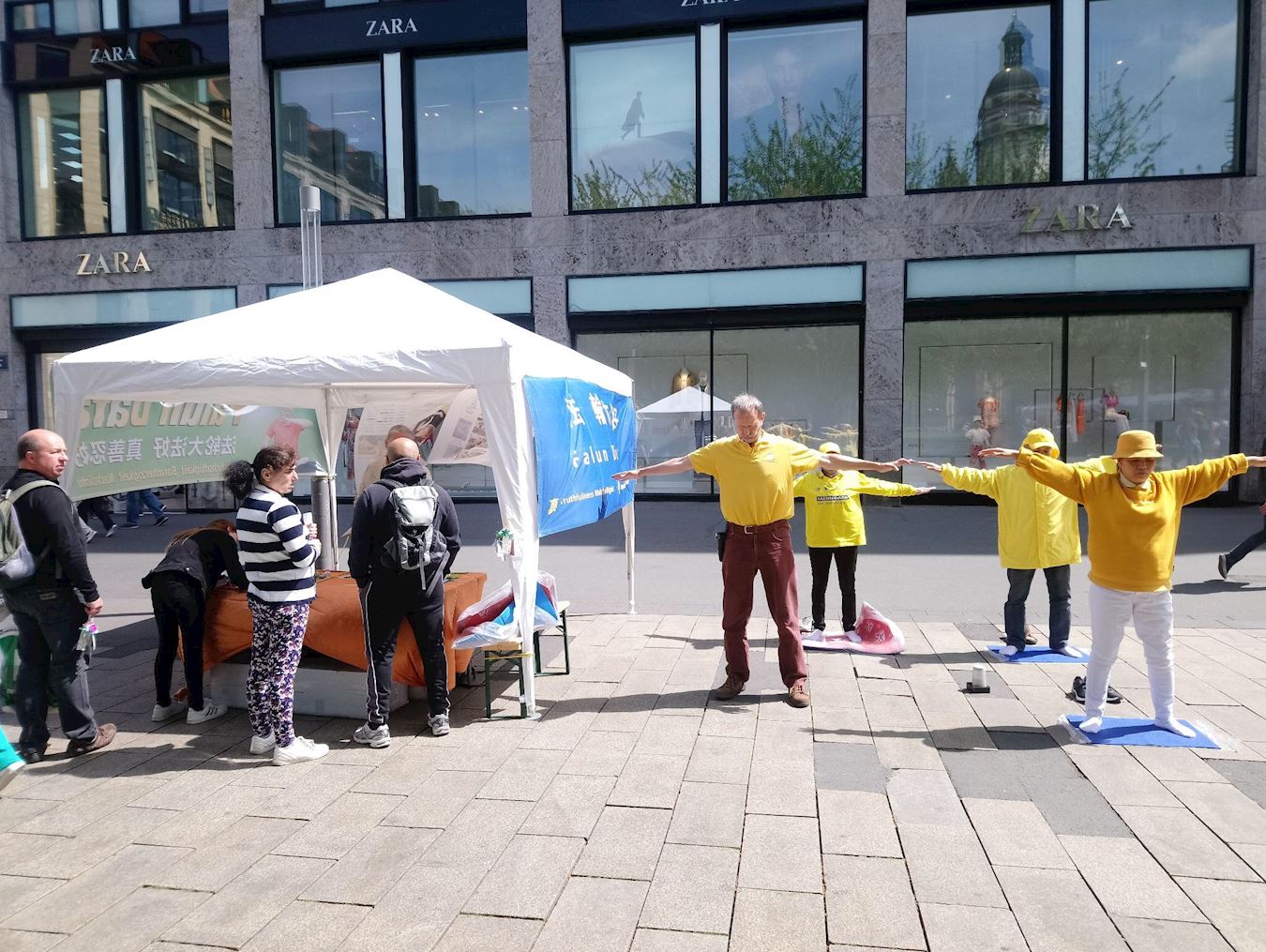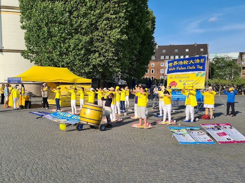 在五月十三日世界法轮大法日这天,法轮功学员相聚在杜塞尔多夫市中心一起庆祝大法弘传三十周年。路人看到五套功法演示的同时,还可以听到一位学员在现场用扩音器对功法动作的讲解,及知晓大法的美好。