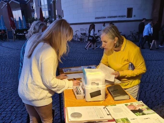 五月十三日和十四日,学员们在瑞圣丹桥(Reesendamm Bruecke)举办信息日。当地法轮功学员西尔维娅(Silvia)介绍说:“这座桥位于汉堡市中心,连接着两个重要购物区。我们每周五下午都会在这里举办信息日,因为很多人下班后想去市中心购物都会经过瑞圣丹桥。汉堡著名的市政厅也在这附近,不少游客都会来这里。”活动当天,有不少游客为真相点拍照。