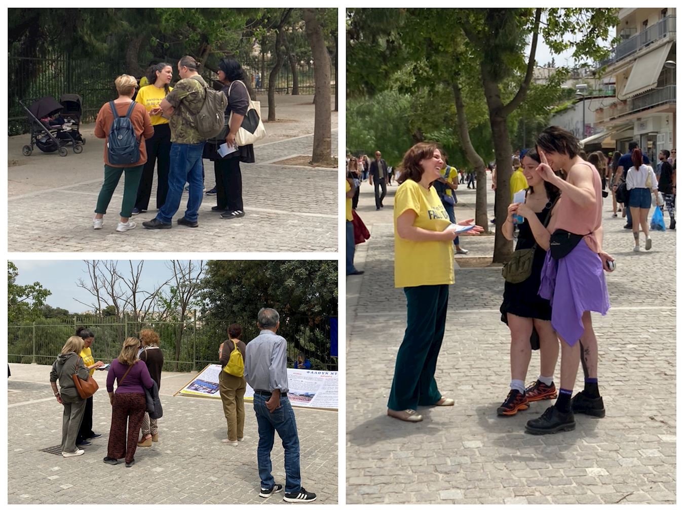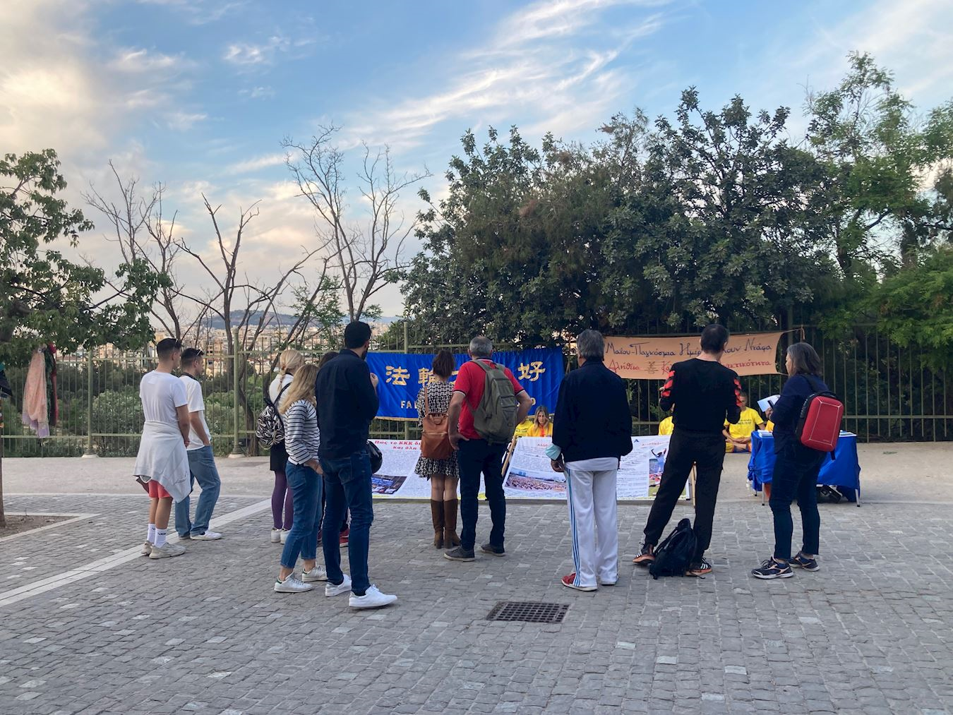 卫城是雅典最著名的景点,商业街上行人络绎不绝,熙熙攘攘。法轮功学员平静祥和的功法展示,形成了特别的风景,引起了行人的关注。有的人询问什么是法轮功,有的人问炼功点的信息,还有的人多拿一份传单带给亲友。