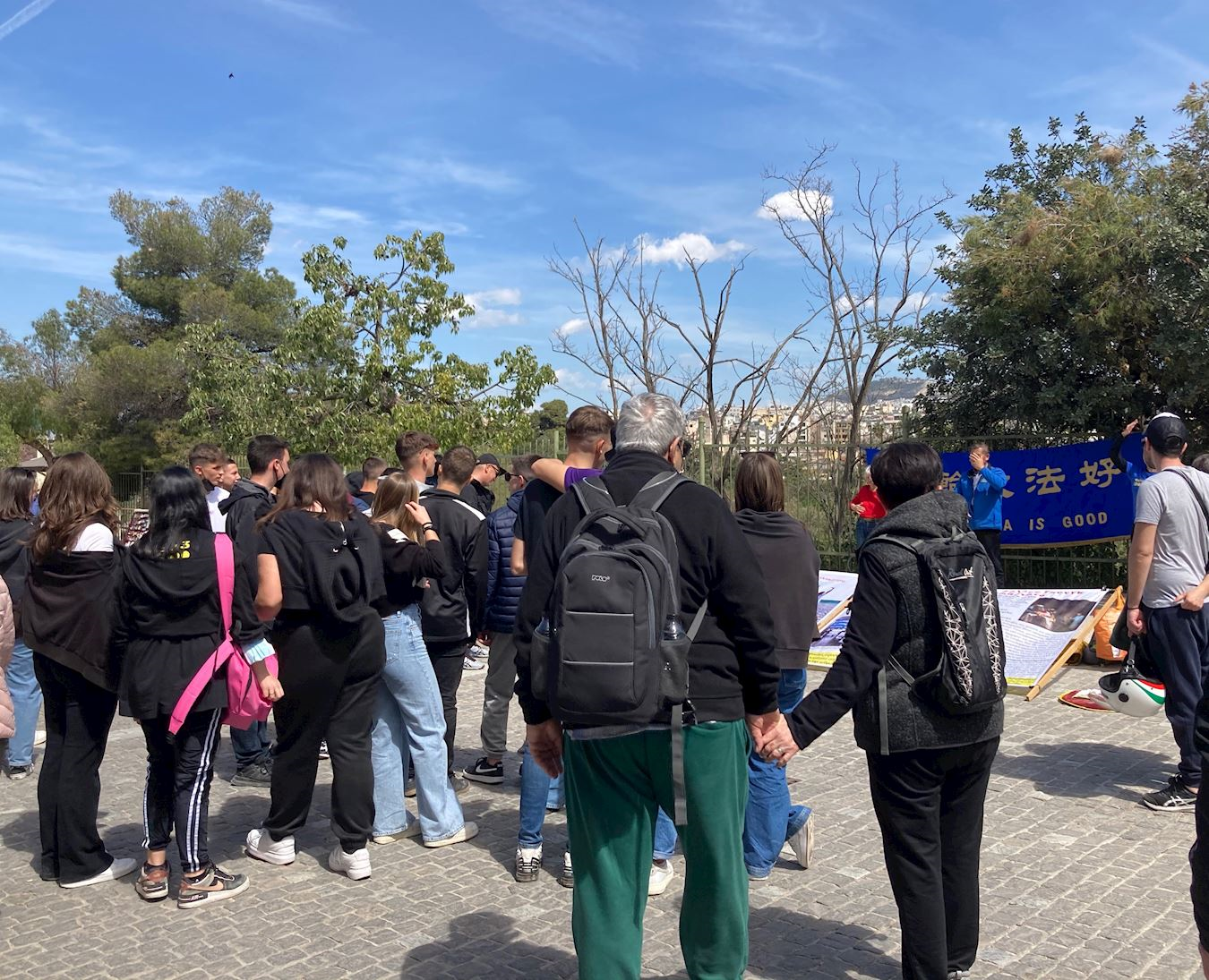 其中一位年轻人问:“你们在反对共产主义吗?”学员说,我们反对中国共产党对我们的迫害。他很震惊:“为什么迫害?你们如此平和。”学员回答,中共讲无神论,不允许人民信神。他立刻问:“为什么?因为……”还没说完,另一位年轻人说:“妒嫉。这是人性(中恶的一面)。所以我们要做到最好。”随后他指着正在炼功的学员说:“这很好,好好炼。”