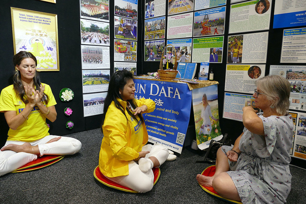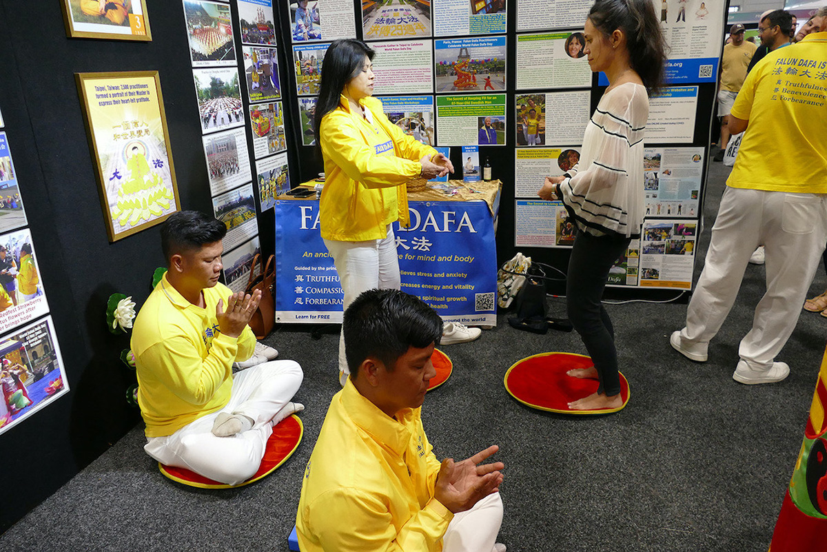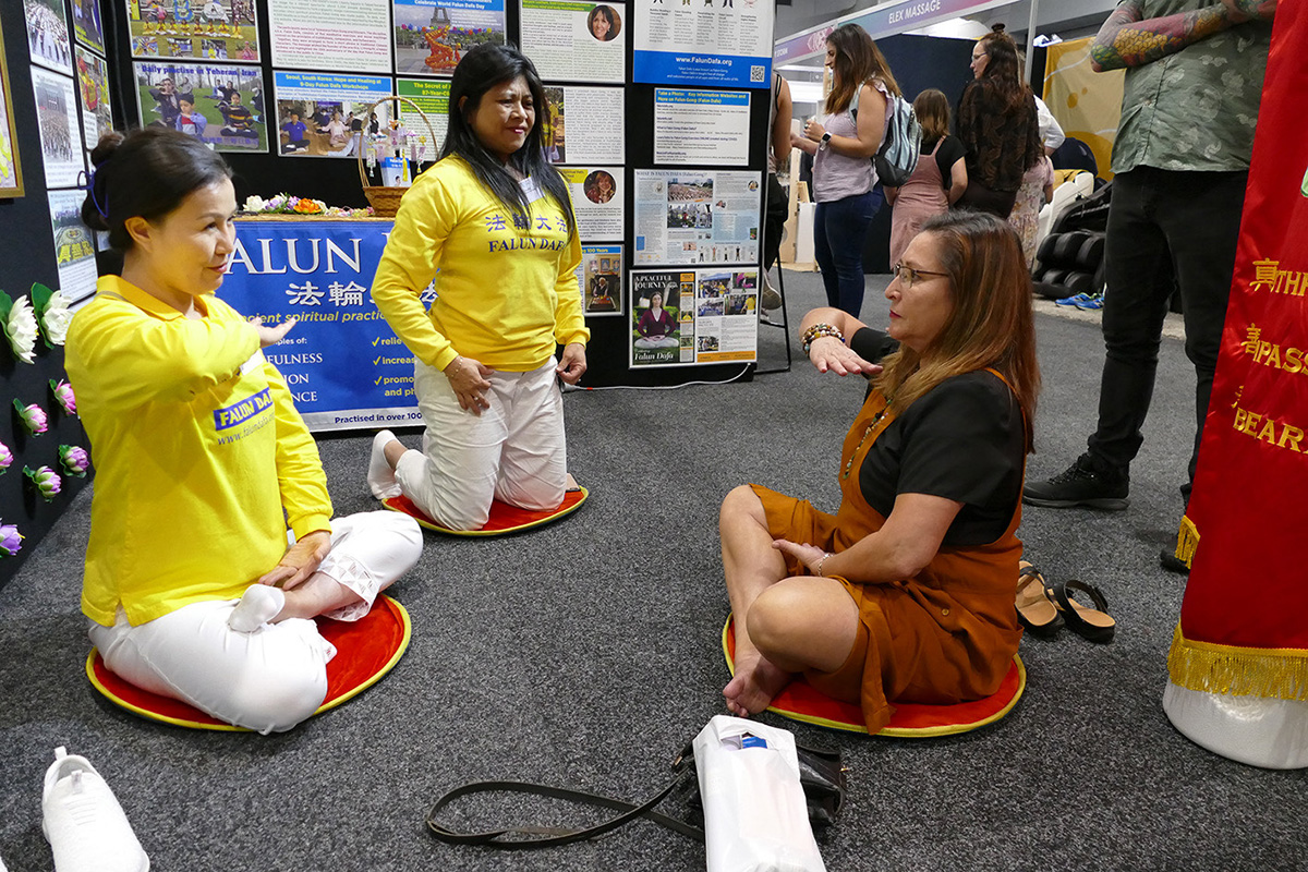 来到法轮功展位学炼功法的凯伦(Karen)很激动,她说,当她在学炼打坐时,感受到有能量在她体内流动。在进一步跟学员了解法轮功后,她表示想购买法轮功的书籍。
