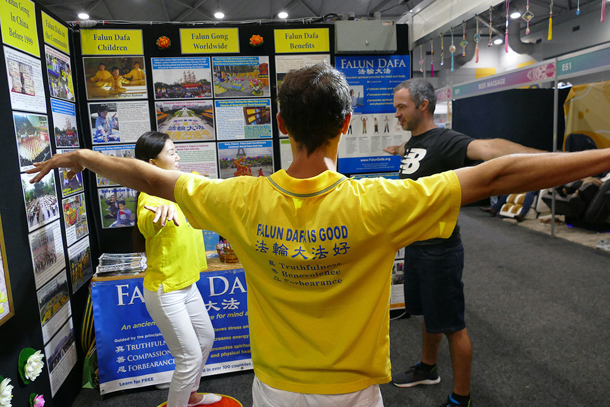 一位先生和他女儿在会展中心里也有一个展位。当他看到法轮功展位时被深深吸引,每天都来学炼功法。他说,在过去的许多年里,他尝试过很多不同的方法,以帮助他戒掉对安眠药的依赖,都难以成效。自健康博览会的第一天,他学炼了法轮功之后,就再没有出现过睡眠问题。在了解到更多修炼法轮功的益处后,他开始阅读法轮功书籍,体验到了法轮功的神奇。他激动的表示:“现在已经感觉到了法轮在转动!”