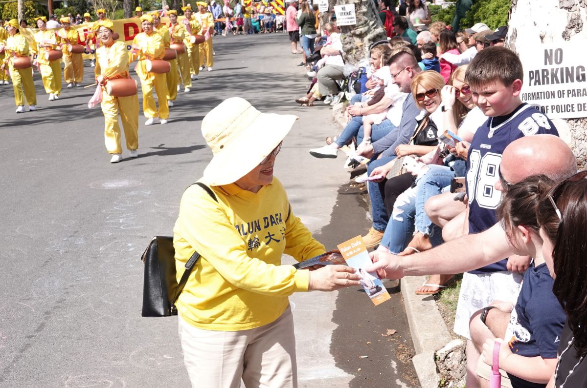 当法轮功游行队伍行進至主席台前,活动主办方向当地民众介绍说:“法轮大法是一种传统的修炼修行功法,以宇宙特性真善忍为原则,包含四套柔和的功法动作和打坐。经常修炼法轮大法的人发现,这一功法让他们获得身心健康,减轻压力和焦虑,获得能量,感到精力充沛,保持内心的宁静,提升道德。一九九二年,李洪志先生开始在中国公开传授法轮功。法轮功目前在全球七十多个国家都有人修炼,法轮功著作已被翻译成四十多种语言。”