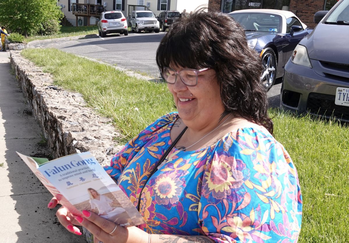 ![]() 图7:当法轮功学员的游行队伍离开了她的视线时,雷诺拉(Lenora Young)迫不及待地开始阅读法轮大法真相传单。 |