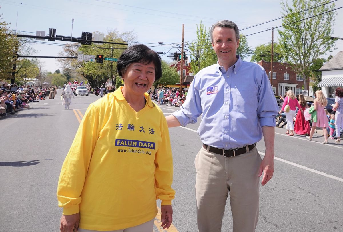 ![]() 图8:美国国会众议员本·科林(Ben Cline)来到了游行现场,跟参加游行的法轮功学员合影。 |