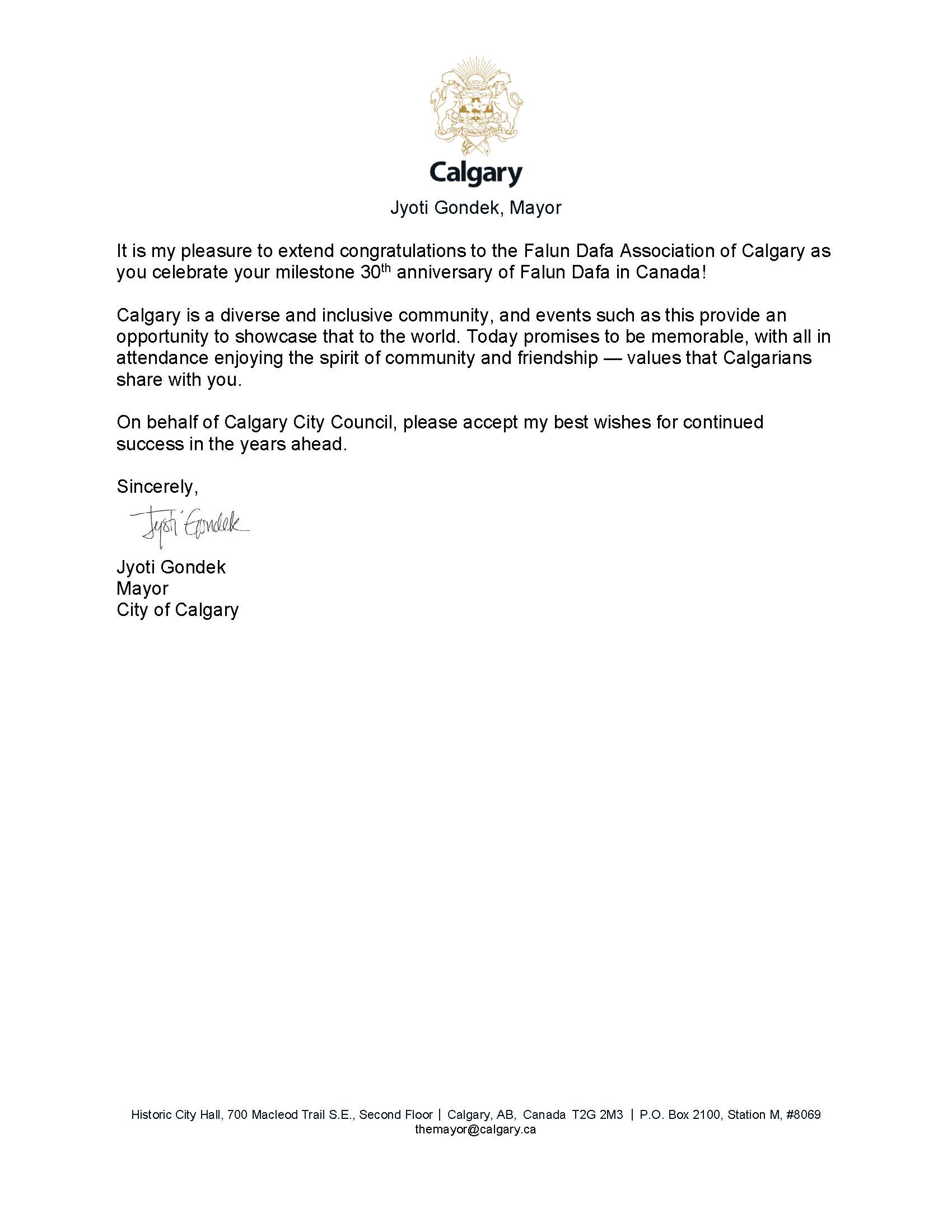 卡尔加里市长贡德克(Jyoti Gondek)在贺信中表示,在庆祝法轮大法弘传三十周年之际,“我荣幸地向卡尔加里法轮大法学会致以祝贺。”