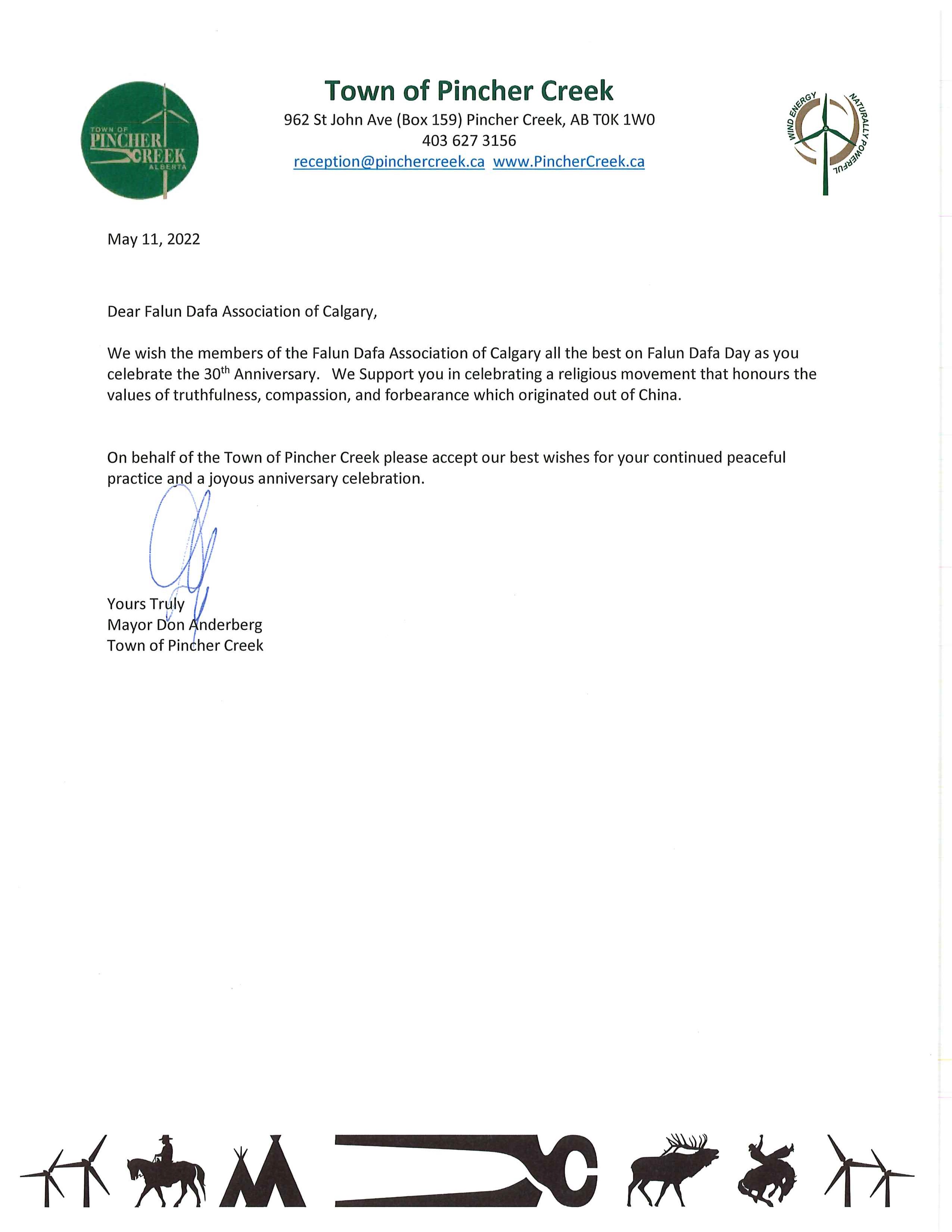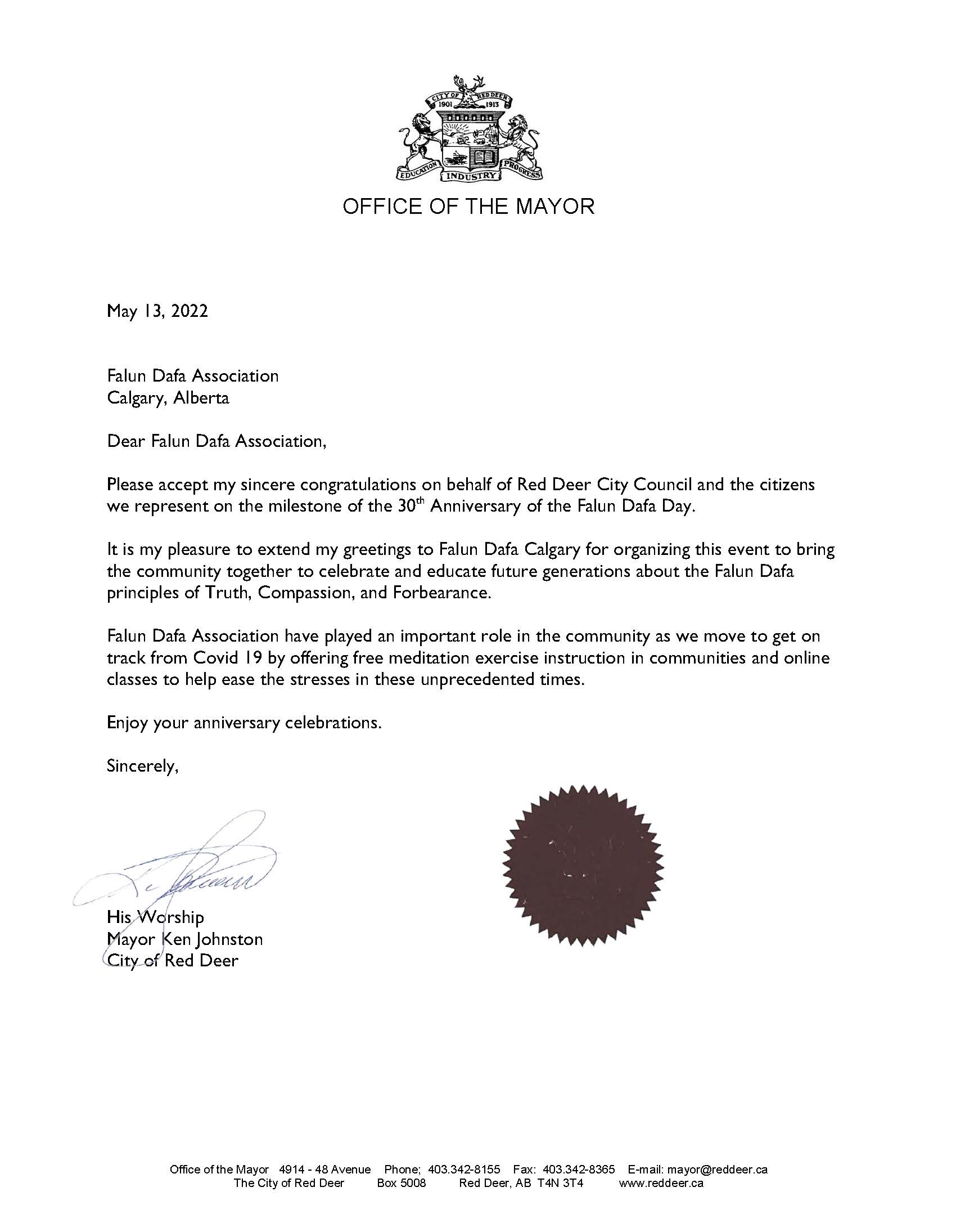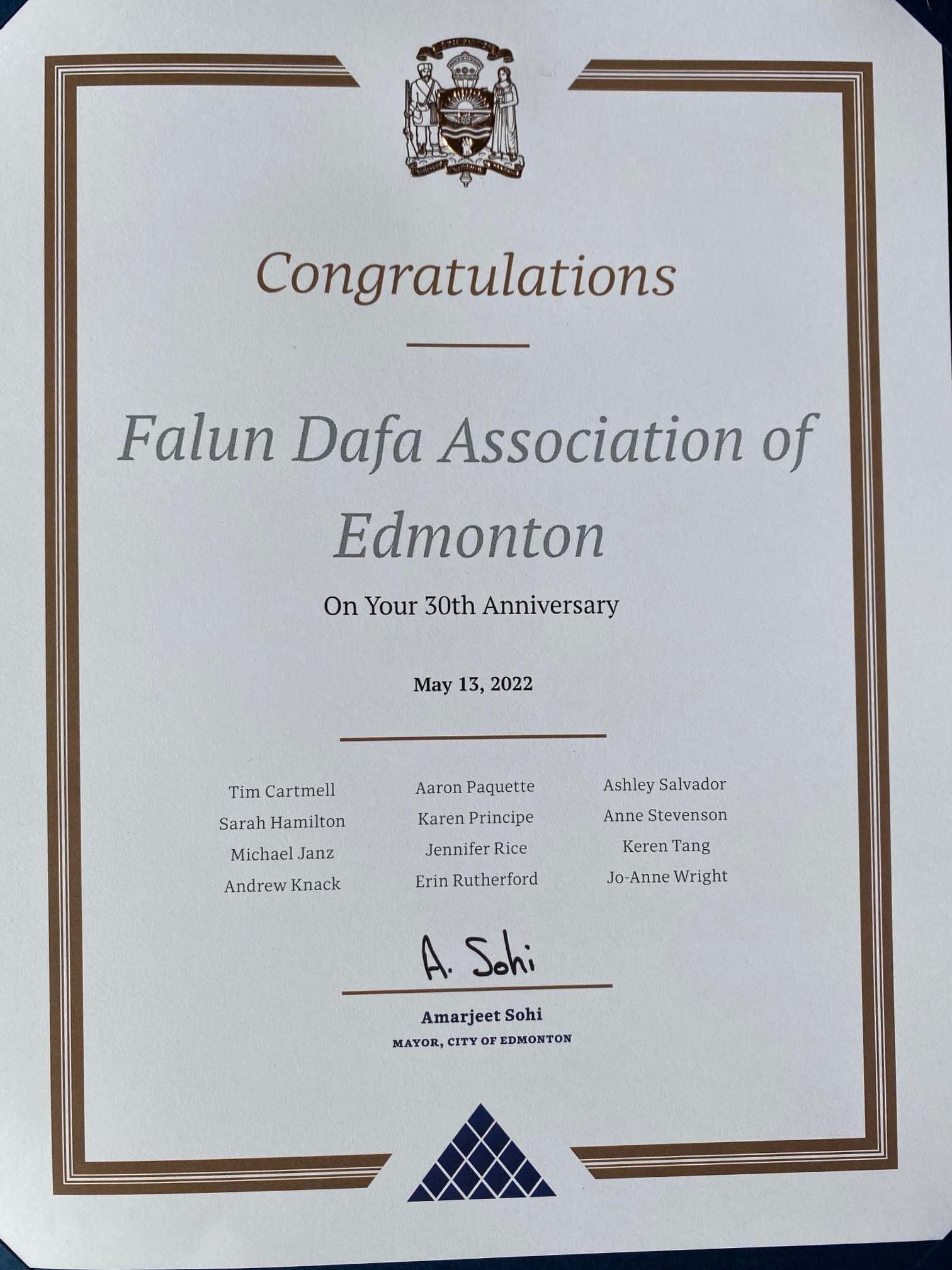 埃德蒙顿市长苏比(Amarjeet Sohi)发出了一张官方祝贺函,上书“祝贺二零二二年五月十三日法轮大法日三十周年”,全体十二位市议员名列其上,苏比则代表市议会亲笔签名。