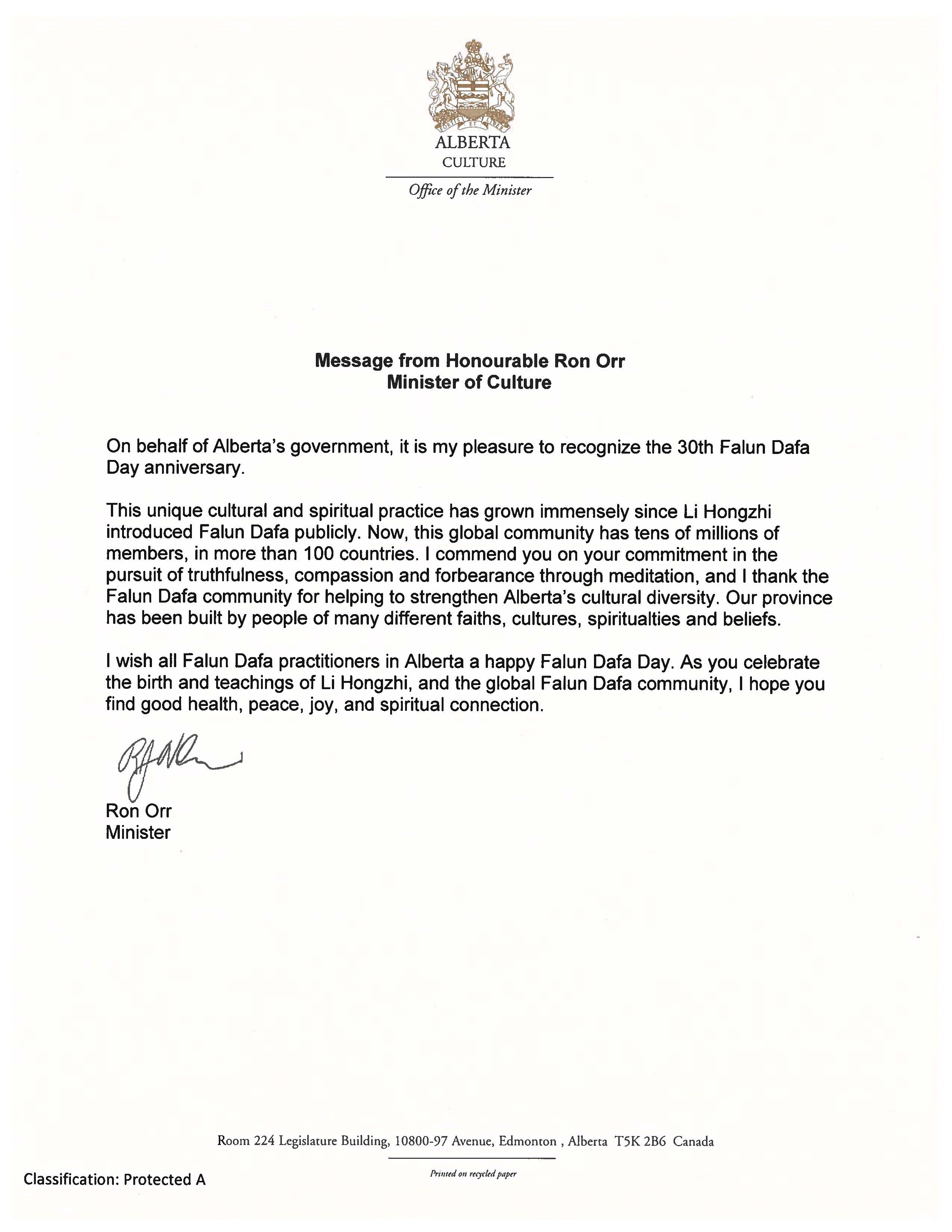 亚省文化厅长奥尔(Ron Orr)代表亚省政府褒奖第二十三个法轮大法日。