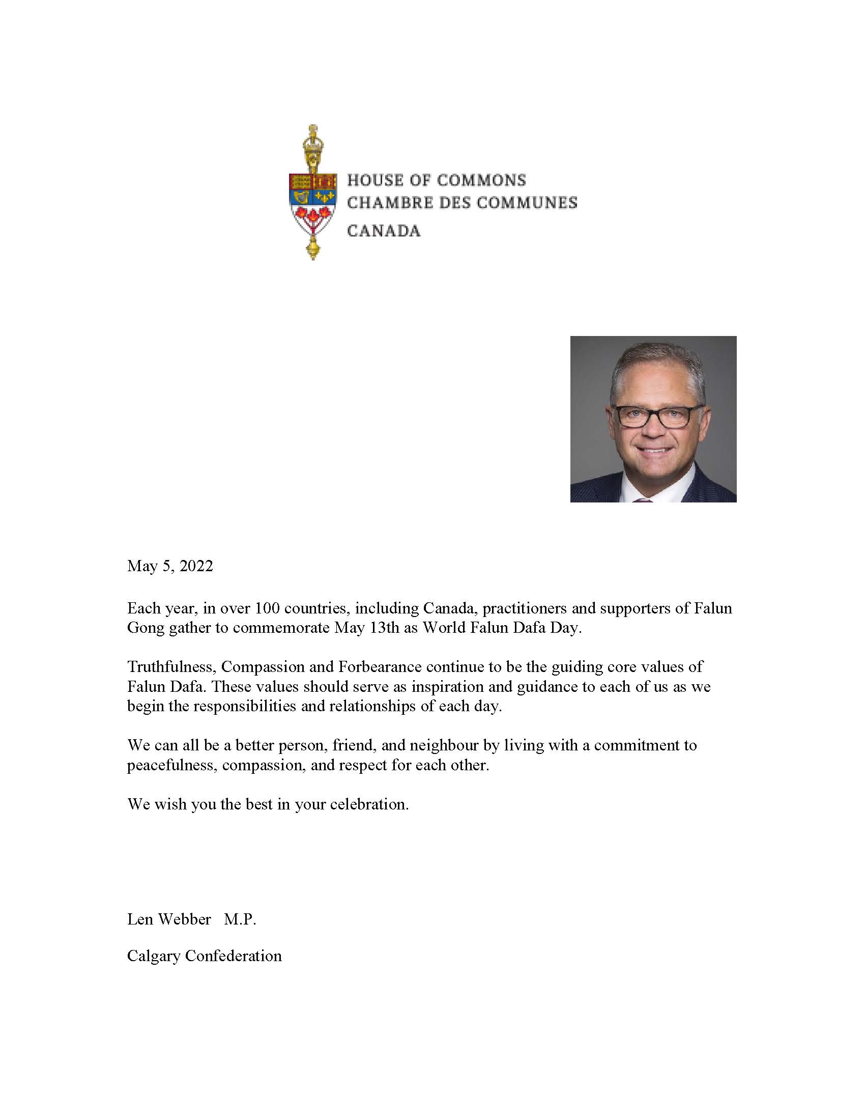 卡尔加里Confederation选区国会议员韦伯(Len Webber)说,每年的五月十三日,全世界一百多个国家和地区,包括加拿大的法轮功学员和支持者都集会庆祝世界法轮大法日。
