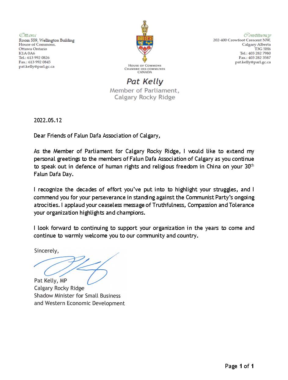 卡尔加里Rocky Ridge选区国会议员凯利(Pat Kelly)表示,在法轮大法弘传30周年之际,向法轮大法学员致以问候,“法轮功学员一如既往地为捍卫中国的人权和信仰自由发声,