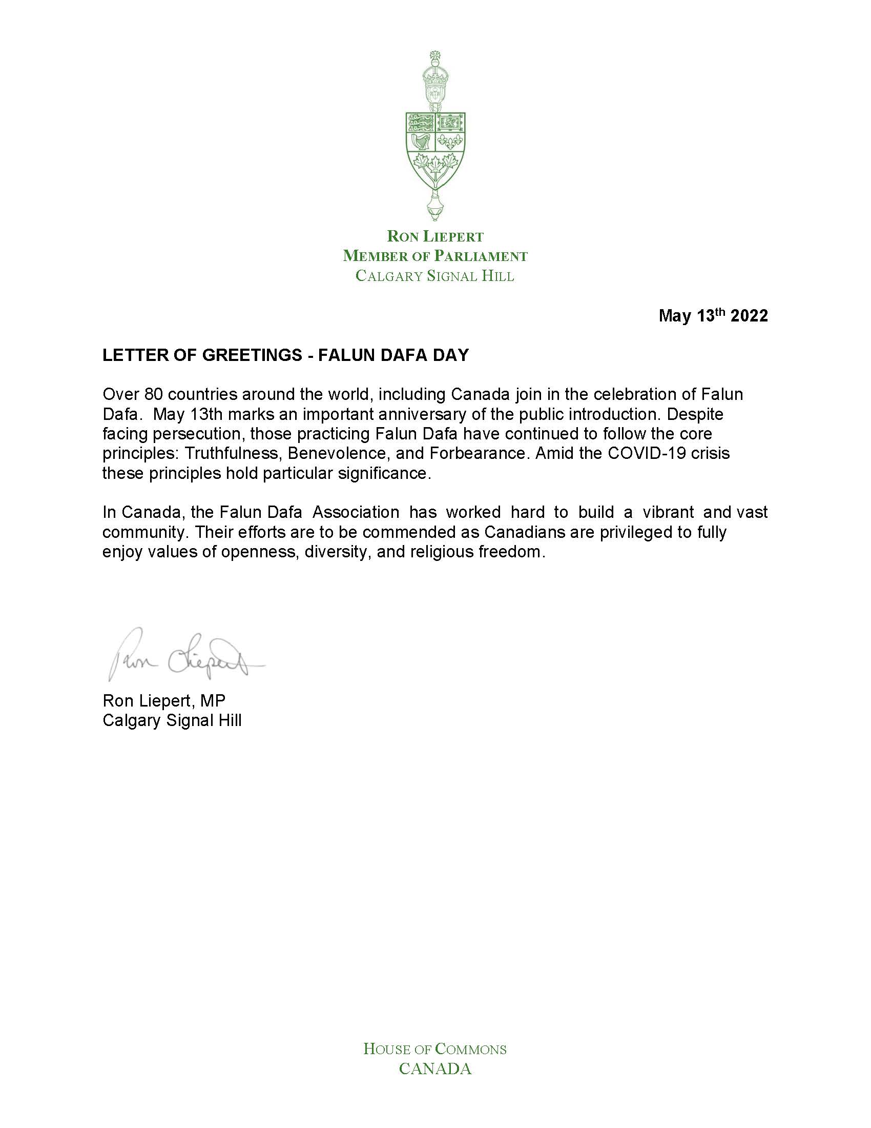 卡尔加里信号山选区国会议员利伯特(Ron Liepert)赞赏法轮大法的原则,“五月十三日是法轮大法传世的日子。尽管遭受迫害,法轮大法修炼者依然遵循真、善、忍的原则。在疫情中,这些原则尤为重要。在加拿大,法轮大法学会努力打造一个充满活力的社区。他们的努力在加拿大受到褒奖,因为加拿大人有幸充分享有坦诚、多元和信仰自由的价值观。”