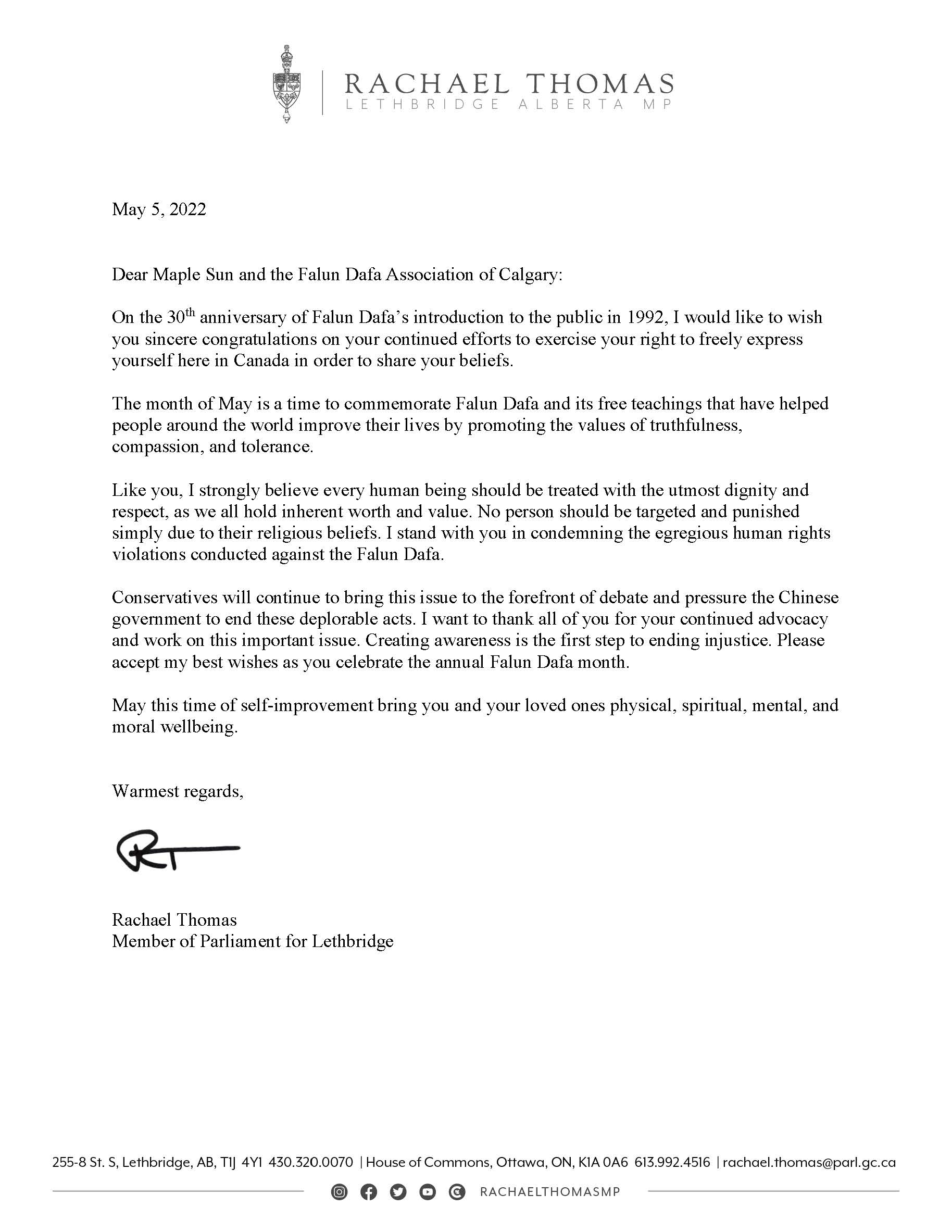 莱斯布里奇国会议员托马斯(Rachael Thomas)向法轮功学员表示祝贺,“法轮大法自一九九二年传出至今三十周年之际,你们一如既往在加拿大分享你们的信仰、实践自由表达的权利,为此我向你们致以诚挚的祝贺。”